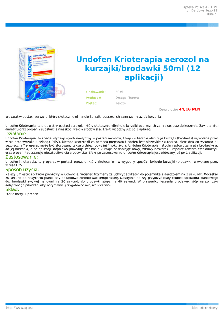 Apteka Polska APTE.PL ul. Derdowskiego 21 Rumia Undofen Krioterapia aerozol na kurzajki/brodawki 50ml (12 aplikacji) Opakowanie: 50ml Producent: Omega Pharma Postać: aerozol Cena brutto: 44,16 PLN preparat w postaci aerozolu, który skutecznie eliminuje kurzajki poprzez ich zamrażanie aż do korzenia Undofen Krioterapia, to preparat w postaci aerozolu, który skutecznie eliminuje kurzajki poprzez ich zamrażanie aż do korzenia. Zawiera eter dimetylu oraz propan ? substancje nieszkodliwe dla środowiska. Efekt widoczny już po 1 aplikacji. Działanie: Undofen Krioterapia, to specjalistyczny wyrób medyczny w postaci aerozolu, który skutecznie eliminuje kurzajki (brodawki) wywołane przez wirus brodawczaka ludzkiego (HPV). Metoda krioterapii za pomocą preparatu Undofen jest niezwykle skuteczna, nietrudna do wykonania i bezpieczna ? preparat może być stosowany także u dzieci powyżej 4 roku życia. Undofen Krioterapia natychmiastowo zamraża brodawkę aż do jej korzenia, a po aplikacji stopniowo powoduje zanikanie kurzajki odsłaniając nowy, zdrowy naskórek. Preparat zawiera eter dimetylu oraz propan ? substancje nieszkodliwe dla środowiska. Efekt po zastosowaniu Undofen Krioterapia jest widoczny już po 1 aplikacji. Zastosowanie: Undofen Krioterapia, to preparat w postaci aerozolu, który skutecznie i w wygodny sposób likwiduje kurzajki (brodawki) wywołane przez wirusa HPV. Sposób użycia: Należy umieścić aplikator piankowy w uchwycie. Wcisnąć trzymany za uchwyt aplikator do pojemnika z aerozolem na 3 sekundy. Odczekać 20 sekund po nasyceniu pianki aby dodatkowo zredukować temperaturę. Następnie należy przyłożyć biały czubek aplikatora piankowego do: brodawki zwykłej na dłoni na 20 sekund, do brodawki stopy na 40 sekund. W przypadku leczenia brodawek stóp należy użyć dołączonego pilniczka, aby optymalnie przygotować miejsce leczenia. Skład: Eter dimetylu, propan http://www.apte.pl sklep internetowy