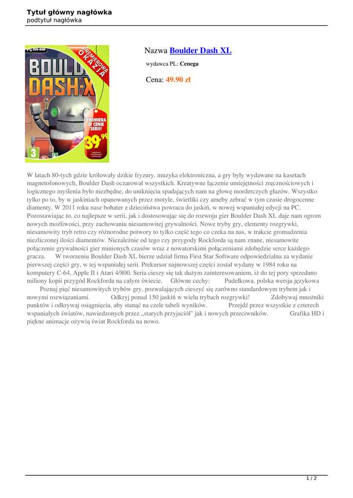 Tytuł główny nagłówka podtytuł nagłówka Nazwa Boulder Dash XL wydawca PL: Cenega Cena: 49.90 zł W latach 80-tych gdzie królowały dzikie fryzury, muzyka elektroniczna, a gry były wydawane na kasetach magnetofonowych, Boulder Dash oczarował wszystkich. Kreatywne łączenie umiejętności zręcznościowych i logicznego myślenia było niezbędne, do uniknięcia spadających nam na głowę morderczych głazów. Wszystko tylko po to, by w jaskiniach opanowanych przez motyle, świetliki czy ameby zebrać w tym czasie drogocenne diamenty. W 2011 roku nasz bohater z dzieciństwa powraca do jaskiń, w nowej wspaniałej edycji na PC. Pozostawiając to, co najlepsze w serii, jak i dostosowując się do rozwoju gier Boulder Dash XL daje nam ogrom nowych możliwości, przy zachowaniu niesamowitej grywalności. Nowe tryby gry, elementy rozgrywki, niesamowity tryb retro czy różnorodne potwory to tylko część tego co czeka na nas, w trakcie gromadzenia niezliczonej ilości diamentów. Niezależnie od tego czy przygody Rockforda są nam znane, niesamowite połączenie grywalności gier minionych czasów wraz z nowatorskimi połączeniami zdobędzie serce każdego gracza. W tworzeniu Boulder Dash XL bierze udział firma First Star Software odpowiedzialna za wydanie pierwszej części gry, w tej wspaniałej serii. Prekursor najnowszej części został wydany w 1984 roku na komputery C-64, Apple II i Atari 4/800. Seria cieszy się tak dużym zainteresowaniem, iż do tej pory sprzedano miliony kopii przygód Rockforda na całym świecie. Główne cechy: Pudełkowa, polska wersja językowa Poznaj pięć niesamowitych trybów gry, pozwalających cieszyć się zarówno standardowym trybem jak i nowymi rozwiązaniami. Odkryj ponad 150 jaskiń w wielu trybach rozgrywki! Zdobywaj mnożniki punktów i odkrywaj osiągnięcia, aby stanąć na czele tabeli wyników. Przejdź przez wszystkie z czterech wspaniałych światów, nawiedzonych przez „starych przyjaciół" jak i nowych przeciwników. Grafika HD i piękne animacje ożywią świat Rockforda na nowo. 1/2 Tytuł główny nagłówka podtytuł nagłówka Nazwa Wartość Wydawca PL Cenega Poland Data premiery 4 Listopada 2011 Producent Tryb gry Kategoria wiekowa Wersja językowa Format Catnip Games Single Player Bez ograniczeń PL / ENG 1xDVD 2/2