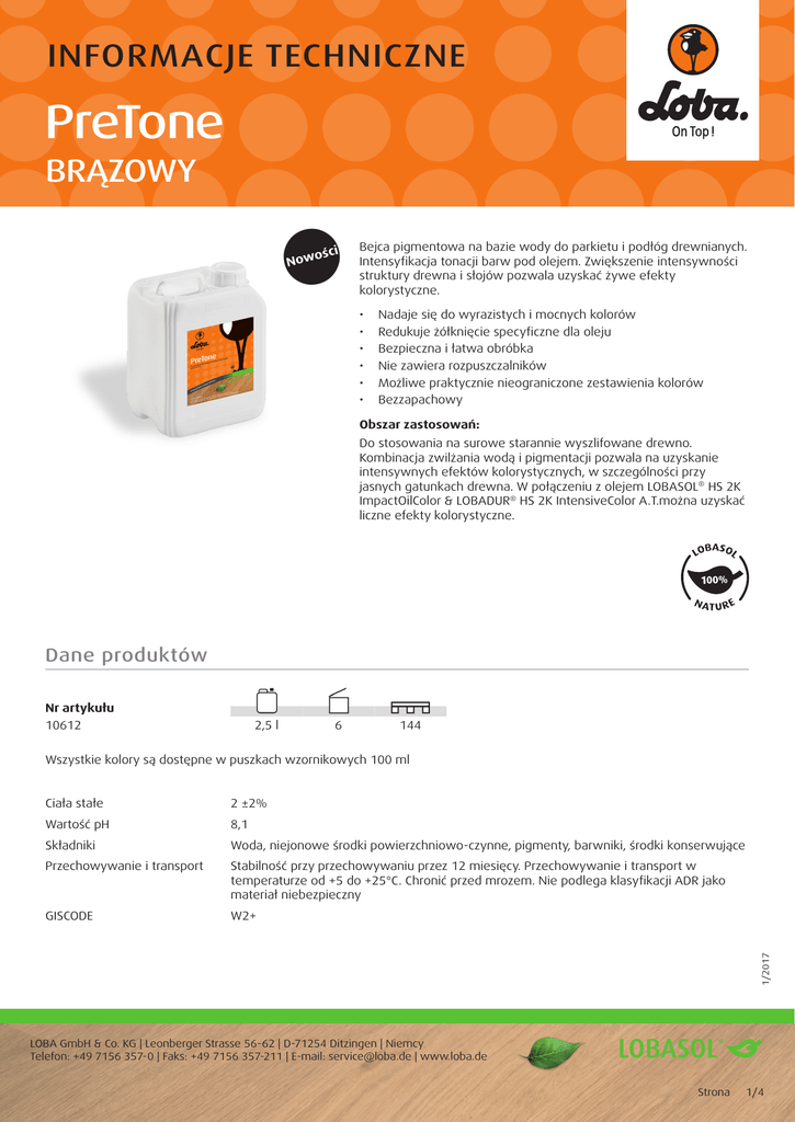 INFORMACJE TECHNICZNE PreTone BRĄZOWY ości Now Bejca pigmentowa na bazie wody do parkietu i podłóg drewnianych. Intensyfikacja tonacji barw pod olejem. Zwiększenie intensywności struktury drewna i słojów pozwala uzyskać żywe efekty kolorystyczne. • • • • • • adaje się do wyrazistych i mocnych kolorów N Redukuje żółknięcie specyficzne dla oleju Bezpieczna i łatwa obróbka Nie zawiera rozpuszczalników Możliwe praktycznie nieograniczone zestawienia kolorów Bezzapachowy Obszar zastosowań: Do stosowania na surowe starannie wyszlifowane drewno. Kombinacja zwilżania wodą i pigmentacji pozwala na uzyskanie intensywnych efektów kolorystycznych, w szczególności przy jasnych gatunkach drewna. W połączeniu z olejem LOBASOL® HS 2K ImpactOilColor & LOBADUR® HS 2K IntensiveColor A.T.można uzyskać liczne efekty kolorystyczne. Dane produktów Nr artykułu 10612 2,5 l 6 144 Wszystkie kolory są dostępne w puszkach wzornikowych 100 ml 2 ±2% Wartość pH 8,1 Składniki Woda, niejonowe środki powierzchniowo-czynne, pigmenty, barwniki, środki konserwujące Przechowywanie i transport Stabilność przy przechowywaniu przez 12 miesięcy. Przechowywanie i transport w temperaturze od +5 do +25°C. Chronić przed mrozem. Nie podlega klasyfikacji ADR jako materiał niebezpieczny GISCODE W2+ 1/2017 Ciała stałe LOBA GmbH & Co. KG | Leonberger Strasse 56-62 | D-71254 Ditzingen | Niemcy Telefon: +49 7156 357-0 | Faks: +49 7156 357-211 | E-mail: [email protected] | www.loba.de Strona 1/4 INFORMACJE TECHNICZNE PreTone BRĄZOWY Dane produktów Brązowy Brak gwarancji koloru Instrukcje przetwarzania • Powierzchnia musi być poprawnie przeszlifowana, maks. wilgotność drewna 10%. • Podłoże musi być suche i wolne od ewentualnych starych warstw, oleju, smaru, wosku, silikonu, pyłu szlifierskiego i innych zanieczyszczeń. Temperatura pomieszczenia od +15°C do +25°C, względna wilgotność powietrza od 40% do 65%, temperatura materiału od +18°C do +25°C. Dostatecznie wentylować pomieszczenia robocze. • Materiał ułożyć na podłodze, użyć wiadra do powłoki ochronnej LOBATOOL. • Dobrze wstrząsnąć materiał. • Barwa własna użytego drewna, jego struktura i porowatość oraz precyzja szlifowania mają znaczący wpływ na uzyskiwaną barwę. Bezwzględnie zalecamy wykonanie próby na oryginalnym drewnie przy użyciu techniki szlifowania stosownej zgodnie z przepisami budowlanymi i, w razie potrzeby, uzyskanie zgody od inwestora. • By subsequent impregnation inequalities of the surface / parquet- and wooden floors are generally intensified. In order to achieve a uniform appearance. A careful and homogenous pre treatment is necessary. • Zachować ogólne i, w razie potrzeby, specyficzne dla produktu warunki bezpieczeństwa pracy. Bliższe informacje dotyczące GISCODE znajdują się w instrukcjach eksploatacji dostępnych pod adresem www.wingis-online.de. Rozcieńczalnik Produkt jest gotowy do obróbki i nie można go rozcieńczać! Urządzenie nanoszące/zużycie materiału Pompka do spryskiwania i ściągacz LOBATOOL lub wałek do lakieru LOBATOOL Microfaser 100–120 jako ściągacz / ok. 80–100 ml/m² (10–12 m²/l). Szlifowanie wystających włókien drewna po wyschnięciu przez noc przy użyciu maszyny jednotarczowej i specjalnego zielonego pada LOBATOOL. Czas schnięcia • Schnięcie przez noc. Olej należy nanieść w ciągu 24 godzin. Produkty nadające się do dodatkowej impregnacji: 1/2017 • HS 2K IntensiveColor A.T. • HS 2K ImpactOil Color. LOBA GmbH & Co. KG | Leonberger Strasse 56-62 | D-71254 Ditzingen | Niemcy Telefon: +49 7156 357-0 | Faks: +49 7156 357-211 | E-mail: [email protected] | www.loba.de Strona 2/4 INFORMACJE TECHNICZNE PreTone BRĄZOWY Instrukcje przetwarzania Zastosowanie do ścierania • Natrzeć równomiernie PreTone za pomocą ściągacza LOBATOOL lub wałka do lakieru Microfaser 100–120. • Następnie wyrównać ściągaczem LOBATOOL lub wałkiem do lakieru 100–120 w kierunku włókien, gdy pierwsza warstwa całkowicie wniknie w drewno, nanosząc przy tym dodatkowy materiał. • Pracować odcinkami. • Schnięcie przez noc. • Powierzchnię wygładzić za pomocą maszyny jednotarczowej z zielonym padem specjalnym LOBATOOL (wyłamać wystające włókna drewna), a następnie usunąć pył szlifierski. • W ciągu 24 godzin zaimpregnować powierzchnię żądanym preparatem LOBASOL® HS 2K ImpactOilColor lub LOBADUR® HS 2K IntensiveColor, zastosowanie zgodnie ze specyfikacją techniczną produktu. Aplikacja natryskowa 1/2017 W szczególności przy większych powierzchniach aplikacja pojemnikiem natryskowym LOBATOOL zapewnia znaczne oszczędności czasu, zapewniając jednocześnie ekonomiczny sposób pracy. Aplikacja urządzeniem spryskującym LOBATOOL powinna być wykonywana przez 2 osoby, ponieważ bezpośrednio po spryskaniu wymagane jest wyrównanie materiału. W przypadku powierzchni łączonych ponad 100 m² należy użyć co najmniej 2 urządzeń. • Przed rozpoczęciem prac należy zakleić bezpośrednio sąsiadujące obszary, jak np. drzwi, cokół itp., używając odpowiedniej taśmy. • Utrzymywać dyszę spryskującą w miarę możliwości pod stałym kątem i w stałym odstępie od powierzchni i równomiernie oraz cienko natryskiwać PreTone 80–100 ml/m². Po zakończeniu natryskiwania pasma wyrównać za pomocą ściągacza. • Schnięcie przez noc. • Powierzchnię wygładzić za pomocą maszyny jednotarczowej z zielonym padem specjalnym LIBATOOL (wyłamać wystające włókna drewna), a następnie usunąć pył szlifierski. • W ciągu 24 godzin zaimpregnować powierzchnię żądanym preparatem LOBASOL® HS 2K ImpactOilColor lub LOBADUR® HS 2K IntensiveColor, zastosowanie zgodnie ze specyfikacją techniczną produktu. LOBA GmbH & Co. KG | Leonberger Strasse 56-62 | D-71254 Ditzingen | Niemcy Telefon: +49 7156 357-0 | Faks: +49 7156 357-211 | E-mail: [email protected] | www.loba.de