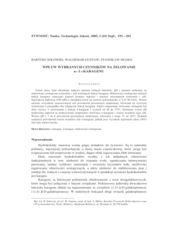 YWNO . Nauka. Technologia. Jako , 2005, 2 (43) Supl., 193 – 202 BARTOSZ SOŁOWIEJ, WALDEMAR GUSTAW, STANISŁAW MLEKO WPŁYW WYBRANYCH CZYNNIKÓW NA ELOWANIE – I -KARAGENU Streszczenie Celem pracy było okre lenie wpływu st enia ró nych kationów, pH i st enia sacharozy na wła ciwo ci reologiczne roztworów i eli wybranych frakcji karagenu. Wła ciwo ci reologiczne ró nych frakcji karagenu oznaczano poprzez pomiary lepko ci i tekstury otrzymanych roztworów i eli. Najwi ksz lepko ci (450 mPa.s) charakteryzował si roztwór polisacharydu w 0,15 M CaCl2. Wzrost st enia wszystkich zastosowanych soli powodował przesuni cie temperatury elowania ku wy szym warto ciom w przypadku obu eluj cych frakcji karagenu. Zakres temperatury elowania -karagenu był du o wy szy w porównaniu z frakcj κ-karagenu i wynosił od 48 do 73°C. Natomiast wzrost pH rodowiska wpływał na podwy szenie temperatury elowania -karagenu i wzrost twardo ci jego eli. Wzrost pH z 3 do 8 powodował przesuni cie temperatury elowania z temp. 21 do 26°C. Dodatek sacharozy powodował wzrost twardo ci eli -karagenu, jednak przy wysokich st eniach cukru (30%) ele były bardzo kruche. Słowa kluczowe: -karagen, -karagen, wła ciwo ci reologiczne Wprowadzenie Hydrokoloidy stanowi wa n grup dodatków do ywno ci. S to naturalne polimery, najcz ciej polisacharydy o du ej masie cz steczkowej, które mog by rozpuszczone lub rozproszone w wodzie, daj ce efekt zag szczania i/lub elowania. Du e znaczenie hydrokoloidów wynika z ich unikalnych wła ciwo ci funkcjonalnych w tym: zdolno ci do wi zania wody, ograniczania intensywno ci parowania, zmiany szybko ci zamra ania i tworzenia kryształów lodu, mo liwo ci regulowania wła ciwo ci reologicznych, a tak e zdolno ci do stabilizowania pian i emulsji [6]. Jednym z cz ciej wykorzystywanych w produkcji ywno ci hydrokoloidów jest karagen. Karageny s liniowymi polimerami zbudowanymi z reszt dwugalaktozowych, które mog by poł czone z innymi zwi zkami. Podstawowa jednostka dwucukrowa ła cucha karagenu składa si naprzemiennie ze zwi zków (1,3) α-D-galaktopiranozy i (1,4) β-D-galaktopiranozy. W niektórych frakcjach drugi zwi zek galaktopiranozy Mgr in . B. Sołowiej, dr in . W. Gustaw, prof. dr hab. S. Mleko, Katedra Przemysłu Rolno-Spo ywczego i Przechowalnictwa, Wydz. Rolniczy, Akademia Rolnicza, ul. Skromna 8, 20-704 Lublin 194 Bartosz Sołowiej, Waldemar Gustaw, Stanisław Mleko zast piony jest przez 3,6 anhydrogalaktoz . Rodzaj otrzymanej frakcji karagenu zale y od gatunku wodorostu i sposobu ekstrakcji. Najcz ciej spotykanymi i wykorzystywanymi frakcjami s kappa (κ), iota ( ) i lambda (λ). Pomimo, e wła ciwo ci karagenu były badane ju wielokrotnie, to jego wła ciwo ci fizykochemiczne s ci gle przedmiotem zainteresowa wielu naukowców [2, 14, 15]. Celem pracy było okre lenie wpływu st enia ró nych kationów, pH i st enia sacharozy na wła ciwo ci reologiczne roztworów i eli ró nych frakcji karagenu. Materiał i metody bada W badaniach u yto -, - i -karagenu (Sigma Chemical Co., USA), NaCl, CaCl2, KCl, MgCl2 (POCH, Gliwice). Przygotowanie roztworów ró nych frakcji karagenu Roztwory κ- i -karagenu przyrz dzono przez rozpuszczenie za pomoc mieszadła magnetycznego podczas ogrzewania układu do temp. 75°C, natomiast frakcj λ rozpuszczano w temp. 20±2ºC. Pomiary reologiczne Badania roztworów wykonano przy u yciu wiskozymetru rotacyjnego Brookfield DV-II+ (Brookfield Engineering, Stoughton, MA, USA), w układzie cylindrów współosiowych (Small Sample Adapter). W oznaczeniach wpływu temperatury na zmian lepko ci pozornej badanych roztworów stosowano stałe obroty wrzeciona 20 obr./min. Badane roztwory podgrzewano do temp. 85ºC, a nast pnie chłodzono do ok. 20ºC. Wyniki rejestrowano za pomoc programu Win Gather V 1,0 (Brookfield Engineering, Stoughton, MA, USA). Oznaczanie tekstury Tekstur eli badano przy u yciu analizatora tekstury TA-XT2i (Stable Micro Systems, Godalming, Surrey, UK). ele karagenu (0,5%) ciskano pomi dzy dwoma równoległymi płytkami o rednicy 36 mm, przy pr dko ci przesuwu głowicy 1 mm/s w temp. pokojowej (20 ± 2oC). Próby prowadzono w 3 powtórzeniach po 6 walców. ele traktowano jako materiały nie ci liwe i obliczano wzgl dne odkształcenie podczas ciskania oraz napr enie cinaj ce przy p kni ciu. Wzgl dne odkształcenie podczas ciskania: cH = -ln [1- ( h/ h)] gdzie: h – wysoko walca [mm], h – wielko przesuni cia głowicy do zniszczenia próbki [mm]. Napr enie niszcz ce przy ciskaniu: c= F[1- ( h/ h)]/ r2 gdzie: F – siła powoduj ca p kni cie walca [N], WPŁYW WYBRANYCH CZYNNIKÓW NA ELOWANIE - I -KARAGENU 195 r – pocz tkowy promie walca [mm]. Analiza statystyczna Otrzymane wyniki poddano analizie statystycznej stosuj c test t-Studenta wg Programu Stat 1, ISK Skierniewice. Wyniki i dyskusja Wła ciwo ci reologiczne ró nych frakcji karagenu oznaczano poprzez pomiary lepko ci podczas ogrzewania i chłodzenia 0,5% roztworów polisacharydu. Na rys. 1. przedstawiono przebieg krzywych lepko ci roztworów κ-karagenu (KK) sporz dzonych w wodzie destylowanej i 0,1M NaCl. Ogrzewanie roztworów do temp. 75ºC nie powodowało zmiany lepko ci obu roztworów, która wynosiła około 7,5 mPa.s, równie chłodzenie roztworów tego polisacharydu do temp. około 30ºC nie wpływało na zmian ich lepko ci. W temp. poni ej 30ºC zaobserwowano nagły wzrost lepko ci pozornej roztworu KK sporz dzonego w 0,1M NaCl, który spowodowany był elowaniem polisacharydu. Natomiast roztwór KK w wodzie destylowanej nie elował w temp. poni ej 30ºC, zauwa ono natomiast niewielki wzrost lepko ci pozornej do 17 mPa.s w temp. 20ºC. el utworzony przez KK w obecno ci soli był kruchy, o czym wiadcz wahania lepko ci pozornej spowodowane rozpadaniem si matrycy elu na skutek działania sił cinaj cych. Hermansson i wsp. [7] stwierdzili, e elowanie KK zale y od obecno ci i st enia jonów metali. Na rys. 2. przedstawiono p tl zmiany lepko ci 0,5% roztworu ι-kara