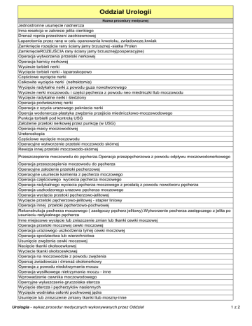 Oddział Urologii Nazwa procedury medycznej Jednostronne usunięcie nadnercza Inna resekcja w zakresie jelita cienkiego Drenaż ropnia przestrzeni zaotrzewnowej Laparotomia przez ranę w celu opanowania krwotoku, zwiadowcze,krwiak Zamknięcie rozejścia rany ściany jamy brzusznej -siatka Prolen ZamknięcieROZEJŚCIA rany ściany jamy brzusznej(pooperacyjne) Operacja wytworzenia prrzetoki nerkowej Operacja kamicy nerkowej Wyciecie torbieli nerki Wycięcie torbieli nerki - laparoskopowo Częściowe wycięcie nerki Całkowite wycięcie nerki (nefrektomia) Wycięcie radykalne nerki z powodu guza nowotworowego Wyciecie nerki moczowodu i części pęcherza z powodu neo miedniczki llub moczowodu Wycięcie radykalne nerki i śledziony Operacja podwieszonej nerki Operacja z szycia urazowego pekniecia nerki Opercja wodonercza-plastyka zwężenia przejścia miedniczkowo-moczowodowego Punkcja torbielli pod kontrolą USG Założenie przetoki nerkowej przez punkcję (w USG) Operacja maicy moczowodowej Ureteroskopia Częściowe wycięcie moczowodu Operacyjne wytworzenie przetoki moczowodo skórnej Rewizja innej przetoki moczowodo-skórnej Przeszczepienie moczowodu do pęcherza.Operacja przezpęcherzowa z powodu odpływu moczowodonerkowego Operacja przeszczepienia moczowodu do pęcherza Operacyjne założenie przetoki pecherzowej Operacyjne usuniecie kamienia z pęcherza moczowego Operacja częściowego wyciecia pęcherza moczowego Operacja radykalnego wyciecia pęcherza moczowego z prostatą z powodu nowotworu pęcherza Operacja uszkodzonego urazowo pęcherza moczowego Operacja wycięcia przetoki pęcherzowo-jelitowej Wycięcie przetoki pęcherzowo-jelitowej - stapler liniowy Operacja innej przetoki pęcherzowo-pochwowej Rekonstrukcja pecherza moczowego ( zastępczy pęcherz jelitowy).Wytworzenie pecherza zastępczego z jelita po usunieciu radykalnego pęcherza Inne miejscowe wycięcie lub zniszczenie zmian lub tkanki cewki moczowej Operacja przetoki moczowej cewki moczowej Operacja urazowego uszkodzenia tylnej cewki moczowej Operacja spodziectwa lub wierzchnictwa Usunięcie zwężenia cewki moczowej Nacięcie tkanki okołocewkowej Wyciecie tkanki okołocewkowej Operacja na moczowodzie z powodu zwężenia Opercaj zwiadowcza i drrenaż okołonerkowy Operacja z powodu niedotrzymania moczu Operacja wysiłkowego nietrzymania moczu - inne Wprowadzenie cewnika moczowodowego Opercyjne wyłuszczenie gruczolaka stercza Wycięcie stercza i pęcherzyków nasiennych Wycięcie wodniaka osłonki pochwowej jądra Usunięcie lub zniszczenie zmiany tkanki llub moszny-inne Urologia - wykaz procedur medycznych wykonywanych przez Oddział 1z2 Szycie rany moszny i osłonki pochwowej jądra Biopsja jader-opercyjne pobranie wycinków z jąder Usuniecie lub zniszczenie zmiany jądra Jednostrone wyciecie jądra Umocowanie jądra w mosznie. Operacja niezstąpienia jądra Szycie rany jądra Wszczepienie protezy jądra Operacja żylaków powrózga nasiennego Wysokie podwiązanie żyły jądrowej.Laparaskopowaoperacja żylaków porwózka nasiennego Wyciecie torbieli najądrza Wyciecie najądrza Operacja skrętu jądra lub powrózka nasienego Operacja stulejki Miejscowe wycięcie lub zniszczenie zmiany prącia Amputacja prącia Operacje naprawcze prącia-inne Operacja z powodu ciągotki Urologia - wykaz procedur medycznych wykonywanych przez Oddział 2z2