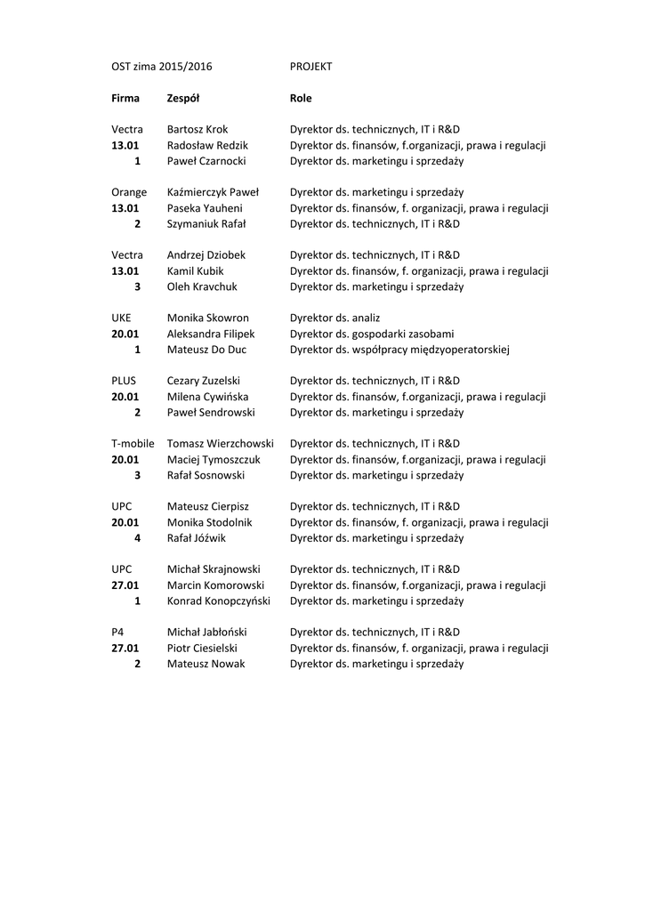 OST zima 2015/2016 PROJEKT Firma Zespół Role Vectra 13.01 1 Bartosz Krok Radosław Redzik Paweł Czarnocki Dyrektor ds. technicznych, IT i R&D Dyrektor ds. finansów, f.organizacji, prawa i regulacji Dyrektor ds. marketingu i sprzedaży Orange 13.01 2 Kaźmierczyk Paweł Paseka Yauheni Szymaniuk Rafał Dyrektor ds. marketingu i sprzedaży Dyrektor ds. finansów, f. organizacji, prawa i regulacji Dyrektor ds. technicznych, IT i R&D Vectra 13.01 3 Andrzej Dziobek Kamil Kubik Oleh Kravchuk Dyrektor ds. technicznych, IT i R&D Dyrektor ds. finansów, f. organizacji, prawa i regulacji Dyrektor ds. marketingu i sprzedaży UKE 20.01 1 Monika Skowron Aleksandra Filipek Mateusz Do Duc Dyrektor ds. analiz Dyrektor ds. gospodarki zasobami Dyrektor ds. współpracy międzyoperatorskiej PLUS 20.01 2 Cezary Zuzelski Milena Cywińska Paweł Sendrowski Dyrektor ds. technicznych, IT i R&D Dyrektor ds. finansów, f.organizacji, prawa i regulacji Dyrektor ds. marketingu i sprzedaży T-mobile 20.01 3 Tomasz Wierzchowski Maciej Tymoszczuk Rafał Sosnowski Dyrektor ds. technicznych, IT i R&D Dyrektor ds. finansów, f.organizacji, prawa i regulacji Dyrektor ds. marketingu i sprzedaży UPC 20.01 4 Mateusz Cierpisz Monika Stodolnik Rafał Jóźwik Dyrektor ds. technicznych, IT i R&D Dyrektor ds. finansów, f. organizacji, prawa i regulacji Dyrektor ds. marketingu i sprzedaży UPC 27.01 1 Michał Skrajnowski Marcin Komorowski Konrad Konopczyński Dyrektor ds. technicznych, IT i R&D Dyrektor ds. finansów, f.organizacji, prawa i regulacji Dyrektor ds. marketingu i sprzedaży P4 27.01 2 Michał Jabłoński Piotr Ciesielski Mateusz Nowak Dyrektor ds. technicznych, IT i R&D Dyrektor ds. finansów, f. organizacji, prawa i regulacji Dyrektor ds. marketingu i sprzedaży 13.01 20.01 27.01 3 zesp 4 zesp 2 zesp 13-16 12-16 12-15 2 2
