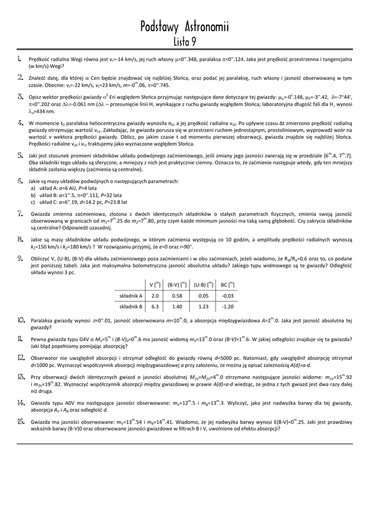 Prędkość radialna Wegi równa jest vr=-14 km/s, jej ruch własny =0''.348, paralaksa =0''.124. Jaka jest prędkość przestrzenna i tangencjalna (w km/s) Wegi? Znaleźć datę, dla której Cen będzie znajdować się najbliżej Słońca, oraz podać jej paralaksę, ruch własny i jasność obserwowaną w tym m czasie. Obecnie: vr=-22 km/s, vt=23 km/s, m=-0 .06, =0''.745. 2 s Opisz wektor prędkości gwiazdy Eri względem Słońca przyjmując następujące dane dotyczące tej gwiazdy: =-0 .148, =-3''.42, =-744', =0''.202 oraz =-0.061 nm ( – przesunięcie linii H wynikające z ruchu gwiazdy względem Słońca; laboratoryjna długość fali dla H wynosi o=434 nm. W momencie t0 paralaksa heliocentryczna gwiazdy wynosiła π0, a jej prędkość radialna vr0. Po upływie czasu Δt zmierzono prędkość radialną gwiazdy otrzymując wartość vr1. Zakładając, że gwiazda porusza się w przestrzeni ruchem jednostajnym, prostoliniowym, wyprowadź wzór na wartość v wektora prędkości gwiazdy. Oblicz, po jakim czasie t od momentu pierwszej obserwacji, gwiazda znajdzie się najbliżej Słońca. Prędkości radialne vr0 i vr1 traktujemy jako wyznaczone względem Słońca. m m Jaki jest stosunek promieni składników układu podwójnego zaćmieniowego, jeśli zmiany jego jasności zwierają się w przedziale [6 .4, 7 .7]. Oba składniki tego układu są sferyczne, a mniejszy z nich jest praktycznie ciemny. Oznacza to, że zaćmienie następuje wtedy, gdy ten mniejszy składnik zasłania większy (zaćmienia są centralne). Jakie są masy układów podwójnych o następujących parametrach: a) układ A: a=6 AU, P=4 lata b) układ B: a=1''.5, =0''.111, P=32 lata c) układ C: a=6''.19, d=14.2 pc, P=23.8 lat Gwiazda zmienna zaćmieniowa, złożona z dwóch identycznych składników o stałych parametrach fizycznych, zmienia swoją jasność m m obserwowaną w granicach od m1=7 .25 do m2=7 .80, przy czym każde minimum jasności ma taką samą głębokość. Czy zakrycia składników są centralne? Odpowiedź uzasadnij. Jakie są masy składników układu podwójnego, w którym zaćmienia występują co 10 godzin, a amplitudy prędkości radialnych wynoszą k1=150 km/s i k2=180 km/s ? W rozwiązaniu przyjmij, że e=0 oraz i=90. Obliczyć V, (U-B), (B-V) dla układu zaćmieniowego poza zaćmieniami i w obu zaćmieniach, jeżeli wiadomo, że R B/RA=0.6 oraz to, co podane jest poniższej tabeli. Jaka jest maksymalna bolometryczna jasność absolutna układu? Jakiego typu widmowego są te gwiazdy? Odległość układu wynosi 3 pc. m m m m V[ ] (B-V) [ ] (U-B) [ ] BC [ ] składnik A 2.0 0.58 0.05 -0.03 składnik B 6.3 1.40 1.23 -1.20 Paralaksa gwiazdy wynosi =0''.01, jasność obserwowana m=10 .0, a absorpcja międzygwiazdowa A=2 .0. Jaka jest jasność absolutna tej gwiazdy? m m m m m m Pewna gwiazda typu G4V o MV=5 i (B-V)0=0 .6 ma jasność widomą mV=13 .0 oraz (B-V)=1 .6. W jakiej odległości znajduje się ta gwiazda? Jaki błąd popełniamy pomijając absorpcję? Obserwator nie uwzględnił absorpcji i otrzymał odległość do gwiazdy równą d=5000 pc. Natomiast, gdy uwzględnił absorpcję otrzymał d=1000 pc. Wyznaczyć współczynnik absorpcji międzygwiazdowej a przy założeniu, że można ją opisać zależnością A(d)=ad. m m Przy obserwacji dwóch identycznych gwiazd o jasności absolutnej M1V=M2V=4 .0 otrzymano następujące jasności widome: m1V=15 .92 m i m2V=19 .82. Wyznaczyć współczynnik absorpcji między gwiazdowej w prawie A(d)=ad wiedząc, że jedna z tych gwiazd jest dwa razy dalej niż druga. m m Gwiazda typu A0V ma następujące jasności obserwowane: mV=12 .5 i mB=13 .3. Wyliczyć, jaka jest nadwyżka barwy dla tej gwiazdy, absorpcja AV i AB oraz odległość d. m m m Gwiazda ma jasności obserwowane: mV=13 .54 i mB=14 .41. Wiadomo, że jej nadwyżka barwy wynosi E(B-V)=0 .25. Jaki jest prawdziwy wskaźnik barwy (B-V)0 oraz obserwowane jasności gwiazdowe w filtrach B i V, uwolnione od efektu absorpcji?