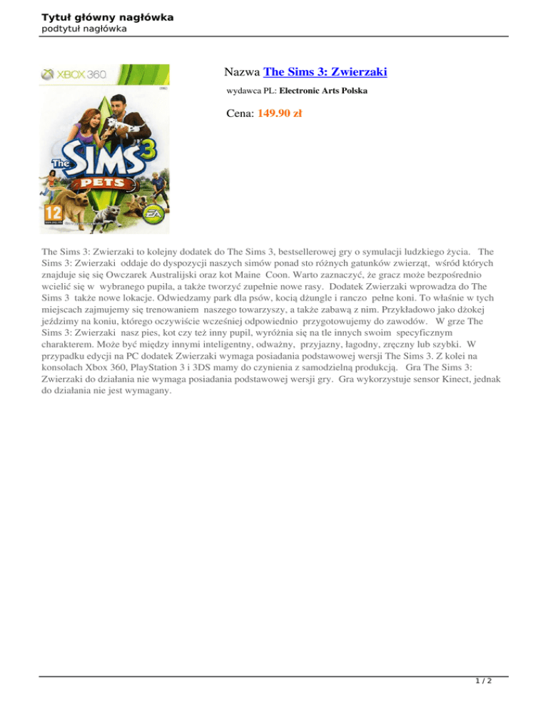 Tytuł główny nagłówka podtytuł nagłówka Nazwa The Sims 3: Zwierzaki wydawca PL: Electronic Arts Polska Cena: 149.90 zł The Sims 3: Zwierzaki to kolejny dodatek do The Sims 3, bestsellerowej gry o symulacji ludzkiego życia. The Sims 3: Zwierzaki oddaje do dyspozycji naszych simów ponad sto różnych gatunków zwierząt, wśród których znajduje się się Owczarek Australijski oraz kot Maine Coon. Warto zaznaczyć, że gracz może bezpośrednio wcielić się w wybranego pupila, a także tworzyć zupełnie nowe rasy. Dodatek Zwierzaki wprowadza do The Sims 3 także nowe lokacje. Odwiedzamy park dla psów, kocią dżungle i ranczo pełne koni. To właśnie w tych miejscach zajmujemy się trenowaniem naszego towarzyszy, a także zabawą z nim. Przykładowo jako dżokej jeździmy na koniu, którego oczywiście wcześniej odpowiednio przygotowujemy do zawodów. W grze The Sims 3: Zwierzaki nasz pies, kot czy też inny pupil, wyróżnia się na tle innych swoim specyficznym charakterem. Może być między innymi inteligentny, odważny, przyjazny, łagodny, zręczny lub szybki. W przypadku edycji na PC dodatek Zwierzaki wymaga posiadania podstawowej wersji The Sims 3. Z kolei na konsolach Xbox 360, PlayStation 3 i 3DS mamy do czynienia z samodzielną produkcją. Gra The Sims 3: Zwierzaki do działania nie wymaga posiadania podstawowej wersji gry. Gra wykorzystuje sensor Kinect, jednak do działania nie jest wymagany. 1/2 Tytuł główny nagłówka podtytuł nagłówka Nazwa Wartość Wydawca PL Electronics Arts Polska Data premiery Jesień 2011 Producent Tryb gry Kategoria wiekowa Wersja językowa Wymagania sprzętowe Format EA Games Single Player 12+ ENG Konsola Xbox 360; wykorzystuje Kinect 1xDVD 2/2