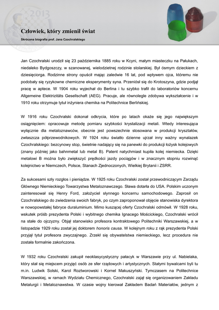 Człowiek, który zmienił świat Skrócona biografia prof. Jana Czochralskiego Jan Czochralski urodził się 23 października 1885 roku w Kcyni, małym miasteczku na Pałukach, niedaleko Bydgoszczy, w szanowanej, wielodzietnej rodzinie stolarskiej. Był ósmym dzieckiem z dziesięciorga. Rodzinne strony opuścił mając zaledwie 16 lat, pod wpływem ojca, któremu nie podobały się ryzykowne chemiczne eksperymenty syna. Przeniósł się do Krotoszyna, gdzie podjął pracę w aptece. W 1904 roku wyjechał do Berlina i tu szybko trafił do laboratoriów koncernu Allgemeine Elektrizitäts Gesellschaft (AEG). Pracuje, ale równolegle zdobywa wykształcenie i w 1910 roku otrzymuje tytuł inżyniera chemika na Politechnice Berlińskiej. W 1916 roku Czochralski dokonał odkrycia, które po latach okaże się jego największym osiągnięciem: opracowuje metodę pomiaru szybkości krystalizacji metali. Wtedy interesująca wyłącznie dla metaloznawców, obecnie jest powszechnie stosowana w produkcji kryształów, zwłaszcza półprzewodnikowych. W 1924 roku światło dzienne ujrzał inny ważny wynalazek Czochralskiego: bezcynowy stop, świetnie nadający się na panewki do produkcji łożysk kolejowych (znany później jako bahnmetal lub metal B). Patent natychmiast kupiła kolej niemiecka. Dzięki metalowi B można było zwiększyć prędkości jazdy pociągów i w znacznym stopniu rozwinąć kolejnictwo w Niemczech, Polsce, Stanach Zjednoczonych, Wielkiej Brytanii i ZSRR. Za sukcesami szły rozgłos i pieniądze. W 1925 roku Czochralski został przewodniczącym Zarządu Głównego Niemieckiego Towarzystwa Metaloznawczego. Sława dotarła do USA. Polskim uczonym zainteresował się Henry Ford, założyciel słynnego koncernu samochodowego. Zaprosił on Czochralskiego do zwiedzenia swoich fabryk, po czym zaproponował objęcie stanowiska dyrektora w nowopowstałej fabryce duraluminium. Mimo kuszącej oferty Czochralski odmówił. W 1928 roku, wskutek próśb prezydenta Polski i wybitnego chemika Ignacego Mościckiego, Czochralski wrócił na stałe do ojczyzny. Objął stanowisko profesora kontraktowego Politechniki Warszawskiej, a w listopadzie 1929 roku został jej doktorem honoris causa. W kolejnym roku z rąk prezydenta Polski przyjął tytuł profesora zwyczajnego. Zrzekł się obywatelstwa niemieckiego, lecz procedura nie została formalnie zakończona. W 1932 roku Czochralski zakupił neoklasycystyczny pałacyk w Warszawie przy ul. Nabielaka, który stał się miejscem przyjęć osób ze sfer rządowych i artystycznych. Stałymi bywalcami byli tu m.in. Ludwik Solski, Karol Roztworowski i Kornel Makuszyński. Tymczasem na Politechnice Warszawskiej, w ramach Wydziału Chemicznego, Czochralski zajął się organizowaniem Zakładu Metalurgii i Metaloznawstwa. W czasie wojny kierował Zakładem Badań Materiałów, jednym z ośmiu zakładów utworzonych na Politechnice za zgodą okupanta. Zakład pomógł przetrwać wielu polskim naukowcom, ale wykonywał prace także dla Wehrmachtu. Sam Czochralski w czasie wojny wielokrotnie wykorzystywał swoje koneksje i dobrą sytuację materialną by ratować nie tylko naukowców i artystów przed represjami ze strony hitlerowskich Niemiec. W pomoc zaangażowana była cała rodzina, zwłaszcza najstarsza córka Leonia. Z powodu prac wykonywanych dla Niemców przez zakład kierowany przez Czochralskiego, natychmiast po wojnie profesora oskarżono o współpracę z okupantem. Czochralski na kilka miesięcy trafia do aresztu w Piotrkowie Trybunalskim. Wobec braku dowodów winy dochodzenie umorzono. W obronie poszkodowanego, dając wyraz jego patriotyzmu, wystąpił m.in. Gustaw Olechowski, były konsul Rzeczypospolitej. Mimo uniewinnienia przez prokuraturę czasów stalinowskich, w grudniu 1945 roku władze Politechniki Warszawskiej pozbawiły Czochralskiego tytułu profesorskiego i praktycznie wykluczyły ze środowiska naukowego. W sierpniu 1945 roku upokorzony Czochralski wrócił do Kcyni. Założył tu małą firmę chemiczną BION, zajmującą się m.in. produkcją pasty do butów, soli peklującej i płynu do trwałej ondulacji. Po brutalnej rewizji, przeprowadzonej w jego willi w Kcyni przez Urząd Bezpieczeństwa, Jan Czochralski doznaje ataku serca i 22 kwietnia 1953 roku umiera w szpitalu w Poznaniu. Prof. Jan Czochralski był autorem lub współautorem ponad 120 publikacji naukowych, wielu wynalazków i patentów. Do dziś jest najczęściej cytowanym polskim uczonym. Jego największym osiągnięciem okazała się jednak metoda wytwarzania monokryształów. Można przypuszczać, że gdyby prof. Czochralski żył kilkanaście lat dłużej i doczekał rozkwitu elektroniki półprzewodnikowej, z ogromnym prawdopodobieństwem Polska miałaby drugiego noblistę w – najbardziej prestiżowych – naukach ścisłych. Starania o rehabilitację prof. Czochralskiego podejmowano na Politechnice Warszawskiej kilkakrotnie. Dopiero dokumenty odnalezione w 2011 roku pozwoliły jednoznacznie potwierdzić współpracę prof. Czochralskiego nie z okupantem, a z wywiadem Komendy Głównej Armii Krajowej. W tej sytuacji senat Politechniki Warszawskiej uchwałą z 29 czerwca 2011 roku – po 66 latach... – całkowicie zrehabilitował prof. Czochralskiego. Z uwagi na uwarunkowania historyczne Czochralski był postacią tragiczną. Wychowanie w rodzinie patriotycznej nie pozwoliło mu na obronę, której skutkiem byłoby pogrążenie wielu innych osób z kręgu opozycji podziemnej Armii Krajowej. W uznaniu ogromnych zasług prof. Czochralskiego i znaczenia społecznego jego wynalazków, sejm Rzeczypospolitej Polskiej ustanowił rok 2013 Rokiem Jana Czochralskiego. Informacja jest częścią pakietu związanego z akcją „Pokaż kryształ Czochralskiego” polskich popularyzatorów nauki.