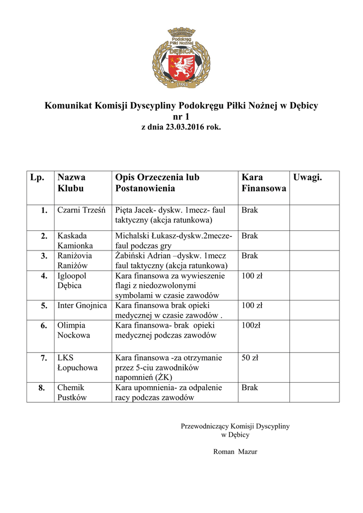 Komunikat Komisji Dyscypliny Podokręgu Piłki Nożnej w Dębicy nr 1