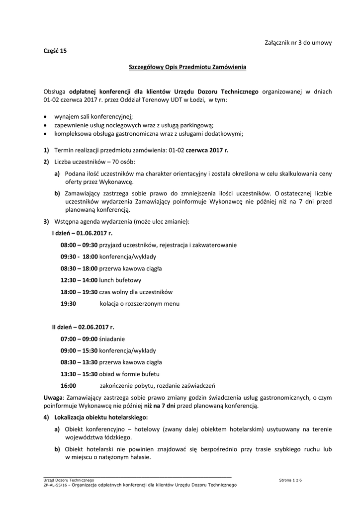 Załącznik nr 3 do umowy Część 15 Szczegółowy Opis Przedmiotu Zamówienia Obsługa odpłatnej konferencji dla klientów Urzędu Dozoru Technicznego organizowanej w dniach 01-02 czerwca 2017 r. przez Oddział Terenowy UDT w Łodzi, w tym: wynajem sali konferencyjnej; zapewnienie usług noclegowych wraz z usługą parkingową; kompleksowa obsługa gastronomiczna wraz z usługami dodatkowymi; 1) Termin realizacji przedmiotu zamówienia: 01-02 czerwca 2017 r. 2) Liczba uczestników – 70 osób: a) Podana ilość uczestników ma charakter orientacyjny i została określona w celu skalkulowania ceny oferty przez Wykonawcę. b) Zamawiający zastrzega sobie prawo do zmniejszenia ilości uczestników. O ostatecznej liczbie uczestników wydarzenia Zamawiający poinformuje Wykonawcę nie później niż na 7 dni przed planowaną konferencją. 3) Wstępna agenda wydarzenia (może ulec zmianie): I dzień – 01.06.2017 r. 08:00 – 09:30 przyjazd uczestników, rejestracja i zakwaterowanie 09:30 - 18:00 konferencja/wykłady 08:30 – 18:00 przerwa kawowa ciągła 12:30 – 14:00 lunch bufetowy 18:00 – 19:30 czas wolny dla uczestników 19:30 kolacja o rozszerzonym menu II dzień – 02.06.2017 r. 07:00 – 09:00 śniadanie 09:00 – 15:30 konferencja/wykłady 08:30 – 13:30 przerwa kawowa ciągła 13:30 – 15:30 obiad w formie bufetu 16:00 zakończenie pobytu, rozdanie zaświadczeń Uwaga: Zamawiający zastrzega sobie prawo zmiany godzin świadczenia usług gastronomicznych, o czym poinformuje Wykonawcę nie później niż na 7 dni przed planowaną konferencją. 4) Lokalizacja obiektu hotelarskiego: a) Obiekt konferencyjno – hotelowy (zwany dalej obiektem hotelarskim) usytuowany na terenie województwa łódzkiego. b) Obiekt hotelarski nie powinien znajdować się bezpośrednio przy trasie szybkiego ruchu lub w miejscu o natężonym hałasie. _________________________________________________________________________ Urząd Dozoru Technicznego ZP-AL-55/16 – Organizacja odpłatnych konferencji dla klientów Urzędu Dozoru Technicznego Strona 1 z 6 c) Obiekt hotelarski powinien znajdować się w cichej i atrakcyjnej okolicy, w otoczeniu zieleni/ jeziora/ stawów/ parku. 5) Standard i ogólne wymagania Zamawiającego w stosunku do zaoferowanego obiektu hotelarskiego: a) Wykonawca zapewni realizację usług w obiekcie hotelarskim o standardzie minimum trzech gwiazdek, tzn. zapewniony obiekt hotelarski musi spełniać kryteria określone dla hoteli co najmniej trzygwiazdkowych – *** zgodnie z załącznikiem nr 1 do Rozporządzenia Ministra Gospodarki i Pracy z dnia 19 sierpnia 2004 r. w sprawie obiektów hotelarskich i innych obiektów, w których są świadczone usługi hotelarskie (Dz. U. z 2006 r. Nr 22, poz.169 z pózn.zm.), b) Obiekt hotelarski powinien być oddany do użytku lub wyremontowany nie wcześniej niż 10 lat przed dniem opublikowania niniejszego postępowania, c) Obiekt hotelarski nie może być w trakcie prac remontowych w czasie realizacji usług, tj. w czasie konferencji, d) Jeśli w obiekcie hotelarskim, w terminie realizacji przedmiotu zamówienia, będzie jednocześnie organizowana inna impreza/konferencja, nie może ona w jakikolwiek sposób kolidować lub wpływać na przebieg konferencji Zamawiającego, komfort uczestników, identyfikację konferencji Zamawiającego, czy w inny sposób powodować np. hałas, mieszanie się uczestników, połączenie oznaczeń, stoisk czy punktów rejestracji uczestników itp. e) Wykonawca zobligowany jest do świadczenia usługi konferencyjnej i gastronomicznej oraz noclegowej w tym samym obiekcie (dopuszczalne jest kilka budynków pod tym samym adresem z dogodnym przejściem z jednego budynku do drugiego), f) Na terenie obiektu – bar/restauracja do skorzystania przez uczestników konferencji we własnym zakresie (zakup napoi zimnych, gorących, alkoholowych, przekąsek). 6) Wykonawca zapewni obiekt hotelarski spełniający poniższe szczegółowe wymagania: a) Odpowiednia ilości pokoi do ułożenia grupy max 70 osób, w tym co najmniej 36 osób do ułożenia w pokojach jednoosobowych lub dwuosobowych z możliwością pojedynczego wykorzystania (WAŻNE) oraz odpowiednio 34 osób do ułożenia w pokojach dwuosobowych, tj. do 17 pokoi dwuosobowych z dwoma oddzielnymi łóżkami (WAŻNE). Wszystkie pokoje posiadające standard minimum *** - zgodnie z załącznikiem nr 1 do Rozporządzenia Ministra Gospodarki i Pracy z dnia 19 sierpnia 2004 r. w sprawie obiektów hotelarskich i innych obiektów, w których są świadczone usługi hotelarskie (Dz. U. z 2006 r. Nr. 22, poz. 169, z późn. zm.) b) Sala konferencyjna: - swobodnie mieszcząca grupę 70 osób w ustawieniu szkolnym lub w podkowę (ustawienie sali w każdym dniu do uzgodnienia z Zamawiającym); - wyposażona w nagłośnienie, mównicę, stół prezydialny dla 6 osób, rzutnik multimedialny, ekran, co najmniej 2 mikrofony bezprzewodowe, tablicę (papierową lub tablicę białą sucho ścieralną), markery do tablicy; ekran jest dobrze widoczny z każdego miejsca sali; - wskazane jest, by sala miała dwa wyjścia - z przodu i z tyłu; - z dostępem do światła dziennego, możliwością zaciemnienia (WAŻNE) oraz możliwością regulacji oświetlenia sztucznego, - sala klimatyzowana z możliwością regulacji temperatury; - każdego dnia konferencji Zamawiający korzysta z tej samej sali/sal w obiekcie, - na sali konferencyjnej obecna obsługa techniczna z obiektu hotelarskiego przez cały czas trwania obrad podczas konferencji; obsługa techniczna odpowiada między innymi za sprawne działanie sprzętu multimedialnego, oświetlenia, klimatyzacji, nagłośnienia. _________________________________________________________________________ Urząd Dozoru Technicznego ZP-AL-55/16 – Organizacja odpłatnych konferencji dla klientów Urzędu Dozoru Technicznego Strona 2 z 6 c) Sala bankietowo/restauracyjna swobodnie mieszcząca grupę 70 osób przy stolikach bankietowych okrągłych (m