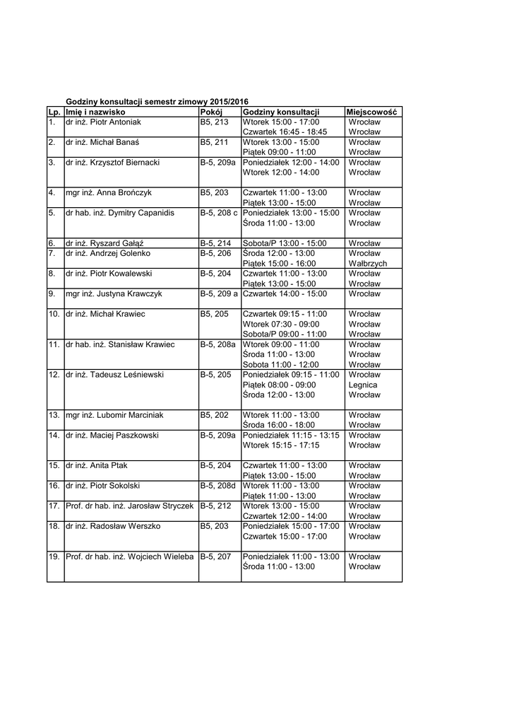 Lp. Imię i nazwisko Pokój Godziny konsultacji Miejscowość 1. dr inż