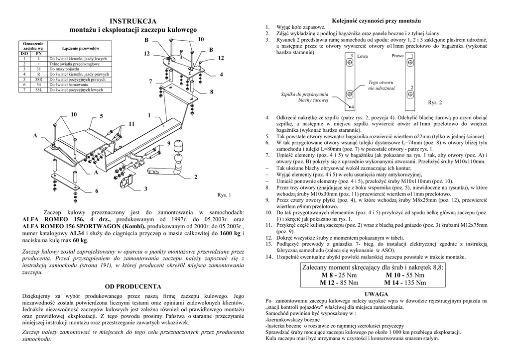 Kolejność czynności przy montaŜu INSTRUKCJA montaŜu i eksploatacji zaczepu kulowego Oznaczenie zacisku wg ISO PN 1 L 2 + 3 31 4 R 5 58R 6 54 7 58L 10 B Łączenie przewodów B 12 Do świateł kierunku jazdy lewych Tylne światła przeciwmgłowe Do masy pojazdu Do świateł kierunku jazdy prawych Do świateł pozycyjnych prawych Do świateł hamowania Do świateł pozycyjnych lewych 1. 2. 3. Wyjąć koło zapasowe. Zdjąć wykładzinę z podłogi bagaŜnika oraz panele boczne i z tylnej ściany. Rysunek 2 przedstawia ramę samochodu od spodu: otwory 1, 2 i 3 zaklejone plastrem udroŜnić, a następnie przez te otwory wywiercić otwory ø11mm przelotowo do bagaŜnika (wykonać bardzo starannie). 3 Lewa 12 Prawa 4 7 Tego otworu nie udraŜniać 8 Szpilka do przykręcania blachy Ŝarowej 1 5 4. 11 A 5. 6. 9 7. A 6 − − − 8. 2 3 Rys. 1 9. Zaczep kulowy przeznaczony jest do zamontowania w samochodach: ALFA ROMEO 156, 4 drz., produkowanym od 1997r. do 05.2003r. oraz ALFA ROMEO 156 SPORTWAGON (Kombi), produkowanym od 2000r. do 05.2003r., numer katalogowy AL34 i słuŜy do ciągnięcia przyczep o masie całkowitej do 1600 kg i nacisku na kulę max 60 kg. Zaczep kulowy został zaprojektowany w oparciu o punkty montaŜowe przewidziane przez producenta. Przed przystąpieniem do zamontowania zaczepu naleŜy zapoznać się z instrukcją samochodu (strona 191), w której producent określił miejsca zamontowania zaczepu. OD PRODUCENTA Dziękujemy za wybór produkowanego przez naszą firmę zaczepu kulowego. Jego niezawodność została potwierdzona licznymi testami oraz opiniami zadowolonych klientów. JednakŜe niezawodność zaczepów kulowych jest zaleŜna równieŜ od prawidłowego montaŜu oraz prawidłowej eksploatacji. Z tego powodu prosimy Państwa o staranne przeczytanie niniejszej instrukcji montaŜu oraz przestrzeganie zawartych wskazówek. Zaczep naleŜy zamontować w miejscach do tego celu przeznaczonych przez producenta samochodu. 10. 11. 12. 13. 14. 2 Rys. 2 4 10 1 Odkręcić nakrętkę ze szpilki (patrz rys. 2, pozycja 4). Odchylić blachę Ŝarową po czym obciąć szpilkę, a następnie w miejscu szpilki wywiercić otwór ø11mm przelotowo do wnętrza bagaŜnika (wykonać bardzo starannie). Tak powstałe otwory wewnątrz bagaŜnika rozwiercić wiertłem ø22mm (tylko w jednej ściance). W tak przygotowane otwory wsunąć tulejki dystansowe L=74mm (poz. 8) w otwory bliŜej tyłu samochodu i tulejki L=80mm (poz. 7) w pozostałe otwory - patrz rys. 1. Umieść elementy (poz. 4 i 5) w bagaŜniku jak pokazano na rys. 1 tak, aby otwory (poz. A) i otwory (poz. B) pokryły się z uprzednio wykonanymi otworami. PrzełoŜyć śruby M10x110mm. Tak ułoŜone blachy obrysować wokół zaznaczając ich kontur, Wyjąć elementy (poz. 4 i 5) w celu usunięcia maty antykorozyjnej, Umieść ponownie elementy (poz. 4 i 5), przełoŜyć śruby M10x110mm (poz. 10). Przez trzy otwory (znajdujące się z boku wspornika (poz. 5), niewidoczne na rysunku), w które wchodzą śruby M10x30mm (poz. 11) przewiercić wiertłem ø11mm przelotowo. Przez cztery otwory płytki (poz. 4), w które wchodzą śruby M8x25mm (poz. 12), przewiercić wiertłem ø9mm przelotowo. Do tak przygotowanych elementów (poz. 4 i 5) przyłoŜyć od spodu belkę główną zaczepu (poz. 1) i skręcić jak pokazano na rys. 1. Przykręć część kulistą zaczepu (poz. 2) wraz z blachą pod gniazdo (poz. 3) śrubami M12x75mm (poz. 9). Dokręć wszystkie śruby z momentem pokazanym w tabeli. Podłączyć przewody z gniazdka 7- bieg. do instalacji elektrycznej zgodnie z instrukcją fabryczną samochodu (zaleca się wykonanie w ASO). Uzupełnić ewentualne ubytki powłoki malarskiej zaczepu powstałe w trakcie montaŜu. Zalecany moment skręcający dla śrub i nakrętek 8,8: M 8 - 25 Nm M 10 - 55 Nm M 12 - 85 Nm M 14 - 135 Nm UWAGA Po zamontowaniu zaczepu kulowego naleŜy uzyskać wpis w dowodzie rejestracyjnym pojazdu na „stacji kontroli pojazdów” właściwej dla miejsca zamieszkania. Samochód powinien być wyposaŜony w : -kierunkowskazy boczne -lusterka boczne o rozstawie co najmniej szerokości przyczepy Sprawdzać śruby mocujące zaczepu kulowego po około 1 000 km przebiegu eksploatacji. Kula zaczepu musi być utrzymana w czystości i konserwowana smarem stałym. PPUH AUTO-HAK S.J. WyposaŜenie zaczepu: Produkcja Zaczepów Kulowych Henryk & Zbigniew Nejman 76-200 SŁUPSK ul. Słoneczna 16K tel/fax (059) 8-414-414; 8-414-413 e-mail: [email protected] www. autohak.com.pl Zaczep kulowy bez wyposaŜenia elektrycznego Klasa: A50-X Nr kat. AL34 Przeznaczony do zamontowania w samochodach: Producent: ALFA ROMEO Model: 156 Typ: 4 drz. produkowanym od 1997r. do 05.2003r. Typ: SPORTWAGON (Kombi) produkowanym od 2000r. do 05.2003r. KARTA GWARANCYJNA Producent udziela gwarancji niniejszą kartą gwarancyjną na okres 24 miesięcy licząc od dnia zakupu zaczepu kulowego do samochodów: Dane techniczne: Wartość siły D : 8,66 kN maksymalna masa przyczepy: 1600 kg maksymalny nacisk na kulę: 60 kg Numer homologacji zgodnie z dyrektywą 94/20/WE: e20*94/20*0221*00 ALFA ROMEO 156, 4 drz. produkowanego od 1997r. do 05.2003r. ALFA ROMEO 156 SPORTWAGON (Kombi) produkowanego od 2000r. do 05.2003r. Data produkcji .............................. Data zakupu............................................. Zakres gwarancji obejmuje wyłącznie wady jakościowe wynikające z winy producenta. Gwarancja nie obejmuje natomiast uszkodzeń zawinionych przez nabywcę, wynikających z niewłaściwego montaŜu, uŜytkowania lub konserwacji, uszkodzeń mechanicznych, normalnego zuŜycia podczas eksploatacji itp. Gwarancja udzielona na zakupiony towar nie wyłącza, nie ogranicza ani nie zawiesza uprawnień kupującego wynikających z niezgodności towaru z umową. Reklamacje naleŜy zgłaszać w punkcie sprzedaŜy, składając jednocześnie kartę gwarancyjną. Usunięcie "wady" następuje po stwierdzeniu przez punkt sprzedaŜy wspólnie z producentem słuszn