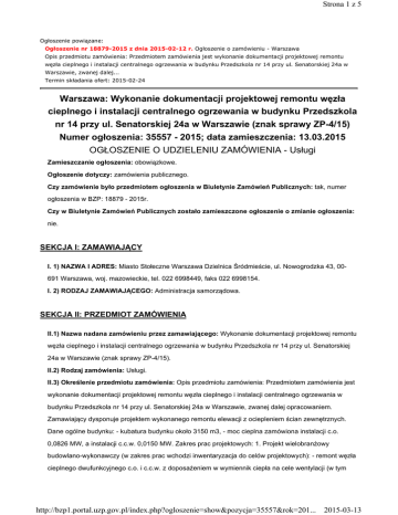 Strona 1 z 5 Ogłoszenie powiązane: Ogłoszenie nr 18879-2015 z dnia 2015-02-12 r. Ogłoszenie o zamówieniu - Warszawa Opis przedmiotu zamówienia: Przedmiotem zamówienia jest wykonanie dokumentacji projektowej remontu węzła cieplnego i instalacji centralnego ogrzewania w budynku Przedszkola nr 14 przy ul. Senatorskiej 24a w Warszawie, zwanej dalej... Termin składania ofert: 2015-02-24 Warszawa: Wykonanie dokumentacji projektowej remontu węzła cieplnego i instalacji centralnego ogrzewania w budynku Przedszkola nr 14 przy ul. Senatorskiej 24a w Warszawie (znak sprawy ZP-4/15) Numer ogłoszenia: 35557 - 2015; data zamieszczenia: 13.03.2015 OGŁOSZENIE O UDZIELENIU ZAMÓWIENIA - Usługi Zamieszczanie ogłoszenia: obowiązkowe. Ogłoszenie dotyczy: zamówienia publicznego. Czy zamówienie było przedmiotem ogłoszenia w Biuletynie Zamówień Publicznych: tak, numer ogłoszenia w BZP: 18879 - 2015r. Czy w Biuletynie Zamówień Publicznych zostało zamieszczone ogłoszenie o zmianie ogłoszenia: nie. SEKCJA I: ZAMAWIAJĄCY I. 1) NAZWA I ADRES: Miasto Stołeczne Warszawa Dzielnica Śródmieście, ul. Nowogrodzka 43, 00691 Warszawa, woj. mazowieckie, tel. 022 6998449, faks 022 6998154. I. 2) RODZAJ ZAMAWIAJĄCEGO: Administracja samorządowa. SEKCJA II: PRZEDMIOT ZAMÓWIENIA II.1) Nazwa nadana zamówieniu przez zamawiającego: Wykonanie dokumentacji projektowej remontu węzła cieplnego i instalacji centralnego ogrzewania w budynku Przedszkola nr 14 przy ul. Senatorskiej 24a w Warszawie (znak sprawy ZP-4/15). II.2) Rodzaj zamówienia: Usługi. II.3) Określenie przedmiotu zamówienia: Opis przedmiotu zamówienia: Przedmiotem zamówienia jest wykonanie dokumentacji projektowej remontu węzła cieplnego i instalacji centralnego ogrzewania w budynku Przedszkola nr 14 przy ul. Senatorskiej 24a w Warszawie, zwanej dalej opracowaniem. Zamawiający dysponuje projektem wykonanego remontu elewacji z ociepleniem ścian zewnętrznych. Dane ogólne budynku: - kubatura budynku około 3150 m3, - moc cieplna zamówiona instalacji c.o. 0,0826 MW, a instalacji c.c.w. 0,0150 MW. Zakres prac projektowych: 1. Projekt wielobranżowy budowlano-wykonawczy (w zakres prac wchodzi inwentaryzacja do celów projektowych): - remont węzła cieplnego dwufunkcyjnego c.o. i c.c.w. z doposażeniem w wymiennik ciepła na cele wentylacji (w tym http://bzp1.portal.uzp.gov.pl/index.php?ogloszenie=show&pozycja=35557&rok=201... 2015-03-13 Strona 2 z 5 instalacje automatyki i elektryczne węzła), - remont pomieszczenia węzła cieplnego (w tym instalacje elektryczne, wentylacji i wod-kan pomieszczenia węzła), - remont instalacji c.o. 2. Specyfikacja techniczna wykonania i odbioru robót. 3. Przedmiary robót i kosztorys inwestorski z podziałem na branże z uwzględnieniem demontażu starej instalacji oraz kosztami badań Urzędu Dozoru Technicznego naczyń ciśnieniowych zamontowanych w węźle cieplnym. 4. Część rysunkowa dokumentacji winna zawierać miedzy innymi rzuty węzła w skali 1:50, schemat technologii węzła i schematy instalacji elektrycznej, rzuty poszczególnych kondygnacji w skali 1:100, rozwinięcie instalacji c.o. w skali 1:100, rysunki wykonawcze osłon grzejnikowych. 5. Węzeł cieplny powinien być zaprojektowany zgodnie z wymaganiami technicznymi i wytycznymi dla projektantów opracowanych przez Dalkia Warszawa przy zastosowaniu: - dwóch ciepłomierzy na makiecie (jeden dostawcy ciepła, drugi inwestora na potrzeby monitoringu zużycia energii cieplnej), - ciepłomierza mierzącego zużycie ciepła na cele c.o. i ciepłomierza mierzącego zużycie ciepła na cele c.c.w., - wodomierza zużycia wody do uzupełniania zładu c.o. z nadajnikiem impulsów, - wodomierza zużycia wody na cele c.c.w. z nadajnikiem impulsów, regulatora pogodowego z zastosowaniem czujnika temperatury wewnętrznej zamontowanego w jednym z pomieszczeń przedszkola, - stacji uzdatniania wody do uzupełniania zładu c.o. 6. Projekt instalacji c.o. powinien w szczególności zawierać: a. Opis techniczny, poza informacjami wynikającymi z przepisów i z zasad ogólnie przyjętych, w szczególności powinien zawierać: - roczne zużycie ciepła i energii elektrycznej, sprawność instalacji oraz moc instalacji dla warunków obliczeniowych, - temperaturę zasilenia i powrotu dla warunków obliczeniowych, - rysunek krzywej grzania, - obliczenia strat ciepła pomieszczeń (w jednym egzemplarzu projektu), - obliczenia hydrauliczne obiegów c.o. (w jednym egzemplarzu projektu), - obliczenia kompensacji przewodów (w jednym egzemplarzu projektu), - dobór pomp i naczynia wzbiorczego (chyba że pompy i naczynie dobrano w projekcie węzła), - dobór grubości izolacji i dobór grzejników. b. Rzuty: - trasy przewodów z podaniem średnic, zewnętrznej i grubość ścianki, - lokalizację armatury i grzejników, - lokalizację punktów stałych i kompensatorów z podaniem wielkość ramienia kompensacyjnego na podejściach pod piony i na poziomach oraz minimalnych długościach gałązek grzejnikowych, - odstępy pomiędzy podporami, - grubości i materiał izolacji, lokalizację i rodzaj przejść p-poż., - wielkości grzejników, - temperatury projektowane pomieszczeń pomieszczenia należy ponumerować, - lokalizację rozdzielaczy, naczynia wzbiorczego i pomp, lokalizację osłon grzejnikowych. c. Rozwinięcie instalacji: - średnice zewnętrzne i gr ścianki przewodów oraz moce cieplne poszczególnych działek, - lokalizację punktów stałych i kompensatorów, - lokalizację odpowietrzników, - lokalizację przejść p-poż z podaniem rodzaju przejść (odporność ogniowa), lokalizację armatury, z podaniem nastaw dla armatury regulacyjnej, - lokalizację grzejników z podaniem mocy i wielkości oraz nr pomieszczenia w którym ma zostać zamontowany grzejnik. d. Rysunki wykonawcze rozdzielaczy (o ile nie są zawarte w projekcie węzła cieplnego): - średnice i długości rozdzielaczy, - średnice i lokalizacje króćców zasileni