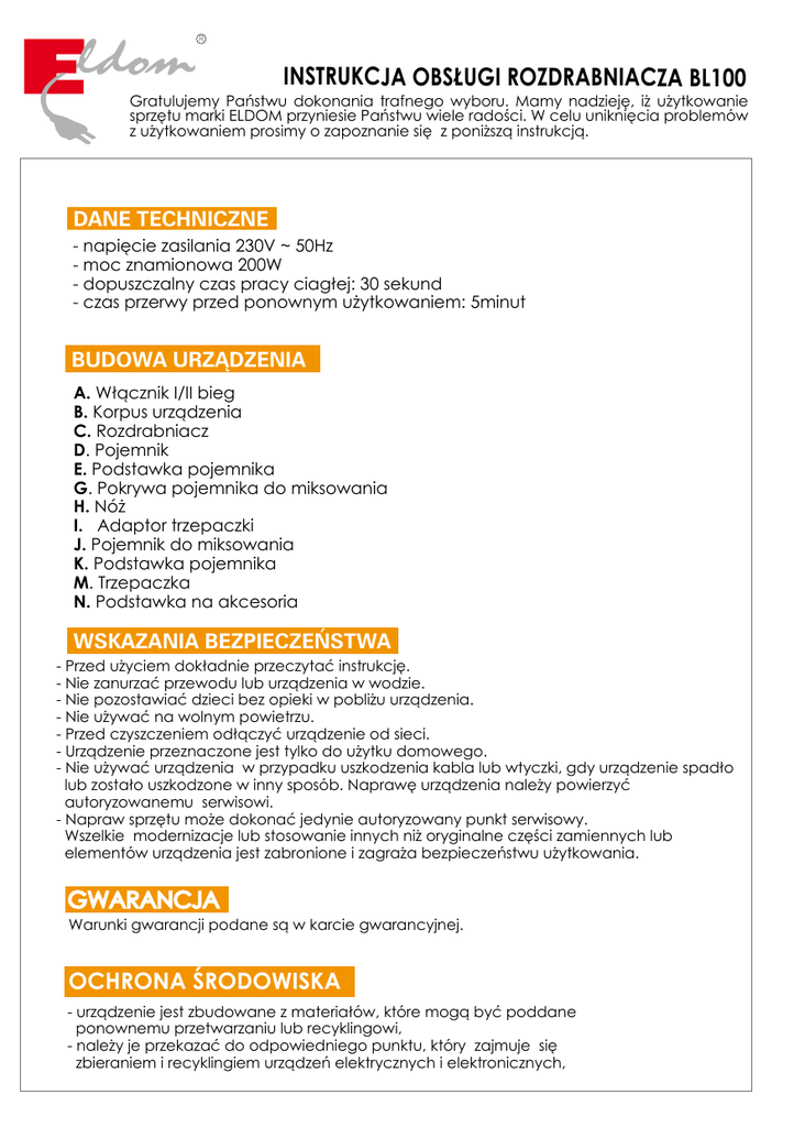 R INSTRUKCJA OBSŁUGI ROZDRABNIACZA BL100 Gratulujemy Państwu dokonania trafnego wyboru. Mamy nadzieję, iż użytkowanie sprzętu marki ELDOM przyniesie Państwu wiele radości. W celu uniknięcia problemów z użytkowaniem prosimy o zapoznanie się z poniższą instrukcją. DANE TECHNICZNE - napięcie zasilania 230V ~ 50Hz - moc znamionowa 200W - dopuszczalny czas pracy ciagłej: 30 sekund - czas przerwy przed ponownym użytkowaniem: 5minut BUDOWA URZĄDZENIA A. Włącznik I/II bieg B. Korpus urządzenia C. Rozdrabniacz D. Pojemnik E. Podstawka pojemnika G. Pokrywa pojemnika do miksowania H. Nóż I. Adaptor trzepaczki J. Pojemnik do miksowania K. Podstawka pojemnika M. Trzepaczka N. Podstawka na akcesoria WSKAZANIA BEZPIECZEŃSTWA - Przed użyciem dokładnie przeczytać instrukcję. - Nie zanurzać przewodu lub urządzenia w wodzie. - Nie pozostawiać dzieci bez opieki w pobliżu urządzenia. - Nie używać na wolnym powietrzu. - Przed czyszczeniem odłączyć urządzenie od sieci. - Urządzenie przeznaczone jest tylko do użytku domowego. - Nie używać urządzenia w przypadku uszkodzenia kabla lub wtyczki, gdy urządzenie spadło lub zostało uszkodzone w inny sposób. Naprawę urządzenia należy powierzyć autoryzowanemu serwisowi. - Napraw sprzętu może dokonać jedynie autoryzowany punkt serwisowy. Wszelkie modernizacje lub stosowanie innych niż oryginalne części zamiennych lub elementów urządzenia jest zabronione i zagraża bezpieczeństwu użytkowania. GWARANCJA Warunki gwarancji podane są w karcie gwarancyjnej. OCHRONA ŚRODOWISKA - urządzenie jest zbudowane z materiałów, które mogą być poddane ponownemu przetwarzaniu lub recyklingowi, - należy je przekazać do odpowiedniego punktu, który zajmuje się zbieraniem i recyklingiem urządzeń elektrycznych i elektronicznych, CZYSZCZENIE I KONSERWACJA Przed przystąpieniem do czyszczenia wyjąć wtyczkę z gniazdka. Urządzenia nie wolno zanurzać w wodzie. Mikser wytrzeć wilgotną szmatką lub ręcznikiem. Rozdrabniacz (C) w celu umycia można odłączyć od miksera (B). Można go myć wodą z dodatkiem płynu do mycia naczyń. Nie wolno go zanurzać całkowicie w wodzie. Zanurzać można tylko końcówkę z nożem. UŻYTKOWANIE URZĄDZENIA Przed pierwszym użyciem należy wszystkie elementy poza korpusem dokładnie umyć i wysuszyć. Duży pojemnik (D) służy jedynie jako naczynie pomocnicze a jego kształt ogranicza możliwość chlapania np. przy ubijaniu białek. Trzepaczka (M) służy tylko do ubijania jajek. Używanie trzepaczki do innych produktów spowoduje uszkodzenie urządzenia. Nie wolno używać urządzenia do rozdrabniania lodu, kości i innych twardych produktów lub do mielenia orzechów, kawy i suszonych roślin strączkowych. Jeśli urządzenie się zablokuje, należy przed wyczyszczeniem wyłączyć je z sieci. Nóż rozdrabniacza (C) oraz nóż (H) są bardzo ostre. Można je dotykać tylko A przy wyłączonym z sieci urządzeniu i D dopiero jak nóż się zatrzyma. Należy przestrzegać czsu pracy ciągłej B E urządzenia. Przekroczenie czasu pracy oraz brak wystarczających przerw w pracy urządzenia mogą doprowadzić do nieodwracalnego uszkodzenia silnika. C Pojemniki (D,J) nie nadają się do mycia w zmywarce i do przechowywania produktów w lodówce. Akcesoria i rys. 1 pojemniki nie są przystosowane do przygotowywania gorących potraw. Jeżeli urządzenie zwalnia podczas miksowania lub ubijania należy przerwać pracę i w miarę możliwości rozrzedzić miksowany lub ubijany I produkt. SKŁADANIE URZĄDZENIA Montaż rozdrabniacza przedstawia rysunek 1. Rysunek 2 prezentuje montaż korpusu ze zbiornikiem do miksowania. Montaż trzepaczki przedstawiono na rysunku 3. Rysunek 4 przedstawia sposób zmontowania urządzenia w celu przechowywania. M G rys. 3 H N J rys. 4 E rys. 2 Eldom sp. z o.o. Pa w ł a C h r o m i k a 5 a , 4 0 - 2 3 8 Ka t o w i c e , P O L A N D tel: (032)255-33-40, fax: (032)253-04-12 w w w. e l d o m . e u