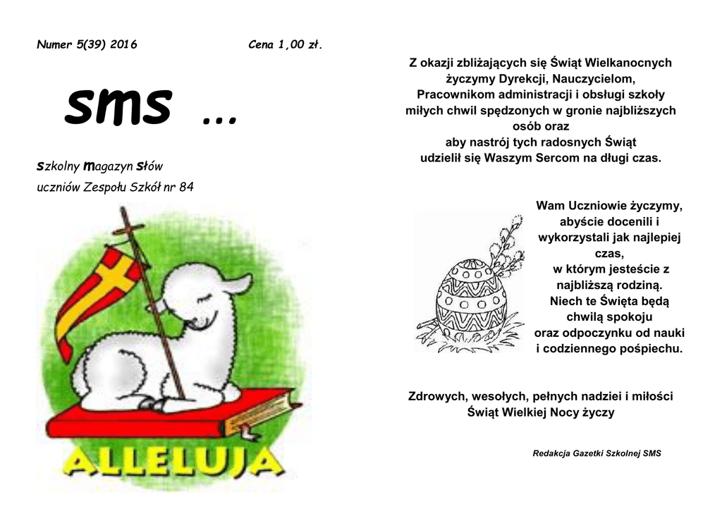 Numer 5(39) 2016 sms … szkolny magazyn słów Cena 1,00 zł. Z okazji zbliżających się Świąt Wielkanocnych życzymy Dyrekcji, Nauczycielom, Pracownikom administracji i obsługi szkoły miłych chwil spędzonych w gronie najbliższych osób oraz aby nastrój tych radosnych Świąt udzielił się Waszym Sercom na długi czas. uczniów Zespołu Szkół nr 84 Wam Uczniowie życzymy, abyście docenili i wykorzystali jak najlepiej czas, w którym jesteście z najbliższą rodziną. Niech te Święta będą chwilą spokoju oraz odpoczynku od nauki i codziennego pośpiechu. Zdrowych, wesołych, pełnych nadziei i miłości Świąt Wielkiej Nocy życzy Redakcja Gazetki Szkolnej SMS Przenieśmy się więc do czasów przed tamtą pamiętną niedzielą... Wielkanoc Najstarszym i najważniejszym świętem chrześcijaństwa jest Wielkanoc, nazywana przez niektórych również Zmartwychwstaniem Pańskim. Święto to obchodzone jest przez Kościoły Chrześcijańskie na całym świecie. Aby dobrze przygotować się do obchodów tego święta w kościele poprzedza je wielki tydzień. Jest to okres w którym wspominane są najważniejsze dla chrześcijańskiej wiary wydarzenia. Jednak najbardziej uroczyste są trzy ostatnie dni czyli wielki czwartek, wielki piątek i wielka sobota zwane również Triduum Paschalne. Wielkanocna Niedziela rozpoczyna się już w sobotę tuż po zachodzie słońca. (i) Czym jest Wielkanoc dla chrześcijanina? Wielkanoc, Wielka Niedziela, uroczyste śniadanie wielkanocne – terminy te są wśród nas powszechnie znane. Czy jednak każdy z nas wie co kryje się pod tą pozornie łatwą i jasną nazwą? Święta Wielkanocne to najstarsza i najważniejsza uroczystość dla chrześcijan – upamiętnia Zmartwychwstanie Jezusa Chrystusa. W chrześcijaństwie każda niedziela jest pamiątką zmartwychwstania, jednak ta przypadająca na marzec lub kwiecień jest najbardziej uroczysta. Towarzyszą jej tradycyjne wiosenne porządki, stosy pisanek, żółciutkie kurczaczki, cukrowe baranki, pięknie przystrojone bukszpanem święconki, ale również piątkowe drogi krzyżowe, niedzielne gorzkie żale oraz postanowienia wielkopostne, trwające 40 dni. Czy te ostatnie „skojarzenia” pasują do tych najbardziej popularnych? Nie są już tak kolorowe, nie nadają się do wiosennego klimatu, gdy cały świat budzi się do życia po zakończonej zimie. W takim razie, po co w ogóle istnieją? Przecież sama nazwa „Wielkanoc” przekazuje nam radosne, pozytywne uczucia. Jezus zmartwychwstał. To chyba wystarczający powód do radości, prawda? -3- Około 46 dni wcześniej. W tym dniu zaczyna się Twój pobyt na pustyni, pozostajesz na niej przez 40 niełatwych dni. Wiedz jednak, że idziesz na te niezmierzone piaski bez przymusu, chcesz tego. Zapewne już trudno nam sobie to wyobrazić – głód i pragnienie, upał i samotność. A to przecież jeszcze nie wszystko, nie możemy zapomnieć o pokusach szatana, które, nie da się ukryć, są dość trudne do odparcia. Zamień kamień w chleb, skoro możesz, a głód ci doskwiera. Nie. Rzuć się w przepaść, skoro Bóg i tak cię uchroni. Nie. Ukłoń się, tylko raz, a otrzymasz wszystkie bogactwa świata. Nie. Dałbyś radę? Pustynia jest wielka, niezmierzona, wydaje się być bezgraniczna, a z drugiej strony - pusta. Jesteś tylko Ty i piasek, który nie jest raczej najciekawszy, a po 40 dniach zapewne będziesz mieć dosyć. Wobec tego odejmijmy piasek. Zostajesz Ty, a razem z Tobą Twoje myśli. Masz wystarczająco dużo czasu, aby dokładnie przeanalizować, minuta po minucie, klatka po klatce, jak w filmie, swoje własne życie. Co było dobre, a co złe? Chciałbyś coś poprawić? A może jest coś, czego wyjątkowo żałujesz, chcesz wymazać z pamięci, ale nie możesz, gdyż jesteś sam – Ty i myśli. A teraz pomyśl, że to było jedynie przygotowanie do czegoś większego, trudniejszego, ważniejszego i zleconego „z góry”. Próba Twojej woli, Twego serca, zachowań, myśli – innymi słowy – próba Ciebie. 3 dni przed pamiętną niedzielą. Otrzymujesz wyrok śmierci, jednak nie histeryzujesz, nie boisz się, a pokornie bierzesz krzyż na ramiona. Wiesz, że to jest Twoja szansa, a to wszystko ma swój cel. Zdołasz to sobie wyobrazić? Upadasz, jednak po chwili wstajesz, gdyż widzisz swą ukochaną mamę. Ktoś, wypchnięty przez tłum, niechętnie pomaga Ci dźwigać ciężar, ktoś ociera Ci twarz z potu i krwi, a to daje Ci siłę w duszy. Mimo to znów upadasz, ale wstajesz, by pocieszyć płaczące i bezradne kobiety, ponieważ stale wierzysz w swój cel i chcesz, by one również w niego uwierzyły. Upadasz po raz trzeci, ale wstajesz, bo wiesz, że cel jest blisko. Nie zwracasz uwagi na to, co mówią czy robią inni. Jeden gwóźdź, drugi, trzeci – czy potrafimy wyobrazić sobie ten ból? -4- Jednak wiesz, że jest to nieuniknione, cierpisz w ciszy, aż w końcu powoli umierasz. Pamiętna niedziela. Wstajesz ze swego grobu, budzisz się, oczyszczony, wolny, jak nowonarodzony. To początek nowego życia! Wierzysz, że wszystko teraz będzie lepiej. W końcu pozbyłeś się tego, czego tak żałowałeś, jednak nie od tak – cierpiałeś i pracowałeś na to, a teraz już wiesz, że Twoja pokuta się opłaciła! Opłaciła się Tobie. A Jezus zrobił to wszystko dla innych. Dla mnie, dla Ciebie, dla wszystkich ludzi. Bóg kocha nas do tego stopnia, że zesłał na ziemię Swego Syna i poświęcił go za nas. Nie chciał naszego cierpienia, dlatego poświęcił Jezusa Chrystusa, który umarł na krzyżu za nasze grzechy i odpuścił je. Mało to daje nam szansę nowego życia. Według mnie, Wielki Post jest dla chrześcijanina czasem powrotu do wydarzeń Triduum Paschalnego i okazją do przeżycie własnego żalu i wstydu, za to, co miało miejsce we wspomnianym wcześniej czasie. Jest chwilą indywidualnych przemyśleń nad własnym życiem i żałowania za nasze grzechy. Uświadomienia sobie, 