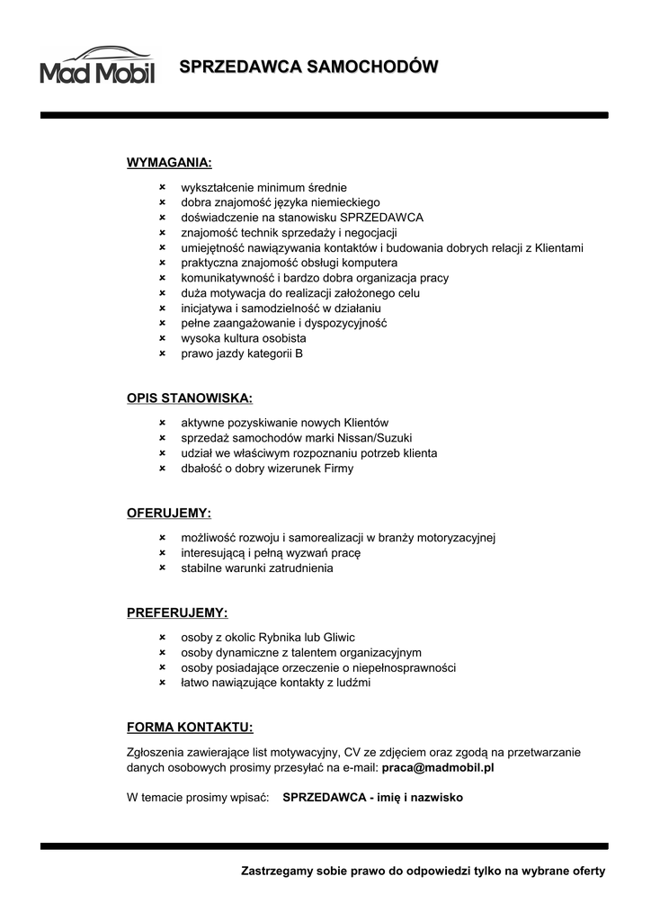 SPRZEDAWCA SAMOCHODÓW WYMAGANIA: wykształcenie minimum średnie dobra znajomość języka niemieckiego doświadczenie na stanowisku SPRZEDAWCA znajomość technik sprzedaży i negocjacji umiejętność nawiązywania kontaktów i budowania dobrych relacji z Klientami praktyczna znajomość obsługi komputera komunikatywność i bardzo dobra organizacja pracy duża motywacja do realizacji założonego celu inicjatywa i samodzielność w działaniu pełne zaangażowanie i dyspozycyjność wysoka kultura osobista prawo jazdy kategorii B OPIS STANOWISKA: aktywne pozyskiwanie nowych Klientów sprzedaż samochodów marki Nissan/Suzuki udział we właściwym rozpoznaniu potrzeb klienta dbałość o dobry wizerunek Firmy OFERUJEMY: możliwość rozwoju i samorealizacji w branży motoryzacyjnej interesującą i pełną wyzwań pracę stabilne warunki zatrudnienia PREFERUJEMY: osoby z okolic Rybnika lub Gliwic osoby dynamiczne z talentem organizacyjnym osoby posiadające orzeczenie o niepełnosprawności łatwo nawiązujące kontakty z ludźmi FORMA KONTAKTU: Zgłoszenia zawierające list motywacyjny, CV ze zdjęciem oraz zgodą na przetwarzanie danych osobowych prosimy przesyłać na e-mail: [email protected] W temacie prosimy wpisać: SPRZEDAWCA - imię i nazwisko Zastrzegamy sobie prawo do odpowiedzi tylko na wybrane oferty