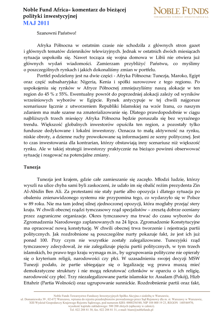 Noble Fund Africa– komentarz do bieżącej polityki inwestycyjnej MAJ 2011 Szanowni Państwo! Afryka Północna w ostatnim czasie nie schodziła z głównych stron gazet i głównych tematów dzienników telewizyjnych. Jednak w ostatnich dwóch miesiącach sytuacja uspokoiła się. Nawet tocząca się wojna domowa w Libii nie otwiera już głównych wydań wiadomości. Zamierzam przybliżyć Państwu, co myślimy o poszczególnych rynkach i jakich dokonaliśmy zmian w portfelu. Portfel podzielony jest na dwie części - Afryka Północna: Tunezja, Maroko, Egipt oraz część subsaharyjska: Nigeria, Kenia i spółki surowcowe z tego regionu. Po uspokojeniu się rynków w Afryce Północnej zmniejszyliśmy naszą alokacje w ten region do 45 % z 55%. Ewentualny powrót do poprzedniej alokacji zależy od wyników wrześniowych wyborów w Egipcie. Rynek antycypuje w tej chwili najgorsze scenariusze łącznie z utworzeniem Republiki Islamskiej na wzór Iranu, co naszym zdaniem ma małe szanse na zmaterializowanie się. Dlatego prawdopodobnie w ciągu najbliższych trzech miesięcy Afryka Północna będzie poruszała się bez wyraźnego trendu. Większość globalnych inwestorów opuściła ten region, a pozostały tylko fundusze dedykowane i lokalni inwestorzy. Oznacza to małą aktywność na rynku, niskie obroty, a dzienne ruchy prowokowane są informacjami ze sceny politycznej. Jest to czas inwestowania dla kontrarian, którzy obstawiają inny scenariusz niż większość rynku. Ale w takiej strategii inwestorzy praktycznie na bieżąco powinni obserwować sytuację i reagować na potencjalne zmiany. Tunezja Tunezja jest krajem, gdzie całe zamieszanie się zaczęło. Młodzi ludzie, którzy wyszli na ulice chyba sami byli zaskoczeni, że udało im się obalić reżim prezydenta Zin Al-Abidin Ben Ali. Za protestami nie stały partie albo opozycja i dlatego sytuacja po obaleniu znienawidzonego systemu nie przypomina tego, co wydarzyło się w Polsce w 89 roku. Nie ma tam jednej silnej zjednoczonej opozycji, która mogłaby przejąć stery kraju. W chwili obecnej rządzi tymczasowy rząd specjalistów – zresztą dobrze oceniany przez zagraniczne organizacje. Okres tymczasowy ma trwać do czasu wyborów do Zgromadzenia Narodowego zaplanowanych na 24 lipca. Zgromadzenie Konstytucyjne ma opracować nową konstytucję. W chwili obecnej trwa tworzenie i rejestracja partii politycznych. Jak rozdrobnione są poszczególne nurty pokazuje fakt, że jest ich już ponad 100. Przy czym nie wszystkie zostały zalegalizowane. Tunezyjski rząd tymczasowy zdecydował, że nie zalegalizuje pięciu partii politycznych, w tym trzech islamskich, bo prawo tego kraju wymaga m.in., by ugrupowania polityczne nie opierały się o kryterium religii, narodowości czy płci. W uzasadnieniu swojej decyzji MSW Tunezji podało, że partie ubiegające się o legalizację wg prawa muszą mieć demokratyczne struktury i nie mogą rekrutować członków w oparciu o ich religię, narodowość czy płeć. Trzy niezalegalizowane partie islamskie to: Assalam (Pokój), Hizb Ettahrir (Partia Wolności) oraz ugrupowanie sunnickie. Rozdrobnienie partii oraz fakt, Noble Funds Towarzystwo Funduszy Inwestycyjnych Spółka Akcyjna z siedzibą w Warszawie, ul. Domaniewska 39 , 02-672 Warszawa, wpisana do rejestru przedsiębiorców prowadzonego przez Sąd Rejonowy dla m. st. Warszawy w Warszawie, XIII Wydział Gospodarczy Krajowego Rejestru Sądowego, pod numerem KRS: 0000256540, NIP 108 000 19 23, REGON 140546970, wysokość kapitału zakładowego: 500 200 złotych (opłacony w całości). Tel. 022 288 81 30, fax. 022 288 81 31, e-mail: [email protected] Noble Fund Africa– komentarz do bieżącej polityki inwestycyjnej MAJ 2011 że część z nich prawdopodobnie nie będzie mogła legalnie wystartować w wyborach zwiększa niepewność co do dalszego rozwoju sytuacji ekonomicznej. Coś co czeka nie tylko Tunezje, ale również pozostałe kraje arabskie to nauczenie się zasad funkcjonowania demokracji. I największym wyzwaniem będzie pogodzenie się, że jak nie jest się zwycięzcą wyborów trzeba zaakceptować oponentów jako legalną władzę w kraju. To największe wyzwanie krajów arabskich wchodzących na drogę demokratyzacji. W sferze ekonomicznej widzimy negatywny wpływ rewolucji. Oczekiwany wzrost PKB na ten rok jest na poziomie zero. Nie powinno to budzić zdziwienia, bo ostatni okres to czas bardziej przyglądania się, co się dzieje niż znaczących decyzji inwestycyjnych, czy znaczących zakupów konsumpcyjnych. Widzimy to również w sferze turystki, gdzie dotychczasowa sprzedaż ofert wycieczkowych jest na niższym poziomie niż rok wcześniej. A turystyka to ponad 5% PKB Tunezji. Jako inwestorzy kupujący spółki giełdowe kupujemy przyszłość spółek i dlatego patrzymy na to co przyniesie rok 2012. Obecnie firmy notowane są na poziomie 16 PE (cena/zysk) za ostatnie 4 kwartały. I patrząc na zachowanie rynku w tym roku – spadki o 20% - obecna sytuacja makroekonomiczna jest już zawarta w cenach. Poprawa w roku 2012 nie jest jeszcze uwzględniona w wycenach spółek, ale żeby została uwzględniona najpierw muszą przejść w miarę spokojny sposób wybory parlamentarne. Nasz portfel pozostaje bez zmian. Poza sektorem finansowym skupiamy się na dwóch konglomeratach Poulina Group i Tunisie Aluminium Profile. Kiedy kurz opadnie, dywersyfikacja regionalna powinna być ponownie doceniona przez inwestorów. Egipt Egipt jest wyznacznikiem tego, w którą stronę mogą pójść kraje arabskie. Dlatego ze szczególną uwagą inwestorzy będą śledzić planowane wybory parlamentarne i prezydenckie we wrześniu. Zaraz po ponownym uruchomieniu giełdy spotkaliśmy się z 80% spółek, które mieliśmy w portfelu. Firmy były bardzo optymistyczne co do przyszłości. My podeszliśmy z większą rezerwą do tego, co przedstawiały nam zarządy spółek. Spotkanie z Ministrem Finansów rządu Egipskiego utwierdził