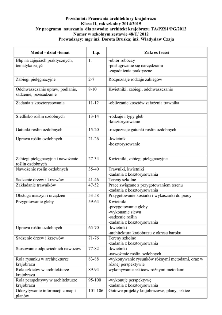 Przedmiot: Pracownia architektury krajobrazu Klasa II, rok szkolny 2014/2015 Nr programu nauczania dla zawodu; architekt krajobrazu TA/PZS1/PG/2012 Numer w szkolnym zestawie 48/T/ 2012 Prowadzący: mgr inż. Dorota Bruska; inż. Władysław Czaja Moduł - dział -temat L.p. Zakres treści Bhp na zajęciach praktycznych, tematyka zajęć 1. -ubiór roboczy -posługiwanie się narzędziami -zagadnienia praktyczne Zabiegi pielęgnacyjne 2-7 Rozpoznaje rodzaje zabiegów Odchwaszczanie upraw, podlanie, sadzenie, przesadzanie 8-10 Kwietniki, zabiegi, odchwaszczanie Zadania z kosztorysowania 11-12 -obliczanie kosztów założenia trawnika Siedlisko roślin ozdobnych 13-14 -rodzaje i typy gleb -kosztorysowanie Gatunki roślin ozdobnych 15-20 -rozpoznaje gatunki roślin ozdobnych Uprawa roślin ozdobnych 21-26 -kwietnik -kosztorysowanie Zabiegi pielęgnacyjne i nawożenie roślin ozdobnych Nawożenie roślin ozdobnych 27-34 Kwietniki, zabiegi pielęgnacyjne 35-40 Sadzenie drzew i krzewów Zakładanie trawników 41-46 47-52 Obsługa maszyn i urządzeń Przygotowanie gleby 53-58 59-64 Uprawa roślin ozdobnych 65-70 Sadzenie drzew i krzewów 71-76 Stosowanie odpowiednich nawozów 77-82 Rola rysunku w architekturze krajobrazu Rola szkiców w architekturze krajobrazu Rola perspektywy w architekturze krajobrazu Odczytywanie informacji z map i planów 83-88 Trawniki, kwietniki -zadania z kosztorysowania Tereny szkolne Prace związane z przygotowaniem terenu -zadania z kosztorysowania Przygotowanie kosiarki i wykaszarki do pracy Kwietniki -przygotowanie gleby -wykonanie siewu -sadzenie roślin -zadania z kosztorysowania -kwietniki -architektura krajobrazu z okresu baroku Tereny szkolne -zadania z kosztorysowania -kwietniki -nawożenie roślin ozdobnych -wykonywanie rysunków różnymi metodami, oraz w różnej perspektywie wykonywanie szkiców różnymi metodami 89-94 95-100 101-106 -wykonuję perspektywę -zadania z kosztorysowania Gotowe projekty krajobrazowe, plany, szkice Moduł - dział -temat L.p. Plac budowy 107-112 Uprawa roślin ozdobnych Historia architektury Uprawa roślin ozdobnych Historia architektury Uprawa roślin ozdobnych, historia architektury Uprawa roślin ozdobnych, wykonywanie zabiegów związanych z uprawą i nawożeniem gleby 113-118 Uprawa roślin ozdobnych Plac budowy 137-142 143-148 Odczytywanie informacji z map i planów Uprawa roślin ozdobnych 149-154 Przygotowanie gleby do uprawy 161-166 Odchwaszczanie upraw, podlanie, sadzenie, przesadzanie Nawożenie roślin ozdobnych 167-172 Obsługa maszyn i urządzeń Godziny do dyspozycji nauczyciela 179-180 181-186 119-124 125-130 131-136 155-160 173-178 Zakres treści Organizacja terenu budowy -zadania z kosztorysowania -kwietniki -architektura krajobrazu z okresu renesansu Kwietniki architektura krajobrazu z okresu XIX wieku -kwietniki, architektura krajobrazu z okresu XX wieku -kwietniki -nawożenie roślin -przygotowanie gleby -zadania z kosztorysowania Kwietnik zabiegi pielęgnacyjne odchwaszczanie Organizacja terenu budowy -zadania z kosztorysowania Gotowe projekty krajobrazowe, plany, szkice -kwietniki -przygotowanie gleby -wykonanie siewu -sadzenie roślin -zadania z kosztorysowania Kwietniki -przygotowanie gleby -wykonanie siewu -sadzenie roślin -zadania z kosztorysowania Kwietniki, zabiegi, odchwaszczanie -zadania z kosztorysowania Trawniki, kwietniki -zadania z kosztorysowania Przygotowanie kosiarki i wykaszarki do pracy