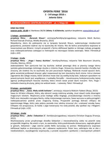 OFERTA FERIE '2016 1 - 14 lutego 2016 r. Jelenia Góra JELENIOGÓRSKIE CENTRUM KULTURY - ul. 1 Maja 60 KINO NA FERIE zawsze godz. 10.00 ul. Bankowa 28/30 (bilety: 5 zł/dziecko, opiekun bezpłatnie; www.bilety.jck.pl) 1 lutego - poniedziałek projekcja filmu - „Baranek Shaun”, animacja/familijny/przygodowy; reżyseria Mark Burton, Richard Starzak (Francja, Wielka Brytania, 2015) Niepokorny, skory do pakowania się w tarapaty baranek Shaun, wykorzystując nieobecność gospodarza, postawia wybrać się na wycieczkę do miasta. Nie do końca przemyślana wyprawa w towarzystwie psa Bitzera i innych przyjaciół z farmy obfitować będzie w różnego rodzaju przygody oraz niebezpieczeństwa czekające w metropolii na nieznające świata zwierzęta. Tekst: Filmweb.pl (info z JCK) 3 lutego - środa projekcja filmu - „Hugo i łowcy duchów”, familijny/fantazy; reżyseria Tobi Baumann (Austria, Irlandia, Niemcy, 2015) Jedenastoletni Tom panicznie boi się duchów. Jednak pewnego dnia w piwnicy swego domu spotyka galaretowatego zielonego duszka o imieniu Hugo. Dziwaczny stworek bardzo chciałby być straszny, ale średnio mu to wychodzi, bo jest poczciwym fajtłapą. Nieborak musiał opuścić dom, gdzie wcześniej próbował straszyć, gdyż rozpanoszył się tam starożytny duch zimna. Intruz stanowi zagrożenie dla całego miasta, które wkrótce może stać się wielką bryłą lodu. Jedynym sposobem na powstrzymanie bestii jest współpraca z Leokadią Parzydło - nieustraszoną funkcjonariuszką tajnej agencji profesjonalnych łowców duchów, która chroni świat przed złymi mocami. Tom, Hugo i Leokadia stworzą drużynę, jakiej nie widział świat... i zaświaty. Tekst: Filmweb.pl 8 lutego - poniedziałek projekcja filmu - „Sawa. Mały wielki bohater”, animacja; reżyseria Maksim Fadeev (Rosja, 2015) Sawa to 10-letni chłopiec, który, aby obronić swoją rodzinną wioskę, musi stawić czoła złowrogim magicznym istotom. Wspierany przez białego wilka Angiego, przezabawnego stworka o imieniu Pafik oraz niezwykle czarującą Nanty, córkę miejscowego szamana, Sawa wyrusza w pełną przygód i niebezpieczeństw podróż przez magiczną krainę. Przyjaciele pomogą dotrzeć chłopcu do tajemniczego Maga, który jako jedyny posiada moc zdolną zniszczyć zło i uratować wioskę Sawy. Chłopiec nie przypuszcza, że każdy z jego towarzyszy ma swój powód, aby spotkać się z Magiem. Filmweb.pl (info z JCK) 10 lutego - środa projekcja filmu - „Bella i Sebastian 2”, familijny/przygodowy; reżyseria Christian Duguay (Francja, 2015) Wychowywany przez przybranego dziadka Sebastian z niecierpliwością czeka na powrót swej przyjaciółki Angeliny. Na wieść o tym, że awionetka, którą podróżowała dziewczyna, zaginęła gdzieś w górach, Sebastian i jego wierne psisko Bella wyruszają na pomoc. Niebezpieczna wyprawa obfitować będzie w dramatyczne, ale i zabawne wydarzenia. Pożar lasu, zetknięcie oko w oko z niedźwiedziem, wysokogórska wspinaczka, a przede wszystkim spotkanie z nieznajomym pilotem okażą się dla chłopca i jego psa początkiem zupełnie nowej, niespodziewanej przygody. W jej trakcie Sebastian trafi na ślad swego zaginionego ojca. Tekst: Filmweb.pl(info z JCK) PRZYSTAŃ TWÓRCZA - CIEPLICKIE CENTRUM KULTURY - ul. Cieplicka 74 1 - 5 lutego zimowe eco warsztaty dziecięce "Coś z niczego" dla dzieci w wieku 6-10 lat; w trakcie zajęć poznamy zasady ekologii, stworzymy wspólnie ekologiczne zabawki oraz wykonamy wiele ciekawych, oryginalnych i niepowtarzalnych rzeczy, których nie dostaniemy w sklepie; zaplanowano także wyjście na basen, czy lodowisko - godz. 8.00-16.00 (liczba miejsc ograniczona; opłata 160 zł; obiad, woda, herbata, bilety; zapisy osobiście w Przystani Twórczej; organizator zastrzega sobie prawo do zmiany programu warsztatów) 13 lutego - sobota Bajkowa Sobota Kreatywnej Rodzinki; w programie m. in. warsztaty rękodzieła dla rodziców i dzieci oraz animacje i konkursy; tematem przewodnim będą Walentynki, więc z pewnością nie zabraknie czerwonych serduszek i zaczarowanej atmosfery; każdy kto pragnie spędzić sobotę kreatywnie i twórczo powinien zawitać w nasze progi - godz. 11.00-14.00 (udział bezpłatny; liczba miejsc ograniczona; informacje tel. 75-712-28-92) MŁODZIEŻOWY DOM KULTURY - ul. M.Skłodowskiej-Curie 1 - 12 lutego zimowisko dla dzieci w wieku 6-10 lat; w programie m.in.: wycieczki krajoznawcze, konkurencje rekreacyjno-sportowe, warsztaty tematyczne, gry edukacyjne, konkursy z nagrodami, zajęcia sportowe w sali MOS - godz. 8.00-16.00 (opłata za tydzień - 120 zł; drugie śniadanie, obiad) I turnus 1 - 5 lutego II turnus 8 - 12 lutego informacja tel. 75-64-244-60 MUZEUM KARKONOSKIE - ul. Jana Matejki 28 2 - 12 lutego WARSZTATY; zapraszamy osoby indywidualne i grupy zorganizowane, dzieci i młodzież do wzięcia udziału w atrakcjach i warsztatach; w ramach warsztatów zwiedzanie muzeum z przewodnikiem; uczestnicy zapoznają się z różnymi technikami szklarskimi; zapewniamy materiały i miłą atmosferę godz. 10.00-13.00 (bilety: 8 zł; zapisy Dział Oświatowy tel. 75-64-55-078, sekretariat tel. 75-75234-65) 2 lutego - wtorek MASKA NA BAL - ozdobne maski z papieru 3 lutego - środa WITRAŻ DLA NAJMŁODSZYCH 4 lutego - czwartek BAŁWANEK ZE SZKŁA - dziecięcy recykling 5 lutego - piątek SPOTKANIE Z JÓZEFINĄ - czytanie szklanej legendy, oprowadzanie, zajęcia plastyczne 9 lutego - wtorek PRZEŹROCZYSTE OBRAZKI - malarstwo 10 lutego - środa DREWNIANE ŚNIEŻYNKI - dziecięcy recykling 11 lutego - czwartek KRYSZTAŁOWE LAMPIONY - dziecięcy recykling 12 lutego - piątek ZIMA ZAKLĘTA W SŁOIKU - dziecięcy recykling MUZEUM MIEJSKIE "DOM GERHARTA HAUPTMANNA" ul. Michałowicka 32, dla grup zorganizowanych, informacja tel. 75-75-532-86 MOJE SPOTKANIE W MUZEUM - lekcja dla dzieci w wieku 6-10 lat Lekcja wiąże się ściśle z zagadnieniami z zakresu sztuki i kultury. Bezpośredni dostęp do zbior