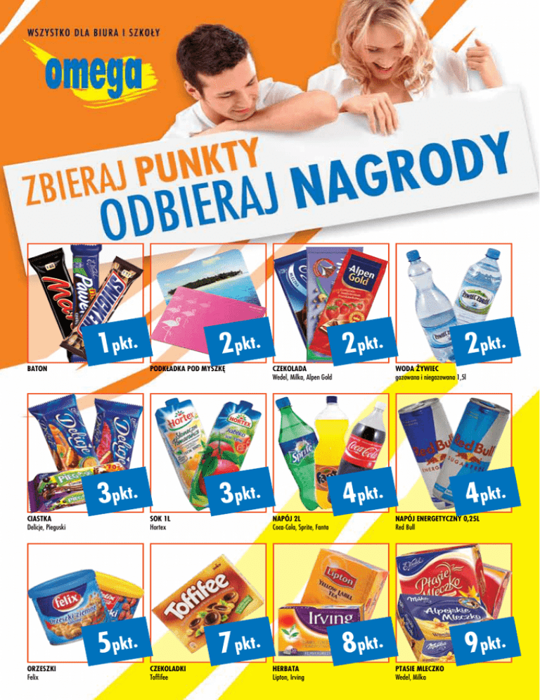 1pkt. baton 2pkt. podkładka pod myszkę 3pkt. ciastka Delicje, Pieguski czekolada Wedel, Milka, Alpen Gold 3pkt. sok 1l Hortex 5pkt. orzeszki Felix 2pkt. woda Żywiec gazowana i niegazowana 1,5l 4pkt. napój 2l Coca-Cola, Sprite, Fanta 7pkt. czekoladki Toffifee 2pkt. 4pkt. napój energetyczny 0,25l Red Bull 8pkt. herbata Lipton, Irving 9pkt. ptasie mleczko Wedel, Milka 9pkt. kawa mielona Jacobs Krönung rozdzielacz gniazda zapalniczki samochodowej, Omega 14pkt. kawa rozpuszczalna Nescafe 15pkt. klawiatura Omega 10pkt. 15pkt. kawa w kapsułkach Dolce Gusto 15pkt. zestaw czyszczący do ekranów Omega 12pkt. myszka komputerowa Omega 15pkt. kawa rozpuszczalna Nescafe Creme 15pkt. zapach samochodowy Ambi Pur 12pkt. czekoladki Merci 15pkt. słuchawki z mikrofonem Omega 16pkt. kamera internetowa Omega 18pkt. 16pkt. pendrive 4gb Maxell czytnik kart Omega 35pkt. karta microsd 8gb z adapterem Maxell listwa zasilająca 5m Omega 35pkt. myszka bezprzewodowa Omega 27pkt. 25pkt. kawa rozpuszczalna Jacobs Krönung 40pkt. termometr elektroniczny Tech-Med 45pkt. pendrive 16gb Maxell 3D 45pkt. karta zakupowa 50 Empik 45pkt. podwójne zaproszenie na film Cinema City 50pkt. patelnia do naleśników Tefal 55pkt. podwójne zaproszenie na film 3d Cinema City 60pkt. Podwójne zaproszenie na mecz koszykówki 60pkt. patelnia Tefal 70pkt. woda toaletowa męska 100ml STR8 długopis lub pióro parker z indywidualnym grawerem 70pkt. shaker 80pkt. dzbanek filtrujący Brita 65pkt. waga łazienkowa Zelmer woda perfumowana damska 30ml Gabriela Sabatini 75pkt. torba na laptopa 80pkt. 70pkt. 75pkt. klocki Lego 80pkt. kijki nordic walking 85pkt. torba sportowa 90pkt. blender Bosch 90pkt. 90pkt. stacja pogodowa bezprzewodowa suszarka do włosów Bosch 90pkt. szczoteczka elektryczna Braun 95pkt. golarka męska Philips 100pkt. maszynka do strzyżenia Philips piłka fitness 95pkt. głosniki komputerowe Omega 100pkt. czajnik elektryczny Zelmer 90pkt. garnek Tefal 95pkt. piłka nożna Nike 100pkt. 105pkt. termowentylator 140pkt. 110pkt. sandwich Philips żelazko Tefal 150pkt. depilator Braun krzesło biurowe Nowy Styl wkrętarka akumulatorowa Skil 150pkt. robot kuchenny Zelmer 155pkt. 140pkt. 160pkt. urządzenie wielofunkcyjne HP wiertarka Bosch komplet parker z indywidualnym grawerem 150pkt. walizka na kółkach 145pkt. 150pkt. antena cb Sirio 160pkt. odkurzacz Zelmer 180pkt. 200pkt. czyścik parowy 200pkt. lodówka turystyczna elektryczna komplet garnków 12V/230V Tefal 250pkt. 240pkt. robot wieloczynnościowy Moulinex fotel gabinetowy Nowy Styl kuchenka mikrofalowa Amica aparat cyfrowy Olympus maszynka do mięsa Zelmer 250pkt. parowar Zelmer 270pkt. 250pkt. 230pkt. 210pkt. alkomat Sentech 300pkt. monitor led Asus 250pkt. 350pkt. nawigacja samochodowa Mio WARUNKI PROMOCJI 1. Dokonanie zakupu na fakturę w firmie OMEGA WSZYSTKO DLA BIURA. 2. Za każde wydane 100zł netto otrzymasz 1pkt. 3. Punkty można zbierać, sumować i wymieniać na cenne nagrody do 30.11.2012 r. 4. Faktury muszą być regulowane terminowo. 5. Wszystkie sporne sprawy rozstrzyga OMEGA WSZYSTKO DLA BIURA. 6. Szczegółowy regulamin Programu Zbieraj Punkty Odbieraj Nagrody jest dostępny w siedzibie firmy OMEGA WSZYSTKO DLA BIURA. 360pkt. wieża Panasonic 450pkt. ekspres ciśnieniowy na kapsułki Krups 450pkt. myjka ciśnieniowa Karcher 1200pkt. rower Giant 450pkt. drukarka laserowa kolorowa Samsung 550pkt. radio cb President ekspres ciśnieniowy Electrolux 600pkt. zestaw kina domowego LG 1400pkt. aparat cyfrowy lustrzanka Canon 450pkt. 1400pkt. laptop HP 700pkt. tablet 7 cali 1500pkt. telewizor led 32 cale Samsung