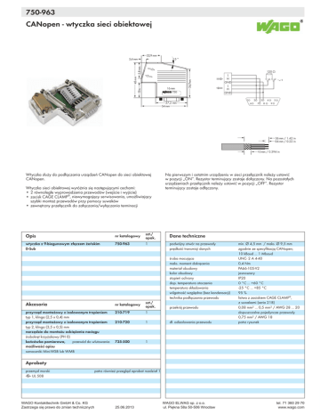750-963 10 CANopen - wtyczka sieci obiektowej 591 15 ° 16 mm w 750 <_____ 36,7mm _____> <_22,9 mm> < <_________45mm ________> < 5,8 mm > <_19m__> 5,4 mm> 120 Ω L H GND L H GND 1 <_____37,2 mm_____> <_____________54 mm_________> 2 6 3 7 4 8 __> __> __> Wtyczka służy do podłączania urządzeń CANopen do sieci obiektowej CANopen. Wtyczka sieci obiektowej wyróżnia się następującymi cechami: • 2 równoległe wyprowadzenia przewodów (wejście i wyjście) • zacisk CAGE CLAMP®, niewymagający serwisowania, umożliwiający szybki montaż przewodów przy pomocy suwaków • zewnętrzny przełącznik do załączania/wyłączania terminacji nr katalogowy szt./ opak. Dane techniczne wtyczka z 9-biegunowym złączem żeńskim D-Sub 750-963 1 podwójny otwór na przewody prędkość transmisji danych śruba mocująca maks. moment dokręcenia materiał obudowy kolor obudowy stopień ochrony dop. temperatura otoczenia temperatura składowania wilgotność względna (bez kondensacji) technika podłączania przewodu nr katalogowy szt./ opak. przyrząd montażowy z izolowanym trzpieniem typ 1, klinga (2,5 x 0,4) mm przyrząd montażowy z izolowanym trzpieniem typ 2, klinga (3,5 x 0,5) mm narzędzie do montażu odciążenia naciągu śrubokręt krzyżakowy (PH 0) końcówka pomiarowa, przewód do wlutowania możliwości opisu oznaczniki Mini-WSB lub WMB 210-719 1 210-720 1 735-500 1 <__36 mm / 1.42 in <__5-6 mm / 0.22 in <__10 mm / 0.394 in Na pierwszym i ostatnim urządzeniu w sieci przełącznik należy ustawić w pozycji „ON“. Rezystor terminujący zostaje dołączony. Na pozostałych urządzeniach przełącznik należy ustawić w pozycji „OFF“. Rezystor terminujący zostaje odłączony. Opis Akcesoria 5 9 przekrój przewodu dł. odizolowania przewodu min. Ø 4,5 mm / maks. Ø 9,5 mm zgodnie ze specyfikacją CANopen; 10 kBaud ... 1 Mbaud UNC- 2 A 4-40 0,4 Nm PA66-105-V2 jasnoszary IP20 0 °C ... +60 °C -25 °C ... +85 °C 95 % listwa z zaciskiem CAGE CLAMP®, z suwakami (seria 218) 0,08 mm² ... 0,5 mm² / AWG 28 ... 20 dopuszczalne pojedyncze przewody 0,75 mm² / AWG 18 patrz rysunek Aprobaty przemysł morski r UL 508 patrz również przegląd aprobat rozdział 1 10 :$*2.RQWDNWWHFKQLN*PE+&R.* :$*2(/:$*VS]RR =DVWU]HJDVLĊSUDZRGR]PLDQWHFKQLF]Q\FK XO3LĊNQDD:URFáDZ WHO ZZZZDJRFRP