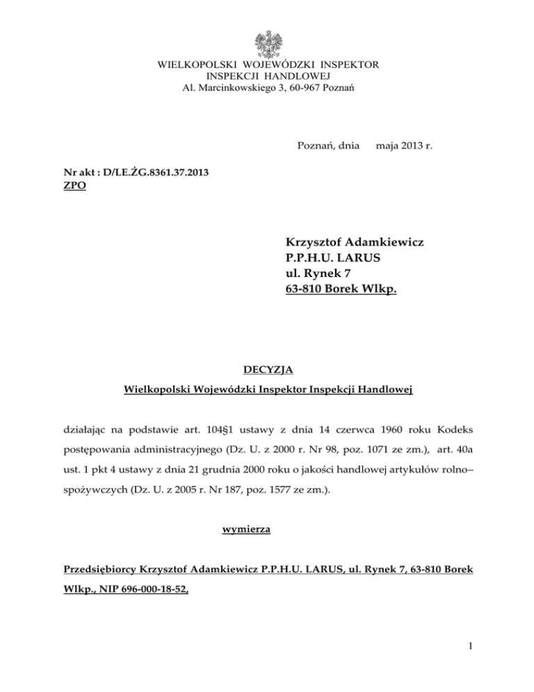 WIELKOPOLSKI WOJEWÓDZKI INSPEKTOR INSPEKCJI HANDLOWEJ Al. Marcinkowskiego 3, 60-967 Poznań Poznań, dnia maja 2013 r. Nr akt : D/LE.ŻG.8361.37.2013 ZPO Krzysztof Adamkiewicz P.P.H.U. LARUS ul. Rynek 7 63-810 Borek Wlkp. DECYZJA Wielkopolski Wojewódzki Inspektor Inspekcji Handlowej działając na podstawie art. 104§1 ustawy z dnia 14 czerwca 1960 roku Kodeks postępowania administracyjnego (Dz. U. z 2000 r. Nr 98, poz. 1071 ze zm.), art. 40a ust. 1 pkt 4 ustawy z dnia 21 grudnia 2000 roku o jakości handlowej artykułów rolno– spożywczych (Dz. U. z 2005 r. Nr 187, poz. 1577 ze zm.). wymierza Przedsiębiorcy Krzysztof Adamkiewicz P.P.H.U. LARUS, ul. Rynek 7, 63-810 Borek Wlkp., NIP 696-000-18-52, 1 karę pieniężną w wysokości 2.000,00 zł. (słownie: dwa tysiące złotych 00/100), wynikającą z art. 40a ust. 1 pkt 4 ustawy z dnia 21 grudnia 2000 roku o jakości handlowej artykułów rolno- spożywczych (Dz. U. z 2005 r. Nr 187, poz. 1577 ze zm.), z tytułu wprowadzenia do obrotu handlowego w dniu kontroli, tj. w dniu 15 lutego 2013 roku w hurtowni w Lesznie, ul. Lipowa 6, 64-100 Leszno, przedsiębiorca: Krzysztof Adamkiewicz P.P.H.U. LARUS, ul. Rynek 7, 63-810 Borek Wlkp., artykułów rolno-spożywczych zafałszowanych to jest: partia 50 kg tilapii IQF, bez skóry, bez ości, glazurowanej, w cenie 13,50 zł/kg, kraj pochodzenia: Chiny, importer: INTER MARINE Sp. z o.o., ul. Wolności 18, 81-237 Gdynia, wartości 708,75 zł, partia 20 kg limandy żółtopłetwej, filet IQF, glazurowanej, w cenie 15,00 zł/kg, kraj pochodzenia: Wietnam, importer: j. w., wartości 315,00 zł, z uwagi na: zawyżenie zawartości glazury o 5,6 % w przypadku tilapii, oraz o 6 % w przypadku limandy. Kontrolowany przedsiębiorca wprowadził zatem do obrotu artykuły rolnospożywcze zafałszowane co skutkuje zastosowaniem art. 40a ust. 1 pkt 4 ustawy o jakości handlowej artykułów rolno- spożywczych (Dz. U. z 2005, Nr 187 poz. 1577 ze zm.). „Kto wprowadza do obrotu artykuły rolno-spożywcze zafałszowane, podlega karze pieniężnej w wysokości nie wyższej niż 10% przychodu osiągniętego w roku rozliczeniowym poprzedzającym rok nałożenia kary, nie niższej jednak niż 1.000 zł”. 2 Uzasadnienie Podczas kontroli przeprowadzonej przez Wojewódzki Inspektorat Inspekcji Handlowej w Poznaniu Delegaturę w Lesznie, w dniach od 8 do 15 lutego 2013 roku w hurtowni w Lesznie, ul. Lipowa 6, 64-100 Leszno, przedsiębiorca: Krzysztof Adamkiewicz P.P.H.U. LARUS, ul. Rynek 7, 63-810 Borek Wlkp., stwierdzono zafałszowanie 2 partii ryb mrożonych ogólnej wartości 1.023,75 zł, to jest: partia 50 kg tilapii IQF, bez skóry, bez ości, glazurowanej, w cenie 13,50 zł/kg, kraj pochodzenia: Chiny, importer: INTER MARINE Sp. z o.o., ul. Wolności 18, 81-237 Gdynia, wartości 708,75 zł, partia 20 kg limandy żółtopłetwej, filet IQF, glazurowanej, w cenie 15,00 zł/kg, kraj pochodzenia: Wietnam, importer: j. w., wartości 315,00 zł, z uwagi na: zawyżenie zawartości glazury o 5,6 % w przypadku tilapii, oraz o 6 % w przypadku limandy. Wobec powyższego należy uznać, że kontrolowany wprowadził do obrotu artykuły rolno-spożywcze zafałszowane, co w myśl przepisów o jakości handlowej skutkuje zastosowaniem art. 40 a ust. 1 pkt 4 ustawy o jakości handlowej artykułów rolno-spożywczych (Dz. U. 2005, Nr 187 poz. 1577 ze zm.). „Kto wprowadza do obrotu artykuły rolno-spożywcze zafałszowane, podlega karze pieniężnej w wysokości nie wyższej niż 10% przychodu osiągniętego w roku rozliczeniowym poprzedzającym rok nałożenia kary, nie niższej jednak niż 1.000 zł”. Zgodnie z art. 3 pkt 10 ustawy o jakości handlowej artykułów rolno-spożywczych artykuł rolno-spożywczy zafałszowany to produkt, którego skład jest niezgodny z 3 przepisami dotyczącymi jakości handlowej poszczególnych artykułów rolnospożywczych, albo produkt, w którym zostały wprowadzone zmiany, w tym zmiany dotyczące oznakowania, mające na celu ukrycie jego rzeczywistego składu lub innych właściwości, jeżeli niezgodności te lub zmiany w istotny sposób naruszają interesy konsumentów, w szczególności jeżeli: a) dokonano zabiegów, które zmieniły lub ukryły jego rzeczywisty skład lub nadały mu wygląd produktu zgodnego z przepisami dotyczącymi jakości handlowej, b) w oznakowaniu podano nazwę niezgodną z przepisami dotyczącymi jakości handlowej poszczególnych artykułów rolno-spożywczych albo niezgodną z prawdą, c) w oznakowaniu podano niezgodne z prawdą dane w zakresie składu, pochodzenia, terminu przydatności do spożycia lub daty minimalnej trwałości, zawartości netto lub klasy jakości handlowej. Celem prawa żywnościowego jest szeroko rozumiana ochrona interesów konsumentów. Art. 8 rozporządzenia (WE) nr 178/2002 Parlamentu Europejskiego i Rady ustanawiającego ogólne zasady i wymagania prawa żywnościowego, powołującego Europejski Urząd ds. Bezpieczeństwa Żywności i ustanawiającego procedury w zakresie bezpieczeństwa żywności (Dz. Urz. UE L 31 z 01.02.2002 r. ze zm.) precyzuje, że celem tego prawa jest ochrona interesów konsumentów i umożliwienie im świadomego wyboru związanego ze spożywaną przez nich żywnością. Prawo żywnościowe ma przeciwdziałać oszukańczym lub podstępnym praktykom, fałszowaniu żywności oraz wszelkim innym praktykom mogącym wprowadzić konsumentów w błąd. Zgodnie z art. 17 wyżej cytowanego rozporządzenia odpowiedzialność za naruszenie prawa żywnościowego ponoszą wszyscy przedsiębiorcy, na każdym etapie produkcji, przetwarzania i dystrybucji w przedsiębiorstwach będących pod ich 4 kontrolą, oraz zapewniają zgodność tej żywności lub pasz z wymogami prawa żywnościowego właściwymi dla ich działalności a także zapewniają kontrolowanie przestrzegania tych wymogów. W kontekście powyższego Wielkopolski Wojewódzki Inspektor Inspekcji Handlowej uznał, iż zgodnie z art. 17 rozporządzenia (WE)
