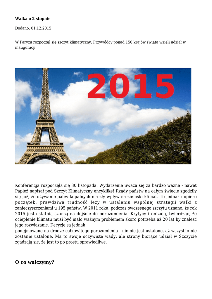 Walka o 2 stopnie Dodano: 01.12.2015 W Paryżu rozpoczął się szczyt klimatyczny. Przywódcy ponad 150 krajów świata wzięli udział w inauguracji. Konferencja rozpoczęła się 30 listopada. Wydarzenie uważa się za bardzo ważne - nawet Papież napisał pod Szczyt Klimatyczny encyklikę! Rządy państw na całym świecie zgodziły się już, że używanie paliw kopalnych ma zły wpływ na ziemski klimat. To jednak dopiero początek: prawdziwa trudność leży w ustaleniu wspólnej strategii walki z zanieczyszczeniami u 195 państw. W 2011 roku, podczas ówczesnego szczytu uznano, że rok 2015 jest ostatnią szansą na dojście do porozumienia. Krytycy ironizują, twierdząc, że ocieplenie klimatu musi być mało ważnym problemem skoro potrzeba aż 20 lat by znaleźć jego rozwiązanie. Decyzje są jednak podejmowane na drodze całkowitego porozumienia - nic nie jest ustalone, aż wszystko nie zostanie ustalone. Ma to swoje oczywiste wady, ale strony biorące udział w Szczycie zgadzają się, że jest to po prostu sprawiedliwe. O co walczymy? W 1992 roku w Rio spotkali się przedstawiciele państw, którym zależy na walce z zanieczyszczeniem planety. Podpisano konwencję (która weszła w życie w 1994 roku) i obecnie ratyfikowało ją już 195 państw, włączając Stany Zjednoczone. Uzupełnieniem ramowej konwencji z Rio jest protokół z Kioto, który z kolei mogą przyjąć tylko państwa już ratyfikujące konwencję z 1992 roku. Zadaniem przewidzianym do realizacji podczas tegorocznego Szczytu jest ustalenie wspólnej strategii w walce z ociepleniem klimatu. Chodzi o tytułowe 2 stopnie - naukowcy twierdzą, że jeśli średnia temperatura na Ziemi wzrośnie o dwie kreski na termometrze, to efekty mogą być niebezpieczne i będzie to miało nieprzewidywalny wpływ na globalny klimat. Dlatego właśnie wyznaczono cel: ograniczenie wzrostu temperatury przez redukcję emisji dwutlenku węgla. To, oczywiście, budzi spore kontrowersje w państwach opierających swoją produkcję energii na paliwach takich jak węgiel czy ropa. Politycy (wśród nich Barack Obama, Władimir Putin i Beata Szydło) są obecni na szczycie tylko w pierwszym dniu. Ich zadaniem jest wygłoszenie przemówień zachęcających negocjatorów do osiągnięcia kompromisu. Ministrowie Środowiska reprezentujący państwa biorące udział w Szczycie zjawią się na sam koniec, by po przeprowadzeniu rozmów spróbować osiągnąć ostateczny konsensus. Sprawa polska W ostatnich latach, Polska obniżyła emisję dwutlenku węgla o 30%. Stało się tak dzięki modernizacji przestarzałego sektora energetycznego. Podczas szczytu ma paść propozycja, by pójść jeszcze dalej i osiągnąć 40% redukcji do roku 2030. Wielu polskich polityków PiS nie zgadza się z warunkami przedstawionymi przez najsilniejsze kraje UE wraz ze Stanami Zjednoczonymi. Mówi się o możliwości zawetowania przez Polskę podpisania porozumienia. Według specjalistów, takie działania (czy właściwie: brak działań) mają na celu ochronę polskiej branży węglowej. Podczas poniedziałkowej konferencji prasowej, Beta Szydło przedstawiła już nasze stanowisko na Szczycie. "Po pierwsze nasz postulat jest taki, że porozumienie musi zostać podpisane przez wszystkie państwa. Nie może być tak, że tylko kraje Unii będą ponosiły odpowiedzialność i koszty redukcji emisji. (…) takie porozumienie będziemy mogli podpisać po zagwarantowaniu, że interesy polskiej gospodarki są chronione i jednocześnie będziemy aktywnymi członkami tego porozumienia." Podobne stanowisko przedstawił niedawno Minister Środowiska, Jan Szyszko. Więcej na ten temat tutaj. Nieprzyjemne protesty Dziesiątki tysięcy ludzi przemaszerowały ulicami miast na całym świecie przed inauguracją 21 Szczytu Klimatycznego. Miał to być wyraz poparcia dla działań zmierzających w stronę ochrony klimatu na Ziemi, ale też protest przeciw traktowaniu planety jako powierzchni do robienia interesów. W Sydney maszerowało około 45 tysięcy osób, w Adelajdzie było ich 5 tysięcy, tysiąc w Seulu. Mniejsze demonstracje odbyły się w wielu innych miastach. W samym Paryżu, mimo zakazów związanych z niedawnymi atakami terrorystycznymi, również przeprowadzono demonstracje. Manifestanci nielegalnie utworzyli "łańcuch w obronie planety", a około 200 zamaskowanych osób starło się z policją na placu Republiki. Komentarze (0) Nie dodano jeszcze żadnego komentarza.