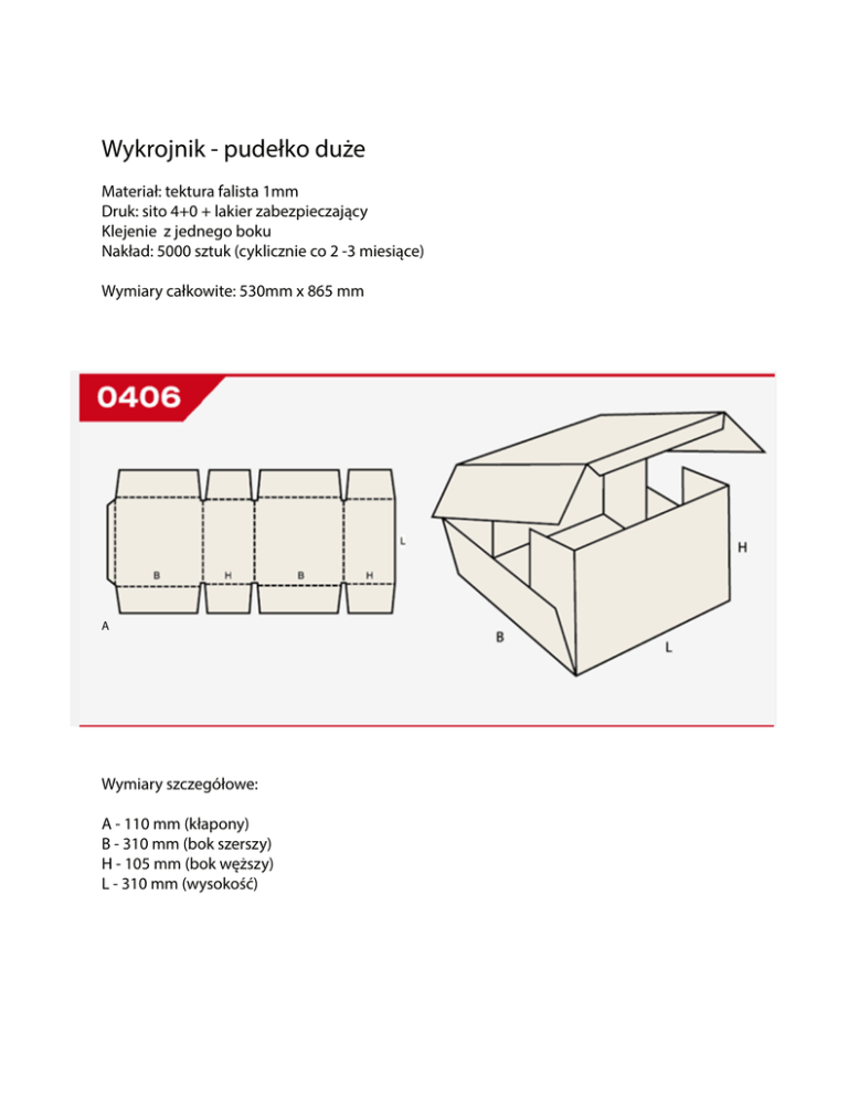 Wykrojnik - pudełko duże Materiał: tektura falista 1mm Druk: sito 4+0 + lakier zabezpieczający Klejenie z jednego boku Nakład: 5000 sztuk (cyklicznie co 2 -3 miesiące) Wymiary całkowite: 530mm x 865 mm A Wymiary szczegółowe: A - 110 mm (kłapony) B - 310 mm (bok szerszy) H - 105 mm (bok węższy) L - 310 mm (wysokość)