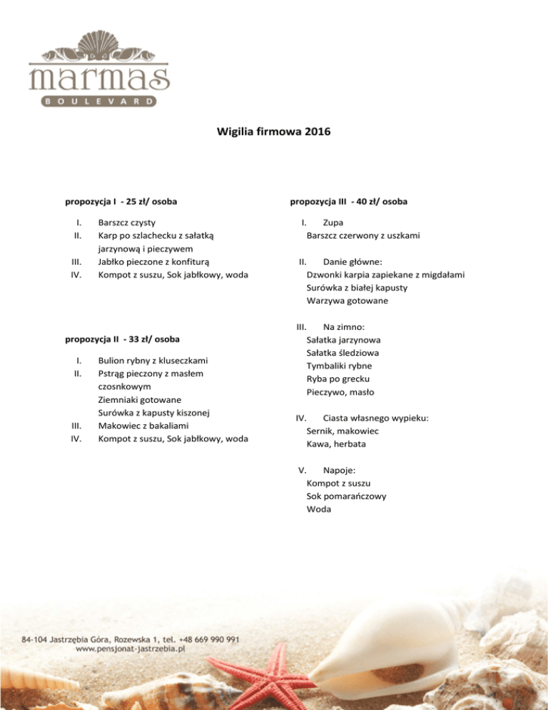 Wigilia firmowa 2016 propozycja I - 25 zł/ osoba I. II. III. IV. Barszcz czysty Karp po szlachecku z sałatką jarzynową i pieczywem Jabłko pieczone z konfiturą Kompot z suszu, Sok jabłkowy, woda propozycja II - 33 zł/ osoba I. II. III. IV. Bulion rybny z kluseczkami Pstrąg pieczony z masłem czosnkowym Ziemniaki gotowane Surówka z kapusty kiszonej Makowiec z bakaliami Kompot z suszu, Sok jabłkowy, woda propozycja III - 40 zł/ osoba I. Zupa Barszcz czerwony z uszkami II. Danie główne: Dzwonki karpia zapiekane z migdałami Surówka z białej kapusty Warzywa gotowane III. Na zimno: Sałatka jarzynowa Sałatka śledziowa Tymbaliki rybne Ryba po grecku Pieczywo, masło IV. Ciasta własnego wypieku: Sernik, makowiec Kawa, herbata V. Napoje: Kompot z suszu Sok pomarańczowy Woda propozycja IV - 60 zł/ osoba I. Zupa Barszcz z pasztecikiem II. Danie główne: Pierogi z kapustą i grzybami Dorsz pieczony ze szpinakiem Surówka z czerwonej kapusty Warzywa gotowane III. Na zimno: Sałatka jarzynowa Sałatka z tuńczykiem Klopsiki rybne w sosie tatarskim Roladki z wędzonym łososiem i pikantnym twarożkiem Ryba po grecku Pieczywo, masło IV. Ciasta własnego wypieku: Sernik, snickers Kawa, herbata V. Napoje: Kompot z suszu Sok pomarańczowy Woda propozycja V - 85 zł/ osoba I. Przystawka Placuszki z cukinii z pastą koperkową i wędzonym łososiem II. Zupa Zupa krem z grzybów leśnych III. Danie główne: Pierogi z kapustą i grzybami Sola na szpinaku w sosie ziołowym Łosoś pieczony Ryż z warzywami IV. Na zimno: Tymbaliki rybne z marchewką i koperkiem Śledź pod pierzynką Roladki z wędzonym łososiem i pikantnym twarożkiem Sałatka ziemniaczana ze śledziem i buraczkami Dorsz po grecku Klopsiki rybne w sosie tatarskim Pieczywo V. Ciasta własnego wypieku: Sernik, Makowiec Ciastka piernikowe Kawa, herbata VI. Napoje Kompot z suszonych owoców woda z cytryną propozycja VI - 85 zł/ osoba VII. Przystawka Placuszki z cukinii z pastą koperkową i wędzonym łososiem VIII. Zupa Zupa krem z grzybów leśnych IX. Danie główne: Pierogi z kapustą i grzybami Sola na szpinaku w sosie ziołowym Łosoś pieczony Ryż z warzywami X. Na zimno: Tymbaliki rybne z marchewką i koperkiem Śledź pod pierzynką Roladki z wędzonym łososiem i pikantnym twarożkiem Sałatka ziemniaczana ze śledziem i buraczkami Dorsz po grecku Klopsiki rybne w sosie tatarskim Pieczywo XI. Ciasta własnego wypieku: Sernik, Makowiec Ciastka piernikowe Kawa, herbata XII. Napoje Kompot z suszonych owoców woda z cytryną propozycja VII - 110 zł/ osoba I. Przystawka Tatar z łososia na krążkach z pumperniklu II. Zupa: Rybna z pulpecikami rybnymi III. Drugie danie Pierogi z kapustą i grzybami Dzwonki karpia zapiekane w migdałach Łosoś pieczony Gratin ziemniaczano-szpinakowe Surówka z buraczków Warzywa gotowane IV. Na zimno Sakiewki z łososia ze szpinakiem i fetą zapiekane w cieście francuskim Roladki rybne z cukinią i marchewką Sałatka po żydowsku Sałatka z tuńczykiem Dorsz po grecku Klopsiki rybne w sosie tatarskim Pstrąg w galarecie cytrynowej Śledź w trzech smakach Brokuły z prażonymi migdałami Pieczywo V. Ciasta własnego wypieku: Sernik , makowiec, rafaello , 3-bit Ciasta piernikowe Kawa, herbata VI. Napoje Kompot z suszonych owoców woda z cytryną