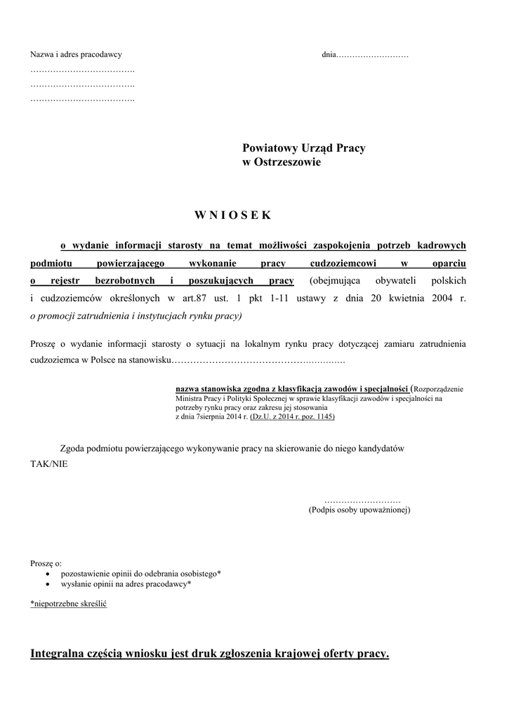 dnia……………………… Nazwa i adres pracodawcy ………………………………. ………………………………. ………………………………. Powiatowy Urząd Pracy w Ostrzeszowie WNIOSEK o wydanie informacji starosty na temat możliwości zaspokojenia potrzeb kadrowych podmiotu powierzającego o bezrobotnych rejestr wykonanie i poszukujących pracy pracy cudzoziemcowi (obejmująca w obywateli oparciu polskich i cudzoziemców określonych w art.87 ust. 1 pkt 1-11 ustawy z dnia 20 kwietnia 2004 r. o promocji zatrudnienia i instytucjach rynku pracy) Proszę o wydanie informacji starosty o sytuacji na lokalnym rynku pracy dotyczącej zamiaru zatrudnienia cudzoziemca w Polsce na stanowisku………………………………………………… nazwa stanowiska zgodna z klasyfikacją zawodów i specjalności (Rozporządzenie Ministra Pracy i Polityki Społecznej w sprawie klasyfikacji zawodów i specjalności na potrzeby rynku pracy oraz zakresu jej stosowania z dnia 7sierpnia 2014 r. (Dz.U. z 2014 r. poz. 1145) Zgoda podmiotu powierzającego wykonywanie pracy na skierowanie do niego kandydatów TAK/NIE ……………………… (Podpis osoby upoważnionej) Proszę o: pozostawienie opinii do odebrania osobistego* wysłanie opinii na adres pracodawcy* *niepotrzebne skreślić Integralna częścią wniosku jest druk zgłoszenia krajowej oferty pracy. ZGŁOSZENIE KRAJOWEJ OFERTY PRACY OFERTA ZAMKNIĘTA / OTWARTA krajowa oferta pracy oferta pracy dla obywateli EOG numer oferty OfPr/ (zaznaczyd właściwe) / numer oferty wg rejestru I. Informacje dotyczące pracodawcy 1. NAZWA PRACODAWCY 2. ADRES PRACODAWCY ………………………………………..……………………….……………………… ………………………………………………………………………………….…….. 3. OSOBA DO KONTAKTU Z PUP KOD POCZTOWY ULICA ……………………………………………… MIEJSCOWOŚD ……………………….…………….………………………………………….……… NAZWISKO I IMIĘ ……………………………………………………….. STANOWISKO ………………………………………………………………………………………… GMINA …………………………………… ………………………………………..…………………………………………….… TELEFON LUB INNY SPOSÓB POROZUMIEWANIA SIĘ ……………………………………… TELEFON FAX …………………………………………………………………………………………. E-MAIL …………………………………………………….……………………………..…… 4. REGON STRONA WWW ..….……….…………………………………………………..…. 7. FORMA WŁASNOŚCI: 1) Prywatna 2) Publiczna 5. NIP - - 3) Agencja Zatrudnienia zgłaszająca ofertę pracy tymczasowej nr agencji - 6. PKD ………………………………... . 8. FORMA KONTAKTÓW KANDYDATÓW Z PRACODAWCĄ 1) Kontakt osobisty 3) Kontakt e-mail 2) Kontakt telefoniczny 4) Kontakt listowny 5) Inny ………………………………..…………………………… 9. LICZBA AKTUALNIE ZATRUDNIONYCH PRACOWNIKÓW II. Informacje dotyczące zgłoszonego miejsca zatrudnienia lub innej pracy zarobkowej 10. NAZWA ZAWODU 11. NAZWA STANOWISKA 12. Liczba wolnych miejsc pracy ……………………….…………….… ……………………….…………….… w tym dla osób niepełnosprawnych ……………………….…………….… ……………………….…………….… 16. RODZAJ UMOWY 13. KOD ZAWODU ……………………….…………….… 14. ADRES MIEJSCA WYKONYWANIA PRACY ……………………….……………….………………………….……………….… 18. WYSOKOŚD WYNAGRODZENIA 19. SYSTEM WYNAGRADZANIA (miesięcznie, brutto) 1) miesięczny 2) akordowy …………………………………………… 3) godzinowy 4) prowizyjny 5)inny………………………… 20. WYMAGANIA – OCZEKIWANIA PRACODAWCY WYKSZTAŁCENIE ……………………….…………….…………………………………..…………………………..…… DOŚWIADCZENIE ZAWODOWE / STAŻ PRACY ………………………………………..…………………………………..…………………………..… UMIEJĘTNOŚCI …………………………………………………….…………………..…….………………………..… 1. Na czas nieokreślony 2. Na czas określony 3. Na okres próbny 4. Umowa na zastępstwo 5. Umowa zlecenie 6. Oferta pracy tymczasowej 7. Inna …………………………………… …………………………………………….. 17. SYSTEM I ROZKŁAD CZASU PRACY 1. Jednozmianowośd 2. Dwie zmiany 3. Trzy zmiany 4. Ruch ciągły 5. Inne …………………..…….……. GODZINY PRACY od …………..……….. do ………..…..….……. dni ………………………………………….……... 21. OKRES ZATRUDNIENIA NA 22. WYMIAR CZASU PRACY PODSTAWIE UMOWY O PRACĘ 1) pełen etat od ………………………….….…….. 2) ½ etatu 3) inne………………………………….. do ………………………………..….. 23. CHARAKTERYSTYKA I RODZAJ WYKONYWANEJ PRACY …………………………………………………….………………………........……………….…….. ……………………………………………………………….…………………………………………… ………………………………………………………………………………………………………….… UPRAWNIENIA ……………………………………………………………………………………………………………… ………………………………………………………………………