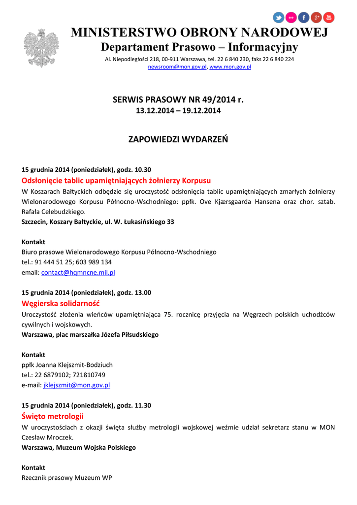 MINISTERSTWO OBRONY NARODOWEJ Departament Prasowo – Informacyjny Al. Niepodległości 218, 00-911 Warszawa, tel. 22 6 840 230, faks 22 6 840 224 [email protected], www.mon.gov.pl SERWIS PRASOWY NR 49/2014 r. 13.12.2014 – 19.12.2014 ZAPOWIEDZI WYDARZEŃ 15 grudnia 2014 (poniedziałek), godz. 10.30 Odsłonięcie tablic upamiętniających żołnierzy Korpusu W Koszarach Bałtyckich odbędzie się uroczystośd odsłonięcia tablic upamiętniających zmarłych żołnierzy Wielonarodowego Korpusu Północno-Wschodniego: ppłk. Ove Kjærsgaarda Hansena oraz chor. sztab. Rafała Celebudzkiego. Szczecin, Koszary Bałtyckie, ul. W. Łukasioskiego 33 Kontakt Biuro prasowe Wielonarodowego Korpusu Północno-Wschodniego tel.: 91 444 51 25; 603 989 134 email: [email protected] 15 grudnia 2014 (poniedziałek), godz. 13.00 Węgierska solidarnośd Uroczystośd złożenia wieoców upamiętniająca 75. rocznicę przyjęcia na Węgrzech polskich uchodźców cywilnych i wojskowych. Warszawa, plac marszałka Józefa Piłsudskiego Kontakt ppłk Joanna Klejszmit-Bodziuch tel.: 22 6879102; 721810749 e-mail: [email protected] 15 grudnia 2014 (poniedziałek), godz. 11.30 Święto metrologii W uroczystościach z okazji święta służby metrologii wojskowej weźmie udział sekretarz stanu w MON Czesław Mroczek. Warszawa, Muzeum Wojska Polskiego Kontakt Rzecznik prasowy Muzeum WP tel.: 22 684 63 35 email: [email protected]: [email protected] 16 grudnia 2014 (wtorek), godz. 10.00 Spotkanie wigilijne Prezydenta RP z żołnierzami W Wojskowej Akademii Technicznej Prezydent Rzeczypospolitej Polskiej Bronisław Komorowski spotka się z żołnierzami Wojska Polskiego z okazji zbliżających się świąt Bożego Narodzenia. Prezydentowi towarzyszyd będzie wicepremier, minister obrony narodowej Tomasz Siemoniak. Warszawa, ul. S. Kaliskiego 25b Kontakt płk Wiesław Grzegorzewski tel.: 22 683 95 51, 601 201 492. email: [email protected] 18 grudnia 2014 (czwartek), godz. 11.00 Pamięci Jana Karskiego Z okazji 100-lecia urodzin Jana Karskiego na budynku MON przy al. Niepodległości 218 zostanie odsłonięta tablica upamiętniająca Jego postad. W uroczystości wezmą udział przedstawiciele kierownictwa resortu obrony. Warszawa, al. Niepodległości 218 Kontakt Departament Prasowo-Informacyjny MON Tel.: 22 6 840 230 email: [email protected] Do 19 grudnia 2014 (piątek) Ostatnie dni szkolenia Szkolenie specjalistyczne żołnierzy III turnusu służby przygotowawczej. Zakooczenie turnusu: 19.12. Dęblin, Koszalin, Ustka Kontakt CSIL Dęblin st. chor. Remigiusz Sudoł tel.: 81 548 27 35 e-mail: [email protected] CSSP Koszalin kpt. Jarosław Barczewski tel.: 691 948 010 e-mail: [email protected] CSMW Ustka kmdr ppor. Robert Biernaczyk tel.: 605 229 782 e-mail: [email protected] 19 grudnia 2014 (piątek), godz. 15.00 100. rocznica bitwy pod Łowczówkiem W obchodach rocznicy bitwy wezmą udział przedstawiciele resortu obrony, wojska oraz władz cywilnych. Łowczówek, Pleśna Kontakt Departament Prasowo-Informacyjny MON Tel.: 22 6 840 230 email: [email protected] 20 grudnia 2014 (sobota), godz. 15.00 Koncert świąteczny W koncercie dla żołnierzy i rodzin żołnierzy pełniących służbę w Polskich Kontyngentach Wojskowych poza granicami kraju wezmą udział przedstawiciele kierownictwa resortu obrony narodowej. Opole, Filharmonia Opolska, ul. Krakowska 24 Kontakt Departament Prasowo-Informacyjny MON Tel.: 22 6 840 230 email: [email protected] KRONIKA 6 grudnia 2014 (sobota) Naszaarmia.pl W najnowszym odcinku programu Naszaarmia.pl m.in. wizyta u żołnierzy dwudziestej piątej Brygady Kawalerii Powietrznej uczestniczących w międzynarodowym dwiczeniu - Falcon 14. Więcej… 6 grudnia 2014 (sobota) Bezpłatne badania układu krążenia dla żołnierzy Od środy do soboty (17 – 20 grudnia) czekają na ciebie specjaliści z Wojskowego Instytutu Medycznego! Chcesz skorzystad z bezpłatnego programu profilaktyki chorób układu krążenia? Wystarczy e-mailowo umówid się na wizytę. Nie warto zwlekad, liczba miejsc jest ograniczona! Więcej… 8 grudnia 2014 (poniedziałek) Serwis informacyjny Centrum Weterana W grudniu 2014 roku rozpoczyna działalnośd Centrum Weterana Działao Poza Granicami Paostwa. Inauguracji towarzyszy uruchomienie serwisu informacyjnego Centrum. Serdecznie zapraszamy wszystkich zainteresowanych do odwiedzania naszego portalu. Więcej… 8 grudnia 2014 (poniedziałek) Konkurs na najlepszą pracę naukową Po raz trzeci wiceprezes Rady Ministrów, minister obrony narodowej ogłasza Konkurs na najlepszą pracę naukową i wdrożenie z obszaru obronności. Konkurs odbywa się pod patronatem honorowym prezydenta Rzeczypospolitej Polskiej Bronisława Komorowskiego. Więcej… 8 grudnia 2014 (poniedziałek) XX lat Prawosławnego Ordynariatu WP „Te 20 lat to szczególny czas dla Wojska Polskiego – po 1989 roku odrodziły się ordynariaty i piękna tradycja duchowego wsparcia, jakie zapewniali żołnierzom ordynariusze wszystkich wyznao - w tym prawosławnego” – powiedział do zebranych na poniedziałkowej uroczystości wicepremier, szef resortu obrony Tomasz Siemoniak. Więcej… 9 grudnia 2014 (wtorek) Spotkanie ministrów obrony Polski i Kanady We wtorek, odbyło się spotkanie wicepremiera, ministra obrony narodowej Tomasza Siemoniaka z przebywającym w Polsce ministrem obrony Kanady Robertem D. Nicholsonem. Więcej… 9 grudnia 2014 (wtorek) „Polska Zbrojna” o Afganistanie Operacja ISAF nie tylko wpłynęła na sytuację w Afganistanie, ale też zmieniła polskie wojsko. Jak? O tym w najnowszym numerze miesięcznika „Polska Zbrojna” mówią dowódcy kontyngentów, m.in. gen. Marek Tomaszycki i gen. Rajmund Andrzejczak. Pokazujemy też działanie kontrwywiadu oraz wojsk specjalnych na misji. Więcej… 9 grudnia 2014 (wtorek) „Plan wzmocnienia bezpieczeostwa paostwa” przyjęty Podczas wtorkowych obrad rząd przyjął „Plan wzmocnienia bezpieczeostwa paostwa” (rozpatrywany w tr