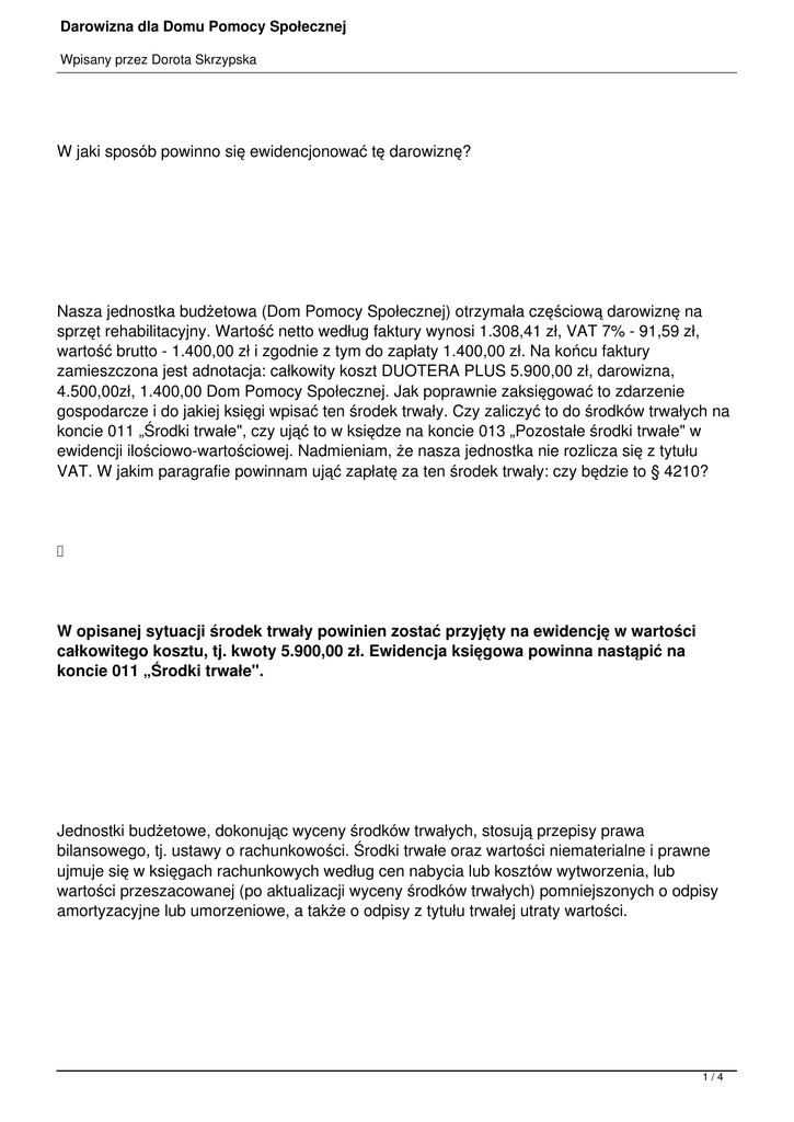 Darowizna dla Domu Pomocy Społecznej Wpisany przez Dorota Skrzypska W jaki sposób powinno się ewidencjonować tę darowiznę? Nasza jednostka budżetowa (Dom Pomocy Społecznej) otrzymała częściową darowiznę na sprzęt rehabilitacyjny. Wartość netto według faktury wynosi 1.308,41 zł, VAT 7% - 91,59 zł, wartość brutto - 1.400,00 zł i zgodnie z tym do zapłaty 1.400,00 zł. Na końcu faktury zamieszczona jest adnotacja: całkowity koszt DUOTERA PLUS 5.900,00 zł, darowizna, 4.500,00zł, 1.400,00 Dom Pomocy Społecznej. Jak poprawnie zaksięgować to zdarzenie gospodarcze i do jakiej księgi wpisać ten środek trwały. Czy zaliczyć to do środków trwałych na koncie 011 „Środki trwałe", czy ująć to w księdze na koncie 013 „Pozostałe środki trwałe" w ewidencji ilościowo-wartościowej. Nadmieniam, że nasza jednostka nie rozlicza się z tytułu VAT. W jakim paragrafie powinnam ująć zapłatę za ten środek trwały: czy będzie to § 4210? W opisanej sytuacji środek trwały powinien zostać przyjęty na ewidencję w wartości całkowitego kosztu, tj. kwoty 5.900,00 zł. Ewidencja księgowa powinna nastąpić na koncie 011 „Środki trwałe". Jednostki budżetowe, dokonując wyceny środków trwałych, stosują przepisy prawa bilansowego, tj. ustawy o rachunkowości. Środki trwałe oraz wartości niematerialne i prawne ujmuje się w księgach rachunkowych według cen nabycia lub kosztów wytworzenia, lub wartości przeszacowanej (po aktualizacji wyceny środków trwałych) pomniejszonych o odpisy amortyzacyjne lub umorzeniowe, a także o odpisy z tytułu trwałej utraty wartości. 1/4 Darowizna dla Domu Pomocy Społecznej Wpisany przez Dorota Skrzypska Cena nabycia to cena zakupu składnika aktywów, obejmująca kwotę należną sprzedającemu, bez podlegających odliczeniu podatku od towarów i usług oraz podatku akcyzowego. W przypadku importu jest ona powiększona o obciążenia o charakterze publicznoprawnym oraz powiększona o koszty bezpośrednio związane z zakupem i przystosowaniem składnika aktywów do stanu zdatnego do używania lub wprowadzenia do obrotu, łącznie z kosztami transportu, jak też załadunku, wyładunku, składowania lub wprowadzenia do obrotu, a obniżona o rabaty, opusty, inne podobne zmniejszenia i odzyski. Pamiętaj, że jeżeli nie jest możliwe ustalenie ceny nabycia składnika aktywów, a w szczególności przyjętego nieodpłatnie, w tym w drodze darowizny - jego wyceny dokonuje się według ceny sprzedaży takiego samego lub podobnego przedmiotu. Środki trwałe ujmuje się w ewidencji księgowej w wartości początkowej w razie odpłatnego nabycia w cenie nabycia, a w razie nabycia w drodze darowizny według wartości rynkowej z dnia nabycia lub kwoty wynikającej z umowy darowizny. Nieodpłatną część środka trwałego ewidencjonuje się za pośrednictwem konta 800 „Fundusz jednostki". Oznacza to, że środek trwały powinien zostać przyjęty na ewidencję w wartości całkowitego kosztu, tj. kwoty 5.900,00 zł. Ewidencja księgowa powinna nastąpić na koncie 011 „Środki trwałe". Innym zagadnieniem jest zapłata za zakupiony środek trwały. Na mocy rozporządzenia Ministra Finansów w sprawie szczegółowej klasyfikacji dochodów, wydatków, przychodów i rozchodów oraz środków pochodzących ze źródeł zagranicznych w paragrafie wydatków 421 „Zakup materiałów i wyposażenia" ujmuje się zakup materiałów i wyposażenia za wyjątkiem zakupów: - środków żywności, 2/4 Darowizna dla Domu Pomocy Społecznej Wpisany przez Dorota Skrzypska - pomocy naukowych, dydaktycznych i książek, - leków i materiałów medycznych, - sprzętu i uzbrojenia, - materiałów papierniczych do sprzętu drukarskiego i urządzeń kserograficznych, - akcesoriów komputerowych, w tym programów i licencji, - a także zakupów dóbr przekazywanych osobom fizycznym w ramach deputatów i innych świadczeń w naturze dokonywanych z wydatków osobowych. Paragraf ten obejmuje przede wszystkim wydatki związane z zakupem: - materiałów administracyjno-biurowych, materiałów gospodarczych, prasy, wyposażenia nieuznawanego za środki trwałe, paliwa, opału, materiałów do konserwacji, zakup nagród rzeczowych dla osób fizycznych i prawnych - puchary, dyplomy, zakup kawy, herbaty, napojów na cele reprezentacyjne jednostki. Natomiast do ewidencji zakupu majątku trwałego przeznaczone są paragrafy wydatków majątkowych, np. - § 605 „Wydatki inwestycyjne jednostek budżetowych", - § 606 „Wydatki na zakupy inwestycyjne jednostek budżetowych". 3/4 Darowizna dla Domu Pomocy Społecznej Wpisany przez Dorota Skrzypska Z wydatków na cele inwestycyjne wyodrębnione zostały zakupy. W § 605 ujmuje się wydatki na inwestycje, bez zakupów inwestycyjnych, które należy klasyfikować odpowiednio w § 606. Zakupy inwestycyjne odnoszą się do środków trwałych niezaliczonych do pierwszego wyposażenia, których wartość początkowa jest wyższa od kwoty określonej w art. 16f ustawy o podatku dochodowym od osób prawnych, a odpisy amortyzacyjne od tych środków trwałych nie są dokonywane jednorazowo lub gdy od nich nie dokonuje się odpisów amortyzacyjnych w przypadkach określonych w tej ustawie. Podstawa prawna: - Ustawa z 29 września 1994 r. o rachunkowości (tekst jednolity: Dz.U. z 2002 r. nr 76, poz. 694 z późn. zm.). - Rozporządzenie Ministra Finansów z 14 czerwca 2006 r. w sprawie szczegółowej klasyfikacji dochodów, wydatków, przychodów i rozchodów oraz środków pochodzących ze źródeł zagranicznych (Dz.U. nr 107, poz. 726 z późn. zm.). 4/4