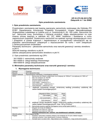 OP-IV.272.56.2013.PW Załącznik nr 1 do SIWZ Opis przedmiotu zamówienia I. Opis przedmiotu zamówienia. Przedmiotem zamówienia jest leasing operacyjny samochodu osobowego dla Oddziału PO RYBY Departamentu Koordynacji Projektów Europejskich Urzędu Marszałkowskiego Województwa Lubelskiego w Lublinie przy ul. Ceramicznej 8, 20- 150 Lublin. Samochód ma być fabrycznie nowy, pochodzący z bieżącej produkcji, objęty ubezpieczeniem na czas trwania umowy leasingu w zakresie AC, OC, NNW, Asistance i Assistance w ruchu zagranicznym pojazdów. Dostarczony samochód ma spełniać wymogi obowiązujących norm i przepisów w prawie krajowym i wspólnotowym w szczególności odnoszących się do pojazdów samochodowych związanych z dopuszczeniem do ruchu i norm związanych z zanieczyszczeniem środowiska. Parametry techniczno – jakościowe samochodu oraz warunki gwarancji i serwisu określono w pkt II. Warunki leasingu określono w pkt III. Zakres ubezpieczenia samochodów określono w pkt IV. 2. Opis przedmiotu zamówienia wg CPV: · 34110000-1- samochody osobowe · 66114000-2- usługi leasingu finansowego · 66510000-8- usługi ubezpieczeniowe II. Minimalne parametry techniczne oraz warunki gwarancji i serwisu: 1. Wymagania techniczne: Element Rocznik Rodzaj nadwozia Silnik Parametr 2013 fabrycznie nowy Pięciodrzwiowy Hatchback z homologacją osobową • Benzynowy lub Diesel o pojemności nie mniejszej niż 1500cm3 i nie większej niż 1900 cm3 • Moc nie mniejsza niż 100 KM • Skrzynia biegów manualna • Zużycie paliwa (l/100 km): • Cykl miejski – maksimum 9 l ( • Cykl pozamiejski – maksimum 6,1 l • Cykl mieszany – maksimum 7,3 l 1. wielkość zużywanej energii, zmierzoną według procedury ustalonej dla celów badań homologacyjnych: Megadżuli/100km benzyna Cykl miejski 288 diesel 324 Cykl pozamiejski 195,2 219,6 Cykl mieszany 233,6 262,8 2. wielkość emisji dwutlenku węgla, zmierzoną według procedury ustalonej dla celów badań homologacyjnych: max 130 g CO2/km 3. Samochody powinny spełniać wymagania normy emisji spalin EURO 5 Wymiary Zbiornik paliwa Wygląd • • • Długość nie mniej niż 4250mm Szerokość nie mniej niż 1750 mm Wysokość nie mniej niż 1450 mm Wymiary katalogowe bez lusterek oraz dodatkowych nakładek i relingów Nie mniejszy niż 50L • Przednie i tylne koła o średnicy obręczy nie mniejszej niż 15 cali z lekkich stopów • Zderzaki przednie i tylne lakierowane w kolorze nadwozia • Komplet opon na sezon letni - felgi stalowe wraz z kołpakami, z logo producenta pojazdu Kolor Wnętrze Bezpieczeństwo Gwarancja/ przeglądy • Komplet opon na sezon zimowy wraz z felgami stalowymi. Srebrny, grafitowy, granatowy,brązowy, biały – kolory mogą być metalizowane • Klimatyzacja automatyczna z wyświetlaczem • Tapicerka siedzeń tkaninowa • Szyby otwierane elektrycznie • Lusterko boczne po stronie kierowcy i pasażera regulowane elektrycznie, • Wspomaganie kierownicy • Podłokietnik dla kierowcy • Kierownica z regulacją w dwóch płaszczyznach • Radio CD ze sterowaniem z kolumny kierowniczej lub kierownicy • System audio zawierający minimum 6 głośników • Centralny zamek sterowany pilotem oraz autoalarm • Pojemność bagażnika do wysokości okien siedzenia pionowo nie mniej niż 380(l)- podany wymiar nie uwzględnia koła zapasowego ew. umieszczonego w bgażniku • Komplet dywaników gumowych głębokich (przód i tył) • Gaśnica samochodowa • Trójkąt ostrzegawczy • Apteczka samochodowa • Komputer pokładowy • Fotel kierowcy z regulacją wysokości • Przednia poduszka powietrzna po stronie kierowcy i pasażera , kurtyny powietrzne, boczne poduszki powietrzne dla kierowcy i pasażera • Pasy siedzeń przednich po stronie kierowcy i po stronie pasażera trzypunktowe, z napinaczami i z regulacją wysokości • System zapobiegający blokowaniu kół podczas hamowania (ABS) • Fabryczne czujniki parkowania- minimum z tyłu auta • Przednie światła przeciwmgielne • Przestrzeń bagażowa osłonięta twardą półką • Immobiliser • Koło zapasowe pełnowymiarowe lub dojazdowe (podnośnik + klucz) • 150 000 km lub 4 lata • Bezpłatny Assistance III. Wymagania dotyczące leasingu: Rodzaj leasingu Leasing w walucie Rodzaj rat leasingowych Ilość rat miesięcznych Wstępna opłata leasingowa Wartość wykupu przedmiotu leasingu po upłynięciu umownego okresu leasingu Wydanie samochodu Zakres ubezpieczenia operacyjny złoty równe 35 10% wartości samochodu Zamawiający nie przewiduje wykupu samochodu 30 dni od dnia zawarcia umowy AC, OC, NNW, Assistance i Assistance w ruchu zagranicznym pojazdów IV. Warunki ubezpieczenia: Samochód przedstawiony Zamawiającemu do odbioru powinien być dopuszczony do ruchu przez właściwy organ, oraz ubezpieczony w zakresie OC, AC, NNW, Assistance i Assistance w ruchu zagranicznym. Wymagane warunki AC: Suma ubezpieczeniowa AC winna odpowiadać wartości rynkowej pojazdu. Ubezpieczenie winno obejmować szkody powstałe w pojeździe, wynikłe co najmniej z następujących zdarzeń: włamania do pojazdu, kradzieży pojazdu lub zabrania pojazdu celem krótkotrwałego użycia, zetknięcia z innym pojazdem, osobami, zwierzętami oraz zdarzeń losowych: 1. powodzi, zatopienia, uderzenia pioruna, pożaru, wybuchu, opadu atmosferycznego, huraganu, osuwania lub zapadania się ziemi, 2. nagłego działania czynnika termicznego lub chemicznego pochodzącego z zewnątrz pojazdu.