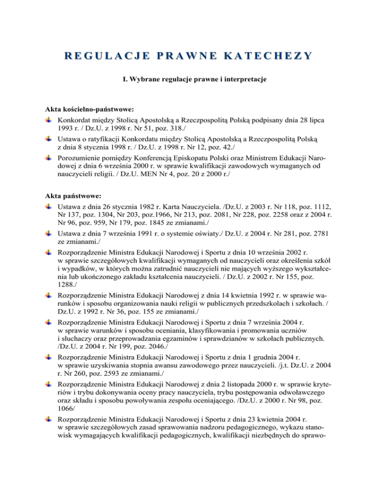 REGULACJE PRAWNE KATECHEZY I. Wybrane regulacje prawne i interpretacje Akta kościelno-państwowe: Konkordat między Stolicą Apostolską a Rzeczpospolitą Polską podpisany dnia 28 lipca 1993 r. / Dz.U. z 1998 r. Nr 51, poz. 318./ Ustawa o ratyfikacji Konkordatu między Stolicą Apostolską a Rzeczpospolitą Polską z dnia 8 stycznia 1998 r. / Dz.U. z 1998 r. Nr 12, poz. 42./ Porozumienie pomiędzy Konferencją Episkopatu Polski oraz Ministrem Edukacji Narodowej z dnia 6 września 2000 r. w sprawie kwalifikacji zawodowych wymaganych od nauczycieli religii. / Dz.U. MEN Nr 4, poz. 20 z 2000 r./ Akta państwowe: Ustawa z dnia 26 stycznia 1982 r. Karta Nauczyciela. /Dz.U. z 2003 r. Nr 118, poz. 1112, Nr 137, poz. 1304, Nr 203, poz.1966, Nr 213, poz. 2081, Nr 228, poz. 2258 oraz z 2004 r. Nr 96, poz. 959, Nr 179, poz. 1845 ze zmianami./ Ustawa z dnia 7 września 1991 r. o systemie oświaty./ Dz.U. z 2004 r. Nr 281, poz. 2781 ze zmianami./ Rozporządzenie Ministra Edukacji Narodowej i Sportu z dnia 10 września 2002 r. w sprawie szczegółowych kwalifikacji wymaganych od nauczycieli oraz określenia szkół i wypadków, w których można zatrudnić nauczycieli nie mających wyższego wykształcenia lub ukończonego zakładu kształcenia nauczycieli. / Dz.U. z 2002 r. Nr 155, poz. 1288./ Rozporządzenie Ministra Edukacji Narodowej z dnia 14 kwietnia 1992 r. w sprawie warunków i sposobu organizowania nauki religii w publicznych przedszkolach i szkołach. / Dz.U. z 1992 r. Nr 36, poz. 155 ze zmianami./ Rozporządzenie Ministra Edukacji Narodowej i Sportu z dnia 7 września 2004 r. w sprawie warunków i sposobu oceniania, klasyfikowania i promowania uczniów i słuchaczy oraz przeprowadzania egzaminów i sprawdzianów w szkołach publicznych. /Dz.U. z 2004 r. Nr 199, poz. 2046./ Rozporządzenie Ministra Edukacji Narodowej i Sportu z dnia 1 grudnia 2004 r. w sprawie uzyskiwania stopnia awansu zawodowego przez nauczycieli. /j.t. Dz.U. z 2004 r. Nr 260, poz. 2593 ze zmianami./ Rozporządzenie Ministra Edukacji Narodowej z dnia 2 listopada 2000 r. w sprawie kryteriów i trybu dokonywania oceny pracy nauczyciela, trybu postępowania odwoławczego oraz składu i sposobu powoływania zespołu oceniającego. /Dz.U. z 2000 r. Nr 98, poz. 1066/ Rozporządzenie Ministra Edukacji Narodowej i Sportu z dnia 23 kwietnia 2004 r. w sprawie szczegółowych zasad sprawowania nadzoru pedagogicznego, wykazu stanowisk wymagających kwalifikacji pedagogicznych, kwalifikacji niezbędnych do sprawo- wania nadzoru pedagogicznego, a także kwalifikacji osób, którym można zlecić prowadzenie badań i opracowywanie ekspertyz. /Dz.U. z 2004 r. Nr 89, poz. 845/ Rozporządzenie Ministra Edukacji Narodowej i Sportu z dnia 5 lutego 2004 r. w sprawie dopuszczania do użytku szkolnego programów wychowania przedszkolnego, programów nauczania i podręczników oraz cofania dopuszczenia. /Dz.U. z 2004 r. Nr 25 poz. 220/ Rozporządzenie Ministra Edukacji Narodowej z dnia 12 lutego 2002 r. w sprawie ramowych planów nauczania w szkołach publicznych. /Dz.U. z 2002 r. Nr 15, poz. 142 ze zmianami/ Rozporządzenie Ministra Edukacji Narodowej i Sportu z dnia 31 grudnia 2002 r. w sprawie bezpieczeństwa i higieny w publicznych i niepublicznych szkołach i placówkach. /Dz.U. z 2003 r. Nr 6, poz. 69/ Wstęp Ostatnie zmiany w prawie oświatowym, ich dobra znajomość, szczególnie dotyczące awansu zawodowego nauczycieli, pomoże katechetom w bardziej efektywnej pracy w szkołach i innych placówkach oświatowych. Rozdział I Organizacja nauki religii/etyki Ustawa z dnia 7 września 1991 r. o systemie oświaty art. 12, pkt 1. Uznając prawo rodziców do religijnego wychowania dzieci, szkoły publiczne podstawowe organizują naukę religii na życzenie rodziców, szkoły publiczne ponadpodstawowe – na życzenie bądź rodziców, bądź samych uczniów, po osiągnięciu pełnoletniości o pobieraniu nauki religii decydują uczniowie. Rozporządzenie Ministra Edukacji Narodowej z dnia 14 kwietnia 1992 r. w sprawie warunków i sposobu organizowania nauki religii w publicznych przedszkolach i szkołach §1 pkt 1. W publicznych szkołach podstawowych i ponadpodstawowych, zwanych dalej „szkołami”, organizuje się w ramach planu zajęć szkolnych naukę religii i etyki dla uczniów, których rodzice wyrażają takie życzenie, w szkołach ponadpodstawowych – dla uczniów, których rodzice lub sami uczniowie wyrażają takie życzenie. Po osiągnięciu pełnoletniości o pobieraniu nauki i etyki decydują uczniowie. pkt 2. Życzenie, o którym mowa w ust. 1 jest wyrażone w najprostszej formie oświadczenia, które nie musi być ponawiane w kolejnym roku szkolnym, może natomiast zostać zmienione. §2 pkt 1. Szkoła ma obowiązek zorganizowania lekcji religii dla grupy nie mniejszej niż siedmiu uczniów w danej klasie. Dla mniejszej liczby uczniów lekcji religii w szkole powinny być organizowane w grupie międzyklasowej lub międzyoddziałowej. §3 pkt 3. Szkoła jest obowiązana zapewnić w czasie trwania lekcji religii lub etyki opiekę lub zajęcia wychowawcze uczniom, którzy nie korzystają z nauki religii lub etyki w szkole. 2 Wymiar godzin Rozporządzenie Ministra Edukacji Narodowej z dnia 14 kwietnia 1992 r. w sprawie warunków i sposobu organizowania nauki religii w publicznych przedszkolach i szkołach §8 pkt 1. Nauka religii we wszystkich typach szkół odbywa się w wymiarze dwóch godzin tygodniowo. (...) Wyrażenie zgody na jedną godzinę tygodniowo należy odpowiednio do biskupa diecezji Kościoła Katolickiego albo do władz zwierzchnich Polskiego Autokefalicznego Kościoła Prawosławnego i innych Kościołów i Związków Wyznaniowych. Rozporządzenie Ministra Edukacji Narodowej z dnia 12 lutego 2002 r. w sprawie ramowych planów nauczania w szkołach publicznych §2 ust. 1. Ramowy plan nauczania określa tygodniowy wymiar godzin zajęć edukacyjnych dla odpowiednich okresów kształcenia o wyróżnionych celach, s