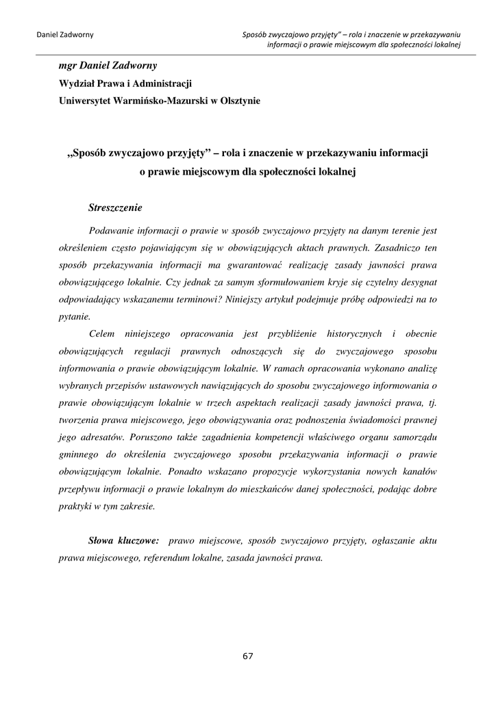Sposób zwyczajowo przyjęty” – rola i znaczenie w przekazywaniu informacji o prawie miejscowym dla społeczności lokalnej Daniel Zadworny mgr Daniel Zadworny Wydział Prawa i Administracji Uniwersytet Warmińsko-Mazurski w Olsztynie „Sposób zwyczajowo przyjęty” – rola i znaczenie w przekazywaniu informacji o prawie miejscowym dla społeczności lokalnej Streszczenie Podawanie informacji o prawie w sposób zwyczajowo przyjęty na danym terenie jest określeniem często pojawiającym się w obowiązujących aktach prawnych. Zasadniczo ten sposób przekazywania informacji ma gwarantować realizację zasady jawności prawa obowiązującego lokalnie. Czy jednak za samym sformułowaniem kryje się czytelny desygnat odpowiadający wskazanemu terminowi? Niniejszy artykuł podejmuje próbę odpowiedzi na to pytanie. Celem obowiązujących niniejszego regulacji opracowania prawnych jest przybliżenie odnoszących się do historycznych i obecnie zwyczajowego sposobu informowania o prawie obowiązującym lokalnie. W ramach opracowania wykonano analizę wybranych przepisów ustawowych nawiązujących do sposobu zwyczajowego informowania o prawie obowiązującym lokalnie w trzech aspektach realizacji zasady jawności prawa, tj. tworzenia prawa miejscowego, jego obowiązywania oraz podnoszenia świadomości prawnej jego adresatów. Poruszono także zagadnienia kompetencji właściwego organu samorządu gminnego do określenia zwyczajowego sposobu przekazywania informacji o prawie obowiązującym lokalnie. Ponadto wskazano propozycje wykorzystania nowych kanałów przepływu informacji o prawie lokalnym do mieszkańców danej społeczności, podając dobre praktyki w tym zakresie. Słowa kluczowe: prawo miejscowe, sposób zwyczajowo przyjęty, ogłaszanie aktu prawa miejscowego, referendum lokalne, zasada jawności prawa. 67 Ius et Administratio 4/2014 Wydział Prawa i Administracji Uniwersytetu Rzeszowskiego „The Customary Manner” – the Role and Importance of Providing Information on Local Law for the Local Community Summary Providing with the information concerning the law in a traditional for this area way is a term which frequently appears in the legal acts being in force. Basically, this method of giving out the information is intended to guarantee the implementation of the principle of the publicity of the local law. However, does the formulation introduce a clear designation for the indicated term? This article takes up an attempt to answer this question. The aim of this study is to present historical and current law regulations which are related to the habitual way of informing about the local law. As a part of the essay, the analysis of selected laws which refer to the traditional way of informing about the local acts was made. It took into consideration three aspects of the implementation of the principle of law publicity, i.e. creation and obligation of the local law, as well as increasing the level of legal awareness among its recipients. Moreover, the idea of appropriate authority’s competence within the local government to determine the customary way of providing with information about the law locally in force has been touched upon. There have also been presented some proposals to use new flow channels of the information on the local law to the residents of the community, given as the examples of good practice in this field. Keywords: local law, customary manner, announcing the act of the local law, local referendum, the principle of law publicity. Wstęp Jedną z form ogłaszania prawa miejscowego lub podawania określonej informacji dla społeczności lokalnej jest sposób zwyczajowo przyjęty. To określenie pojawia w wielu obowiązujących obecnie ustawach, rozporządzeniach czy samych aktach prawa miejscowego. Jednak „brak jest powszechnie przyjętej definicji ogłaszania aktu prawnego czy informacji w sposób zwyczajowo przyjęty”1. Być może wynika to ze specyfiki tego typu czynności, gdyż jest ona determinowana przyjętymi lokalnymi zwyczajami w danej miejscowości lub na danym terenie. Stąd niezwykle trudno byłoby stworzyć jedną, a zarazem powszechnie 1 B. Banaszak, Kodeks wyborczy. Komentarz, Warszawa 2014, art. 12, Nb 3, s. 39. 68 Daniel Zadworny Sposób zwyczajowo przyjęty” – rola i znaczenie w przekazywaniu informacji o prawie miejscowym dla społeczności lokalnej akceptowalną definicję ogłaszania aktu prawnego czy podawania informacji w sposób zwyczajowo przyjęty na danym terenie. Nie stoi to jednak na przeszkodzie, by zastanowić się nad warunkami, jakie powinna spełniać tego typu czynność organu administracji publicznej, żeby można było uznać, iż została dokonana w sposób zwyczajowo przyjęty. Ponadto warto zastanowić się nad tym, który organ samorządu gminnego posiada kompetencje do oceny, czy dana forma podania do publicznej wiadomości określonej informacji jest sposobem zwyczajowo przyjętym. Wreszcie, jakie mogą być konsekwencje niewłaściwego wykonania takiego powiadomienia mieszkańców. Podawanie informacji w sposób zwyczajowo przyjęty to także czynność realizująca zasadę jawności prawa miejscowego. Wprawdzie zasada ta nie została wyrażona wprost w polskim systemie prawa, ale jest realizowana i gwarantowana przez szereg innych zasad wynikających z Konstytucji RP2. Przekazywanie informacji w sposób zwyczajowo przyjęty dostrzegamy na etapie tworzenia aktów prawa miejscowego (np. procedura tworzenia planu miejscowego), wejścia w życie aktu prawa miejscowego (przepisy porządkowe), a także informowania o obowiązującym prawie. Ten ostatni aspekt wykorzystania sposobu zwyczajowego jako narzędzia do informowania społeczności lokalnej o obowiązującym prawie miejscowym ma niebagatelne znaczenie, patrząc przez pryzmat znanej zasady prawa rzymskiego, mówiącej o tym, iż nieznajomość prawa szkodzi3. Dzięki niemu bowiem lokalne społeczności mogą mieć realne szanse zaznajomienia się