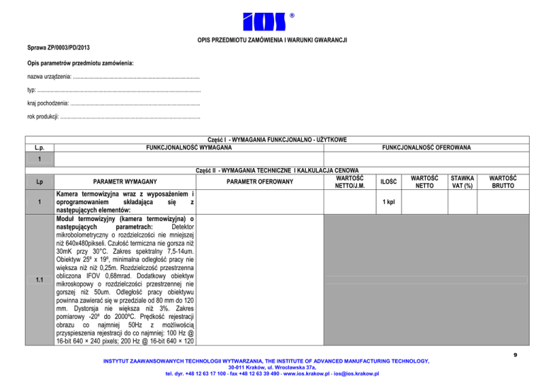 OPIS PRZEDMIOTU ZAMÓWIENIA I WARUNKI GWARANCJI Sprawa ZP/0003/PD/2013 Opis parametrów przedmiotu zamówienia: nazwa urządzenia: ...................................................................................... typ: ............................................................................................................... kraj pochodzenia: ........................................................................................ rok produkcji: ............................................................................................... L.p. Część I - WYMAGANIA FUNKCJONALNO - UŻYTKOWE FUNKCJONALNOŚĆ WYMAGANA FUNKCJONALNOŚĆ OFEROWANA 1 Lp 1 1.1 PARAMETR WYMAGANY Kamera termowizyjna wraz z wyposażeniem i oprogramowaniem składająca się z następujących elementów: Moduł termowizyjny (kamera termowizyjna) o następujących parametrach: Detektor mikrobolometryczny o rozdzielczości nie mniejszej niż 640x480pikseli. Czułość termiczna nie gorsza niż 30mK przy 30°C. Zakres spektralny 7,5-14um. Obiektyw 25º x 19º, minimalna odległość pracy nie większa niż niż 0,25m. Rozdzielczość przestrzenna obliczona IFOV 0,68mrad. Dodatkowy obiektyw mikroskopowy o rozdzielczości przestrzennej nie gorszej niż 50um. Odległość pracy obiektywu powinna zawierać się w przedziale od 80 mm do 120 mm. Dystorsja nie większa niż 3%. Zakres pomiarowy -20º do 2000ºC. Prędkość rejestracji obrazu co najmniej 50Hz z możliwością przyspieszenia rejestracji do co najmniej: 100 Hz @ 16-bit 640 × 240 pixels; 200 Hz @ 16-bit 640 × 120 Część II - WYMAGANIA TECHNICZNE I KALKULACJA CENOWA WARTOŚĆ PARAMETR OFEROWANY NETTO/J.M. ILOŚĆ WARTOŚĆ NETTO STAWKA VAT (%) WARTOŚĆ BRUTTO 1 kpl 9 INSTYTUT ZAAWANSOWANYCH TECHNOLOGII WYTWARZANIA, THE INSTITUTE OF ADVANCED MANUFACTURING TECHNOLOGY, 30-011 Kraków, ul. Wrocławska 37a, tel. dyr. +48 12 63 17 100 ⋅ fax +48 12 63 39 490 ⋅ www.ios.krakow.pl ⋅ [email protected] 1.2. pixels. Interfejsy: Gigabit Ethernet i USB 2.0 HS. Zgodność ze standardem GenICam i GigE Vision. Obługiwane protokoły: TCP, UDP, SNTP, RTSP, RTP, HTTP, ICMP, IGMP, ftp, SMTP, SMB (CIFS), DHCP, MDNS (Bonjour), uPnP. 2 wejśca i wyjścia cyfrowe optoizolowane 10-30VDC. Masa nie więcej niż 1kg. Zasilanie 12VDC. Moduł wizyjny (kamera szybka) o następujących parametrach: Panoramiczny sensor CMOS o rozdzielczości, co najmniej 1280 x 800 pikseli z możliwością rejestracji, co najmniej 3 250 obrazów w ciągu sekundy przy niniejszej rozdzielczości. Głębia bitowa co najmniej 12-bit. Kamera monochromatyczna o czułości świetlnej ISO, co najmniej 11 100 mierzonej wg normy 12232 (metodą SAT). Maksymalna prędkość przy zredukowanej rozdzielczości, nie mniejszej niż 64 x 8 pikseli, co najmniej 650 000 obrazów na sekundę. Minimalny czas ekspozycji 1 µs lub krótszy. Wielkość piksela nie mniejsza niż 20µm. Pamięć, co najmniej 6 GB. Automatyczna kontrola ekspozycji. Kamera musi zostać wyposażona w migawkę elektroniczną oraz wewnętrzną, mechaniczną migawkę kalibracyjną umożliwiające zdalne zasłonięcie sensora i przeprowadzanie kalibracji do czerni dla danych ustawień w zakresie rozdzielczości i czasu ekspozycji. Możliwość rejestracji Pre-trigger i Posttrigger. Możliwość zastosowania dwóch różnych czasów ekspozycji dla jednego obrazu zależnych od stopnia naświetlenia poszczególnych obszarów na rejestrowanym obiekcie. Kontrola obrazu poprzez Gigabit Ethernet. Obsługa kodu czasowego IRIG-B. Mocowanie obiektywu typu F-mount. Musi istnieć możliwość doposażenia kamery w mocowania do obiektywów w standardach Canon EOS mount, PLmount i C-mount. Przynajmniej jeden z powyższych standardów optyki powinien dawać możliwość zdalnego sterowania parametrami obiektywu, tj. 10 INSTYTUT ZAAWANSOWANYCH TECHNOLOGII WYTWARZANIA, THE INSTITUTE OF ADVANCED MANUFACTURING TECHNOLOGY, 30-011 Kraków, ul. Wrocławska 37a, tel. dyr. +48 12 63 17 100 ⋅ fax +48 12 63 39 490 ⋅ www.ios.krakow.pl ⋅ [email protected] 1.3. ostrością i przysłoną z poziomu oprogramowania. Kamera wyposażona w analogowe wyjścia video: NTSC, PAL. Minimalny zakres temperatury otoczenia w trakcie pracy 0 – 40º C. Waga – nie więcej niż 1,5 kg (bez obiektywu i baterii). Kamera musi być wyposażona w złącze kart pamięci, umożliwiających zapis danych z pamięci RAM na nośnik nie-ulotny bez użycia komputera z prędkością, co najmniej 4GB na minutę. Kamera musi posiadać możliwość zasilania bateryjnego. Komplet baterii zasilających kamerę. Oprogramowanie sterujące do kamery wizyjnej wraz z bezterminową licencją (pływającą, sieciową) na użytkowanie komercyjne umożliwiającą zainstalowanie oprogramowania na kilku komputerach. Kamera musi zawierać w zestawie oprogramowanie pozwalające na przeprowadzenie procesu rejestracji oraz manualną analizę ruchu w zarejestrowanych sekwencjach – możliwości pomiaru przemieszczeń, prędkości oraz przyspieszeń liniowych i kątowych. Oprogramowanie zainstalowane na komputerze dostarczonym wraz z kamerą termowizyjną. Bezpłatny dostęp do ewentualnych aktualizacji oprogramowania. Akcesoria modułu termowizyjnego: Stabilny statyw z systemem blokady ustawień i precyzyjnym pozycjonowaniem w przestrzeni 3D. Walizka transportowa do przenoszenia kamery. Bryzgoszczelna obudowa na kamerę termowizyjną z oknem transparentnym dla podczerwieni. Okno wykonane z Ge o średnicy, co najmniej 60mm. Obudowa musi posiadać system stabilizacji temperatury oraz pozwalać na współpracę z głowicami uchylno-obrotowymi. Okno transparentne dla podczerwieni, wykonane z CaF2 o średnicy nie większej niż 2 cale. Okno musi posiadać na obudowę aluminiową przeznaczoną do montażu okna. 11 INSTYTUT ZAAWANSOWANYCH TECHNOLOGII WYTWARZANIA, THE INSTITUTE OF ADVANCED MANUFACTURING TECHNOLOGY, 30-011 Kraków, ul. Wrocławska 37a, tel. dyr. +48 12 63 17 100 ⋅ fax +48 12 63 39 490 ⋅ www.ios.krakow.pl