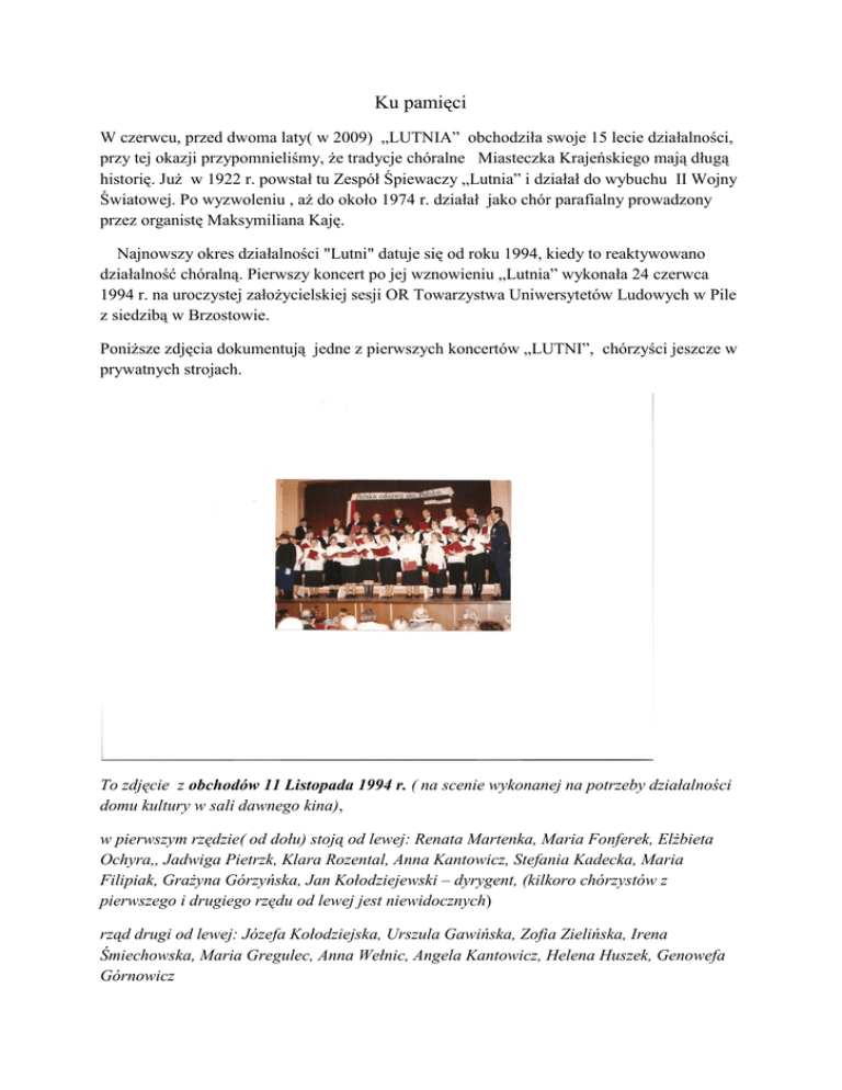 Ku pamięci W czerwcu, przed dwoma laty( w 2009) „LUTNIA” obchodziła swoje 15 lecie działalności, przy tej okazji przypomnieliśmy, że tradycje chóralne Miasteczka Krajeńskiego mają długą historię. Już w 1922 r. powstał tu Zespół Śpiewaczy „Lutnia” i działał do wybuchu II Wojny Światowej. Po wyzwoleniu , aż do około 1974 r. działał jako chór parafialny prowadzony przez organistę Maksymiliana Kaję. Najnowszy okres działalności "Lutni" datuje się od roku 1994, kiedy to reaktywowano działalność chóralną. Pierwszy koncert po jej wznowieniu „Lutnia” wykonała 24 czerwca 1994 r. na uroczystej założycielskiej sesji OR Towarzystwa Uniwersytetów Ludowych w Pile z siedzibą w Brzostowie. Poniższe zdjęcia dokumentują jedne z pierwszych koncertów „LUTNI”, chórzyści jeszcze w prywatnych strojach. To zdjęcie z obchodów 11 Listopada 1994 r. ( na scenie wykonanej na potrzeby działalności domu kultury w sali dawnego kina), w pierwszym rzędzie( od dołu) stoją od lewej: Renata Martenka, Maria Fonferek, Elżbieta Ochyra,, Jadwiga Pietrzk, Klara Rozental, Anna Kantowicz, Stefania Kadecka, Maria Filipiak, Grażyna Górzyńska, Jan Kołodziejewski – dyrygent, (kilkoro chórzystów z pierwszego i drugiego rzędu od lewej jest niewidocznych) rząd drugi od lewej: Józefa Kołodziejska, Urszula Gawińska, Zofia Zielińska, Irena Śmiechowska, Maria Gregulec, Anna Wełnic, Angela Kantowicz, Helena Huszek, Genowefa Górnowicz rząd trzeci od lewej: Czesław Danowski, Ryszard Śmiechowski, Mieczysław Misiak, Józef Gregulec, Edward Orliński, Ryszard Martenka, Julita Anger, Jan Filipiak, a to obchody 3 Maja 1995 r. rząd pierwszy od lewej: Maria Gregulec, Renata Martenka, Elżbieta Wawrzyniak, Józefa Kołodziejska, Stefania Kadecka, Maria Filipiak, Angela Kantowicz, rząd drugi od lewej: Jadwiga Oleszczyk, Elżbieta Ochyra, Klara Rozental, Irena Śmiechowska, Anna Kantowicz, Genowefa Górnowicz, rząd trzeci od lewej: Maria Fonferek, Seweryna Kujawska, Urszula Gawińska, Zofia Zielińska, Jadwiga Pietrzk, Maria Brzezińska, Anna Wełnic, Maria Kufel, Grażyna Górzyńska, Genowefa Orlińska rząd czwarty od lewej: Edward Szymusik, Czesław Danowski, Józef Gregulec, Edward Orliński, Ryszard Śmiechowski, Tadeusz Gryszpiński, Ryszard Martenka, Jerzy Wawrzyniak, Helena Huszek, Jan Filipiak, dyryguje Piotr Orliński Dziś w chórze już wielu z wymienionych nie śpiewa – głównie z powodów zdrowotnych, a i po TEJ stronie jest ich coraz mniej, na TAMTEN drugi brzeg odeszło już 10 śpiewaków. Teraz mają TAM swój chór, by na wieki śpiewać Panu „Hosanna”, a my mamy nadzieję, że wyproszą u Najwyższego łaskę licznego naboru nowych chórzystów do „Lutni”, by po TEJ stronie mogła jeszcze długo śpiewać Pragniemy wymienić imiona i nazwiska tych, którzy odeszli do Pana: Maria Brzezińska (zm. w 1997 r.) Maria Fonferek (zm. w 2011 r.) Anna Kantowicz (zm. w 2002 r.) Angela Kantowicz ( zm. w 2009 r.) Stefania Kadecka (zm. w 2009 r.) Józefa Kołodziejska (zm. w 2010 r.) Ryszard Martenka (zm. w 2002 r.) Klara Rozental ( zm. w 1997 r.) Irena Śmiechowska ( zm. w 2011 r.) JerzyWawrzyniak ( zm. w 2003 r.) SPOCZYWAJCIE W POKOJU! CZEŚĆ WASZEJ PAMIĘCI! E.S.