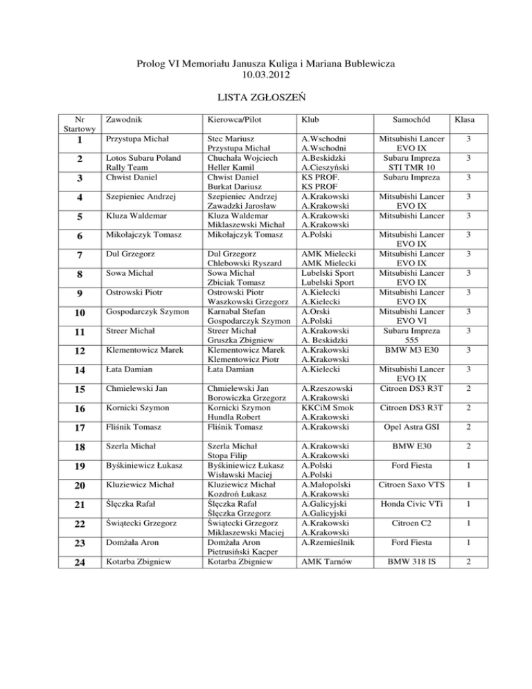 Prolog VI Memoriału Janusza Kuliga i Mariana Bublewicza 10.03.2012 LISTA ZGŁOSZEŃ Nr Startowy Zawodnik Kierowca/Pilot Klub 1 Przystupa Michał 2 3 Lotos Subaru Poland Rally Team Chwist Daniel 4 Szepieniec Andrzej 5 Kluza Waldemar 6 Mikołajczyk Tomasz Stec Mariusz Przystupa Michał Chuchała Wojciech Heller Kamil Chwist Daniel Burkat Dariusz Szepieniec Andrzej Zawadzki Jarosław Kluza Waldemar Miklaszewski Michał Mikołajczyk Tomasz A.Wschodni A.Wschodni A.Beskidzki A.Cieszyński KS PROF. KS PROF A.Krakowski A.Krakowski A.Krakowski A.Krakowski A.Polski 7 Dul Grzegorz 8 Sowa Michał 9 Ostrowski Piotr Dul Grzegorz Chlebowski Ryszard Sowa Michał Zbiciak Tomasz Ostrowski Piotr Waszkowski Grzegorz Karnabal Stefan Gospodarczyk Szymon Streer Michał Gruszka Zbigniew Klementowicz Marek Klementowicz Piotr Łata Damian AMK Mielecki AMK Mielecki Lubelski Sport Lubelski Sport A.Kielecki A.Kielecki A.Orski A.Polski A.Krakowski A. Beskidzki A.Krakowski A.Krakowski A.Kielecki Chmielewski Jan Borowiczka Grzegorz Kornicki Szymon Hundla Robert Fliśnik Tomasz A.Rzeszowski A.Krakowski KKCiM Smok A.Krakowski A.Krakowski Szerla Michał Stopa Filip Byśkiniewicz Łukasz Wisławski Maciej Kluziewicz Michał Kozdroń Łukasz Ślęczka Rafał Ślęczka Grzegorz Świątecki Grzegorz Miklaszewski Maciej Domżała Aron Pietrusiński Kacper Kotarba Zbigniew A.Krakowski A.Krakowski A.Polski A.Polski A.Małopolski A.Krakowski A.Galicyjski A.Galicyjski A.Krakowski A.Krakowski A.Rzemieślnik 10 Gospodarczyk Szymon 11 Streer Michał 12 Klementowicz Marek 14 Łata Damian 15 Chmielewski Jan 16 Kornicki Szymon 17 Fliśnik Tomasz 18 Szerla Michał 19 Byśkiniewicz Łukasz 20 Kluziewicz Michał 21 Ślęczka Rafał 22 Świątecki Grzegorz 23 Domżała Aron 24 Kotarba Zbigniew AMK Tarnów Samochód Mitsubishi Lancer EVO IX Subaru Impreza STI TMR 10 Subaru Impreza Mitsubishi Lancer EVO IX Mitsubishi Lancer Klasa 3 3 3 3 3 Mitsubishi Lancer EVO IX Mitsubishi Lancer EVO IX Mitsubishi Lancer EVO IX Mitsubishi Lancer EVO IX Mitsubishi Lancer EVO VI Subaru Impreza 555 BMW M3 E30 3 Mitsubishi Lancer EVO IX Citroen DS3 R3T 3 Citroen DS3 R3T 2 Opel Astra GSI 2 BMW E30 2 Ford Fiesta 1 Citroen Saxo VTS 1 Honda Civic VTi 1 Citroen C2 1 Ford Fiesta 1 BMW 318 IS 2 3 3 3 3 3 3 2