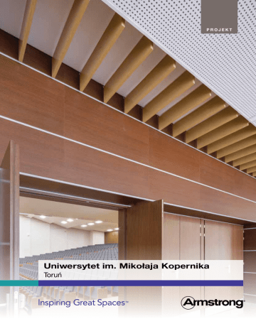 PROJEKT Uniwersytet im. Mikołaja Kopernika Toruń Pracownia projektowa działając w ścisłej współpracy z doradcą firmy Armstrong wybrała w całości trwałe i łatwe w utrzymaniu sufity metalowe. Szczególny nacisk położono na wyjątkowe wykończenie obszarów wokół auli uniwersyteckiej. Architektom zależało na idealnym dopasowaniu sufitu do drewnianych okładzin ściennych, równocześnie jednak nie chcieli obniżać dość niskich stropów standardowymi sufitami podwieszanymi. Udało się to uzyskać za pomocą metalowych paneli pionowych Metal Baffle z efektem drewna dębowego. W holu wejściowym zastosowano zaś w pełni demontowalny sufit Metal R-Clip w formie długich paneli typu Planks. Ukryty ruszt nośny GemaGrid powoduje, że sufit wydaje się monolityczny, zaś długie panele wizualnie zwiększają hol i korytarze. Nowoczesność i trwały materiał Uniwersytet im. Mikołaja Kopernika to uczelnia o wieloletniej tradycji. Wywodzi się z niego wiele wybitnych osobowości z kraju i z zagranicy. Przez lata uczelnia znacznie się rozrosła i unowocześniła. Na etapie ostatnio przeprowadzanej renowacji pracownia architektoniczna działająca w imieniu władz uczelnianych postanowiła zaprojektować wnętrza w sposób ilustrujący ducha tej uczelni - nowocześnie, wyjątkowo, trwale. Właściciel Uniwersytet Mikołaja Kopernika Architekt Pracownia Inwestproj Sufity Metal Baffle z efektem drewna Dąb 800 x 200 - 230 szt. Metal Baffle z efektem drewna Dąb 1000 x 200 - 42 szt. Metal Axal Vector, Ekstra mikroperforacja 600 x 600 - 215 m2 Metal R-Clip, Plain, 400 x 1500 - 700 m2 Metal Axal Vector, Plain 600 x 600 - 65 m2 Cellio C36 RAL 9006, 600 x 600 - 126 m2 AXAL Vector Cellio C36 Metal R-Clip Plain Metal Baffle Więcej znajdziesz w Galerii Projektów Armstrong Building Products BV Sp. z o.o. Oddział w Polsce ul. Domaniewska 37 02-672 Warszawa Polska Tel. (+48) 22 337 86 10/11 Fax (+48) 22 337 86 12 [email protected] www.armstrong.pl/sufity 11/2014 - PX1403 - © Szymon Polański - Armstrong Building Products - RCS Besançon B 784 131 575 Metal z efektem drewna Dąb, Plain