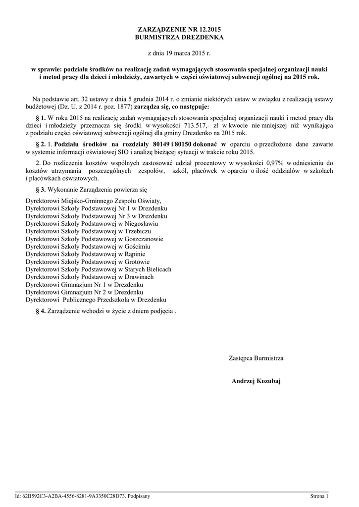 ZARZĄDZENIE NR 12.2015 BURMISTRZA DREZDENKA z dnia 19 marca 2015 r. w sprawie: podziału środków na realizację zadań wymagających stosowania specjalnej organizacji nauki i metod pracy dla dzieci i młodzieży, zawartych w części oświatowej subwencji ogólnej na 2015 rok. Na podstawie art. 32 ustawy z dnia 5 grudnia 2014 r. o zmianie niektórych ustaw w związku z realizacją ustawy budżetowej (Dz. U. z 2014 r. poz. 1877) zarządza się, co następuje: § 1. W roku 2015 na realizację zadań wymagających stosowania specjalnej organizacji nauki i metod pracy dla dzieci i młodzieży przeznacza się środki w wysokości 713.517,- zł w kwocie nie mniejszej niż wynikająca z podziału części oświatowej subwencji ogólnej dla gminy Drezdenko na 2015 rok. § 2. 1. Podziału środków na rozdziały 80149 i 80150 dokonać w oparciu o przedłożone dane zawarte w systemie informacji oświatowej SIO i analizę bieżącej sytuacji w trakcie roku 2015. 2. Do rozliczenia kosztów wspólnych zastosować udział procentowy w wysokości 0,97% w odniesieniu do kosztów utrzymania poszczególnych zespołów, szkół, placówek w oparciu o ilość oddziałów w szkołach i placówkach oświatowych. § 3. Wykonanie Zarządzenia powierza się Dyrektorowi Miejsko-Gminnego Zespołu Oświaty, Dyrektorowi Szkoły Podstawowej Nr 1 w Drezdenku Dyrektorowi Szkoły Podstawowej Nr 3 w Drezdenku Dyrektorowi Szkoły Podstawowej w Niegosławiu Dyrektorowi Szkoły Podstawowej w Trzebiczu Dyrektorowi Szkoły Podstawowej w Goszczanowie Dyrektorowi Szkoły Podstawowej w Gościmiu Dyrektorowi Szkoły Podstawowej w Rąpinie Dyrektorowi Szkoły Podstawowej w Grotowie Dyrektorowi Szkoły Podstawowej w Starych Bielicach Dyrektorowi Szkoły Podstawowej w Drawinach Dyrektorowi Gimnazjum Nr 1 w Drezdenku Dyrektorowi Gimnazjum Nr 2 w Drezdenku Dyrektorowi Publicznego Przedszkola w Drezdenku § 4. Zarządzenie wchodzi w życie z dniem podjęcia . Zastępca Burmistrza Andrzej Kozubaj Id: 62B592C3-A2BA-4556-8281-9A3350C28D73. Podpisany Strona 1 Uzasadnienie Udział procentowy 0,97 % stanowi podstawę do rozliczenia poszczególnych kosztów utrzymania zespołów szkół , placówek w rozdziale 80149 z rozdziałów 80103,80104,80106 oraz w rozdziale 80150 z rozdziałów 80101,80110 został ustalony w oparciu o ilość oddziałów w szkołach i placówkach oświatowych. Do kosztów utrzymania należy przyjąć koszty innych rozdziałów( np.80114,80148,80195,85401 ) w których ponoszone są koszty związane z organizacją nauki i metod pracy dzieci i młodzieży niepełnosprawnej bez przenoszenia do rozdziałów 80149,80150. Id: 62B592C3-A2BA-4556-8281-9A3350C28D73. Podpisany Strona 2