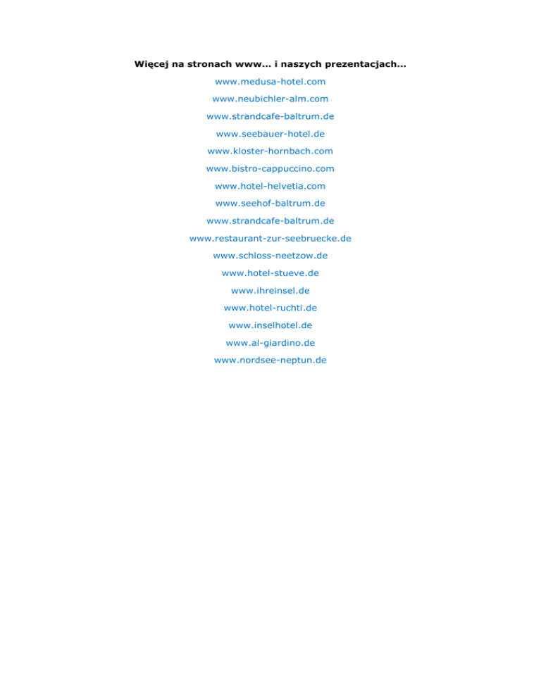 Więcej na stronach www… i naszych prezentacjach… www.medusa-hotel.com www.neubichler-alm.com www.strandcafe-baltrum.de www.seebauer-hotel.de www.kloster-hornbach.com www.bistro-cappuccino.com www.hotel-helvetia.com www.seehof-baltrum.de www.strandcafe-baltrum.de www.restaurant-zur-seebruecke.de www.schloss-neetzow.de www.hotel-stueve.de www.ihreinsel.de www.hotel-ruchti.de www.inselhotel.de www.al-giardino.de www.nordsee-neptun.de