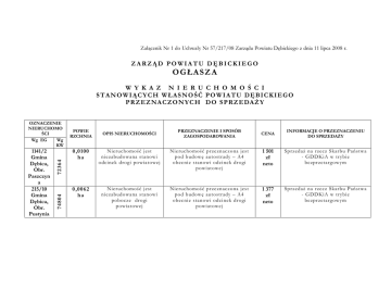 Załącznik Nr 1 do Uchwały Nr 57/217/08 Zarządu Powiatu Dębickiego z dnia 11 lipca 2008 r. ZARZĄD POWIATU DĘBICKIEGO OGŁASZA W Y K A Z N I E R U C H O M O Ś C I STANOWIĄCYCH WŁASNOŚĆ POWIATU DĘBICKIEGO P R Z E Z NA C Z O N YC H D O S P R Z E DA Ż Y 74804 1141/2 Gmina Dębica, Obr. Paszczyn a 215/10 Gmina Dębica, Obr. Pustynia 72364 OZNACZENIE NIERUCHOMO ŚCI Wg EG Wg KW POWIE RZCHNIA OPIS NIERUCHOMOŚCI PRZEZNACZENIE I SPOSÓB ZAGOSPODAROWANIA CENA INFORMACJE O PRZEZNACZENIU DO SPRZEDAŻY 0,0100 ha Nieruchomość jest niezabudowana stanowi odcinek drogi powiatowej Nieruchomość przeznaczona jest pod budowę autostrady – A4 obecnie stanowi odcinek drogi powiatowej 1 501 zł neto Sprzedaż na rzecz Skarbu Państwa - GDDKiA w trybie bezprzetargowym 0,0062 ha Nieruchomość jest niezabudowana stanowi pobocze drogi powiatowej Nieruchomość przeznaczona jest pod budowę autostrady – A4 obecnie stanowi odcinek drogi powiatowej 1 377 zł neto Sprzedaż na rzecz Skarbu Państwa - GDDKiA w trybie bezprzetargowym 430/168 Miasto Dębica, Obr. Nr 2 430/170 Miasto Dębica, Obr. Nr 2 Działka w kształcie prostokąta, uzbrojenie pełne, teren płaski. Przez działkę przebiega droga asfaltową stanowiąca dojazd do dz. 430/5 i 430/42 . 0,3145 ha Działka w kształcie prostokąta, uzbrojenie pełne, teren płaski, część działki posiada nawierzchnię – drogę asfaltową. 0,0704 ha Działka w kształcie prostokąta, uzbrojenie pełne, teren płaski. Przez działkę przebiega droga asfaltową stanowiąca dojazd do obiektów WUCH. 0,1845 ha Działka w kształcie prostokąta, uzbrojenie pełne, teren płaski. Działka prawie w całości utwardzona kostką betonową i asfaltem 56270 56270 0,0572 ha 56270 430/167 Miasto Dębica, Obr. Nr 2 56270 430/148 Miasto Dębica, Obr. Nr 2 Teren dz. nie jest objęty planem zagospodarowania przestrzennego, zgodnie z zapisem w studium obszar ten przeznaczony jest na działalność przemysłową bądź usługową Obecnie teren dz. w części stanowi drogę dojazdową w części zieleniec. Teren dz. nie jest objęty planem zagospodarowania przestrzennego, zgodnie z zapisem w studium obszar ten przeznaczony jest na działalność przemysłową bądź usługową Obecnie teren dz. stanowi zieleniec na przedpolu WUCH. Teren dz. nie jest objęty planem zagospodarowania przestrzennego, zgodnie z zapisem w studium obszar ten przeznaczony jest na działalność przemysłową bądź usługową Obecnie dz. stanowi drogę dojazdową Teren dz. nie jest objęty planem zagospodarowania przestrzennego, zgodnie z zapisem w studium obszar ten przeznaczony jest na działalność przemysłową bądź usługową Obecnie działka zagospodarowana jest jako parking 32 000 zł neto Sprzedaż na poprawę war. zagospod. nier. sąsiedniej dz. 430/5 w trybie bezprzetargowym 150 000 zł neto Sprzedaż w trybie przetargu nieograniczonego 39 000 zł neto Sprzedaż na poprawę war. zagospod. nier. sąsiedniej dz. 430/55 w trybie bezprzetargowym 102 000 zł neto Sprzedaż w trybie przetargu ograniczonego n ier uc h o mo ści zo stała p r ze zn a czo n a do sp r ze daży p o d w ar un ki em p r ze zn ac ze n ia je j n a r o zw ó j f ir m dzia łają cy ch n a te re n ie p o p r zedn i o za jm o wa ny m p r zez W UCH stąd w p r ze tar gu mo g ą w zią ć udzia ł wła śc ici el e b ą dź uzyt . wi ec z. n ie r uch o m o śc i p o ło żo n ych na te r en ie p o p r zedn i o za jm o wa n ym p r ze z WUCH w cel u p o sze rzen i a p r o wa dzo n ej działa ln o ści 430/172 Miasto Dębica, Obr. Nr 2 0,1044 ha Działka w kształcie prostokąta, uzbrojenie pełne, teren płaski Działka prawie w całości utwardzona kostką betonową i asfaltem Teren dz. nie jest objęty planem zagospodarowania przestrzennego, zgodnie z zapisem w studium obszar ten przeznaczony jest na działalność przemysłową bądź usługową Obecnie działka zagospodarowana jest jako parking 50 000 zł neto Sprzedaż w trybie przetargu ograniczonego n ie r uch o m o ść zo sta ła 0,0327 ha Działka w kształcie prostokąta, uzbrojenie pełne, teren płaski. Przez działkę przebiega droga asfaltową stanowiąca dojazd do dz. 430/3 i 430/4 i 430/136 Teren dz. nie jest objęty planem zagospodarowania przestrzennego, zgodnie z zapisem w studium obszar ten przeznaczony jest na działalność przemysłową bądź usługową. Działka zagospodarowana jest jako droga dojazdowa. 18 100 zł netto Sprzedaż na poprawę war. zagospod. nier. sąsiednich dz. 430/3 i 430/136 w trybie bezprzetargowym 56270 56270 430/171 Miasto Dębica, Obr. Nr 2 p r zezn ac zo n a do sp r zeda ży p o d wa runk iem p r zezn a czen ia j ej n a r o zw ó j f ir m dzia łają cy ch n a te re n ie p o p r zedn i o za jm o wa ny m p r zez W UCH stąd w p r ze tar gu mo g ą w zią ć udzia ł wła śc ici el e b ą dź uzyt . wi ec z. n ie r uch o m o śc i p o ło żo n ych na te r en ie p o p r zedn i o za jm o wa ny m p r zez WUCH w cel u p o sze rzen i a p r o wa dzo n ej działa ln o ści Uwaga: w wykazie podane są ceny netto do ceny doliczony będzie podatek od towarów i usług w wysokości zgodnej z obowiązującymi przepisami Terminy wnoszenia opłat: Cena nabycia nieruchomości będzie płatna jednorazowo przed zawarciem umowy notarialnej, ponadto nabywca ponosi należne podatki, koszty i opłaty wynikłe z zawarcia notarialnej umowy sprzedaży. Pierwszeństwo nabycia: 1. Przysługuje osobom wymienionym w art. 34 ust.1 pkt 1-3 ustawy z dnia 21 sierpnia 1997 r. o gospodarce nieruchomościami (t.j. Dz.U. z 2004 r. Nr 261, poz. 2603 z późn.zm.), pod warunkiem złożenia wniosku o nabycie do dnia 2008-08-25 W razie uchybienia w/w terminu pierwszeństwo wygasa. 2. Osoby, o których mowa w punkcie 1) nabywają nieruchomość na warunkach określonych w art.67 ust.3 i 3a ustawy o gospodarce nieruchomościami. Szczegółowych informacji udziela: Wydz. Gospodarki Nieruchomościami ul. Ogrodowa 4, pok. 10, tel. 14 6803110. Niniejszy wykaz p