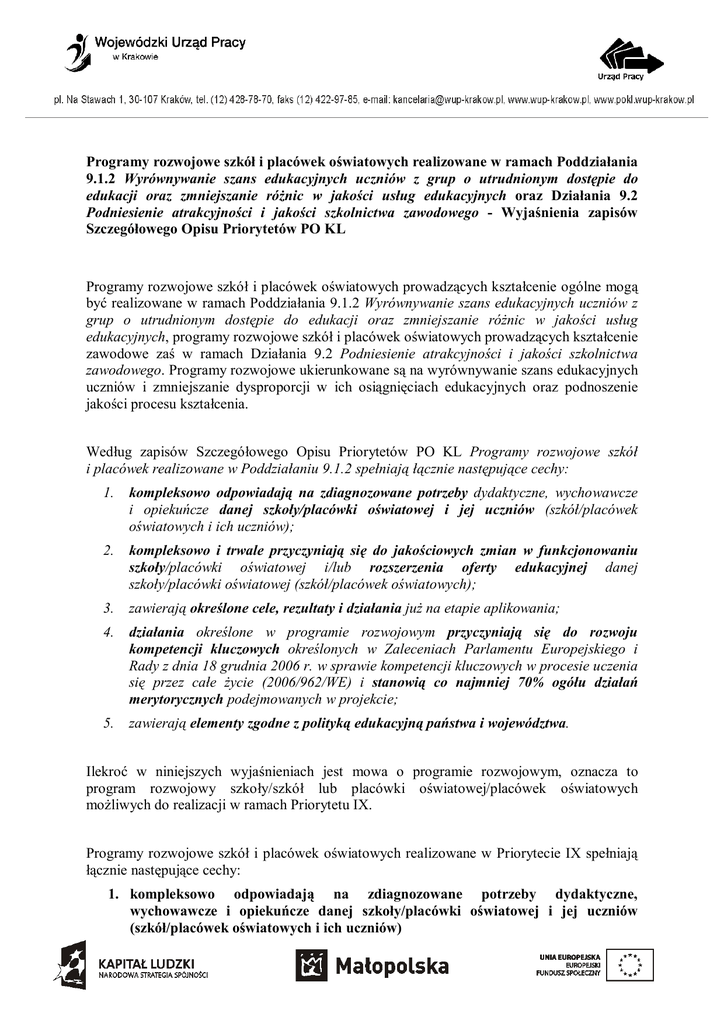 Programy rozwojowe szkół i placówek oświatowych realizowane w ramach Poddziałania 9.1.2 Wyrównywanie szans edukacyjnych uczniów z grup o utrudnionym dostępie do edukacji oraz zmniejszanie różnic w jakości usług edukacyjnych oraz Działania 9.2 Podniesienie atrakcyjności i jakości szkolnictwa zawodowego - Wyjaśnienia zapisów Szczegółowego Opisu Priorytetów PO KL Programy rozwojowe szkół i placówek oświatowych prowadzących kształcenie ogólne mogą być realizowane w ramach Poddziałania 9.1.2 Wyrównywanie szans edukacyjnych uczniów z grup o utrudnionym dostępie do edukacji oraz zmniejszanie różnic w jakości usług edukacyjnych, programy rozwojowe szkół i placówek oświatowych prowadzących kształcenie zawodowe zaś w ramach Działania 9.2 Podniesienie atrakcyjności i jakości szkolnictwa zawodowego. Programy rozwojowe ukierunkowane są na wyrównywanie szans edukacyjnych uczniów i zmniejszanie dysproporcji w ich osiągnięciach edukacyjnych oraz podnoszenie jakości procesu kształcenia. Według zapisów Szczegółowego Opisu Priorytetów PO KL Programy rozwojowe szkół i placówek realizowane w Poddziałaniu 9.1.2 spełniają łącznie następujące cechy: 1. kompleksowo odpowiadają na zdiagnozowane potrzeby dydaktyczne, wychowawcze i opiekuńcze danej szkoły/placówki oświatowej i jej uczniów (szkół/placówek oświatowych i ich uczniów); 2. kompleksowo i trwale przyczyniają się do jakościowych zmian w funkcjonowaniu szkoły/placówki oświatowej i/lub rozszerzenia oferty edukacyjnej danej szkoły/placówki oświatowej (szkół/placówek oświatowych); 3. zawierają określone cele, rezultaty i działania już na etapie aplikowania; 4. działania określone w programie rozwojowym przyczyniają się do rozwoju kompetencji kluczowych określonych w Zaleceniach Parlamentu Europejskiego i Rady z dnia 18 grudnia 2006 r. w sprawie kompetencji kluczowych w procesie uczenia się przez całe życie (2006/962/WE) i stanowią co najmniej 70% ogółu działań merytorycznych podejmowanych w projekcie; 5. zawierają elementy zgodne z polityką edukacyjną państwa i województwa. Ilekroć w niniejszych wyjaśnieniach jest mowa o programie rozwojowym, oznacza to program rozwojowy szkoły/szkół lub placówki oświatowej/placówek oświatowych możliwych do realizacji w ramach Priorytetu IX. Programy rozwojowe szkół i placówek oświatowych realizowane w Priorytecie IX spełniają łącznie następujące cechy: 1. kompleksowo odpowiadają na zdiagnozowane potrzeby dydaktyczne, wychowawcze i opiekuńcze danej szkoły/placówki oświatowej i jej uczniów (szkół/placówek oświatowych i ich uczniów) Program rozwojowy jest odpowiedzią na problemy danej szkoły/placówki oświatowej, a ich diagnoza powinna być podstawą przyjętych rozwiązań ujętych w programie rozwojowym. Program rozwojowy powinien być kompleksową próbą rozwiązania zdiagnozowanych problemów, co oznacza, że powinien w sposób możliwie jak najszerszy traktować istniejące potrzeby dydaktyczne, wychowawcze i opiekuńcze danej szkoły lub placówki. Nie może zatem stanowić programu rozwojowego projekt, który nie zawiera diagnozy potrzeb szkoły lub placówki oświatowej. Potrzeby danej szkoły mogą (i powinny w szczególności w odniesieniu do szkól zawodowych i ponadgimnazjalnych) wynikać z sytuacji na lokalnym lub regionalnym rynku pracy. Odpowiedź na powyższe potrzeby powinna skutkować rozszerzeniem oferty edukacyjnej danej szkoły lub prowadzić do podniesienia jakości świadczonych usług edukacyjnych. Warunkiem spełnienia powyższej przesłanki jest realizacja programu rozwojowego w ramach działalności szkoły (w odróżnieniu do projektów realizowanych w Priorytecie III, w którym zajęcia mogą odbywać się poza szkołą). 2. kompleksowo i trwale przyczyniają się do jakościowych zmian w funkcjonowaniu szkoły/placówki oświatowej i/lub rozszerzenia oferty edukacyjnej danej szkoły/placówki oświatowej (szkół/placówek oświatowych) W zależności od analizy potrzeb i polityki edukacyjnej danej szkoły lub placówki oświatowej może ona stworzyć program rozwojowy ukierunkowany na: - reformę szkoły, w celu podniesienia jakości i atrakcyjności dotychczasowej oferty i/lub - program rozwojowy ukierunkowany na rozszerzenie oferty edukacyjnej, w celu dopasowania tej oferty do potrzeb lokalnego/regionalnego rynku pracy. Oba podejścia do programu rozwojowego wpisują się w cele zarówno Działania 9.1 jak i Działania 9.2. Kompleksowe podejście do rozszerzenia oferty edukacyjnej i/lub reformy danej szkoły oznacza systemowe podejście do rozwoju szkoły lub placówki oświatowej i jest powiązane z przesłanką nr 1. Kompleksowość odnosi się zatem zarówno do diagnozy potrzeb, jak i działań podejmowanych w wyniku tej diagnozy. Należy ją rozpatrywać w kontekście wszystkich elementów wniosku oraz w kontekście celów i wartości dodanej projektu. Każdorazowo ocena kompleksowości należy do osoby dokonującej oceny merytorycznej wniosku. Należy zaznaczyć, że programem rozwojowym w żadnym z powyższych rodzajów programów rozwojowych nie mogą być np. jedynie zajęcia z j. obcego czy też zajęcia sportowe, bo mimo że podniosą atrakcyjność oferty edukacyjnej danej szkoły, to nie będzie to systemowe podejście do rozszerzenia oferty edukacyjnej. Program rozwojowy powinien w sposób całościowy (systemowy) i trwały przyczyniać się do rozwoju szkoły/placówki oświatowej. Program rozwojowy powinien zatem koncentrować się na wywołaniu efektu trwałej zmiany pracy szkoły (np. wprowadzeniu nowych elementów nauczania, mechanizmów dostosowania oferty edukacyjnej do potrzeb rynku pracy, itp.). Efekt trwałej zmiany pracy szkoły może również wynikać z osiągniętych rezultatów miękkich programu rozwojowego (np. doświadczenie i kwalifikacje nauczycieli zdobyte podczas realizacji programu rozwojowego są wykorzystywane w