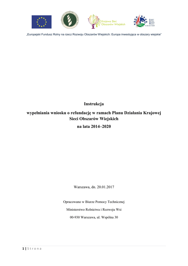 „Europejski Fundusz Rolny na rzecz Rozwoju Obszarów Wiejskich: Europa inwestująca w obszary wiejskie” Instrukcja wypełniania wniosku o refundację w ramach Planu Działania Krajowej Sieci Obszarów Wiejskich na lata 2014–2020 Warszawa, dn. 20.01.2017 Opracowano w Biurze Pomocy Technicznej Ministerstwo Rolnictwa i Rozwoju Wsi 00-930 Warszawa, ul. Wspólna 30 1|Strona „Europejski Fundusz Rolny na rzecz Rozwoju Obszarów Wiejskich: Europa inwestująca w obszary wiejskie” Informacje ogólne 1. Wniosek o refundację w ramach w ramach Planu Działania Krajowej Sieci Obszarów Wiejskich na lata 2014–2020 (dalej zwanym wnioskiem o refundację kosztów) sporządzany jest na formularzu przygotowanym przez Ministerstwo Rolnictwa i Rozwoju Wsi, udostępnionym na jego stronie www.minrol.gov.pl oraz na stronie Krajowej Sieci Obszarów Wiejskich www.ksow.gov.pl. 2. Przed wypełnieniem wniosku o refundację i załączników należy zapoznać się z treścią niniejszej Instrukcji wypełniania wniosku o refundację kosztów w ramach Planu Działania Krajowej Sieci Obszarów Wiejskich na lata 2014-2020 (dalej zwaną instrukcją). 3. Formularz wniosku o refundację Partner KSOW wypełnia w przypadku, gdy: występuje o refundację poniesionych kosztów kwalifikowanych na realizację operacji, dokonuje korekty wniosku o refundację kosztów. 4. Wszystkie pola we wniosku o refundacje należy wypełnić. Nie należy pozostawiać pól pustych. W przypadku pól nieobowiązkowych należy wstawić „nie dotyczy’. 5. Pola wypełnione kolorem szarym we wniosku o refundację wypełnia jednostka upoważniona do zawarcia umowy z partnerem KSOW. Pole „zatwierdzono do refundacji” – wypełnia jednostka upoważniona do udzielenia refundacji poniesionych kosztów Partnerowi KSOW. 6. Pole „data wystawienia” – wypełnia Partner KSOW wskazując na datę sporządzenia wniosku o refundację. 7. Jeżeli dane pole we wniosku o refundację nie dotyczy Partnera KSOW, należy pozostawić je puste, chyba że w instrukcji podano inaczej. 8. Dane finansowe, znajdujące się we wniosku o refundację, powinny być wyrażone w PLN z dokładnością do dwóch miejsc po przecinku. 9. Przed złożeniem wniosku o refundację należy upewnić się, czy wypełnione zostały wszystkie wymagane pola oraz czy zostały podpisane, wypełnione i dołączone wszystkie wymagane załączniki i dokumenty. 10. Oryginał wniosku o refundację kosztów wraz z dwoma kompletami wymaganych załączników, w wersji papierowej i elektronicznej w formacie edytowalnym zapisany na informatycznym nośniku danych w formacie umożliwiającym edycję tekstu, składa się osobiście w siedzibie jednostki upoważnionej do zawarcia umowy albo wysyła przesyłką rejestrowaną w polskiej placówce operatora wyznaczonego w rozumieniu ustawy z dnia 23 listopada 2012 r. – Prawo pocztowe (Dz. U. z 2016 r. poz. 1113 2|Strona „Europejski Fundusz Rolny na rzecz Rozwoju Obszarów Wiejskich: Europa inwestująca w obszary wiejskie” i 1250), w terminie wskazanym w umowie na realizację operacji w ramach Planu Działania Krajowej Sieci Obszarów Wiejskich na lata 2014–2020. 11. Datą złożenia wniosku o refundację kosztów wraz z załącznikami jest data złożenia osobiście w siedzibie jednostki upoważnionej do zawarcia umowy lub data nadania za pomocą przesyłki rejestrowanej. 12. Dokumenty powinny być ułożone w kolejności, zgodnie z wykazem faktur lub dokumentów o równoważnej wartości dowodowej potwierdzających poniesienia kosztów kwalifikowanych. Pod każdym dokumentem finansowym powinien być zamieszczony jego dowód zapłaty. 13. Partner KSOW powinien posiadać w swej siedzibie egzemplarz złożonego wniosku o refundację. Pełna dokumentacja ze zrealizowanej operacji powinna być przechowywana w siedzibie Partnera KSOW w terminie 5 lat od dnia wypłaty przez Agencję Restrukturyzacji i Modernizacji Rolnictwa środków z tytułu tej operacji. 14. W przypadku, gdy nie ma możliwości złożenia wniosku o refundację w terminie, należy bezzwłocznie poinformować jednostkę upoważnioną do zawarcia umowy o zaistniałym fakcie. Instrukcja wypełniania poszczególnych części wniosku o refundację kosztów I Część ogólna 1. Rodzaj składanego wniosku – z listy rozwijanej należy wybrać rodzaj składanego wniosku: 2. wniosek o refundację – należy wybrać w przypadku składania wniosku o refundację kosztów kwalifikowanych, korekta wniosku o refundację – należy wybrać w przypadku składania uzupełnienia/poprawy wniosku do wcześniej już złożonego wniosku o refundację. Nazwa działania - z listy rozwijanej należy wybrać działanie, w ramach którego jest realizowana operacja: Działanie 4. Szkolenia i działania na rzecz tworzenia sieci kontaktów dla Lokalnych Grup Działania (LGD), w tym zapewnianie pomocy technicznej w zakresie współpracy międzyterytorialnej i międzynarodowej, Działanie 5. Poszukiwanie partnerów KSOW do współpracy w ramach działania „Współpraca”, o którym mowa w art. 3 ust.1 pkt. 13 ustawy o wspieraniu rozwoju 3|Strona „Europejski Fundusz Rolny na rzecz Rozwoju Obszarów Wiejskich: Europa inwestująca w obszary wiejskie” 3. obszarów wiejskich z udziałem środków EFRROW w ramach PROW na lata 2014-2020 oraz ułatwianie tej współpracy, Działanie 6. Ułatwianie wymiany wiedzy pomiędzy podmiotami uczestniczącymi w rozwoju obszarów wiejskich oraz wymiana i rozpowszechnianie rezultatów działań na rzecz tego rozwoju, Działanie 9. Wspieranie współpracy w sektorze rolnym i realizacji przez rolników wspólnych inwestycji, Działanie 10. Organizacja i udział w targach, wystawach tematycznych na rzecz prezentacji osiągnięć i promocji polskiej wsi w kraju i za granicą, Działanie 11. Aktywizacja mieszkańców wsi na rzecz podejmowania inicjatyw służących włączeniu społecznemu, w szczególności osób starszych, młodzieży, niepełnosprawnych, mniejszości