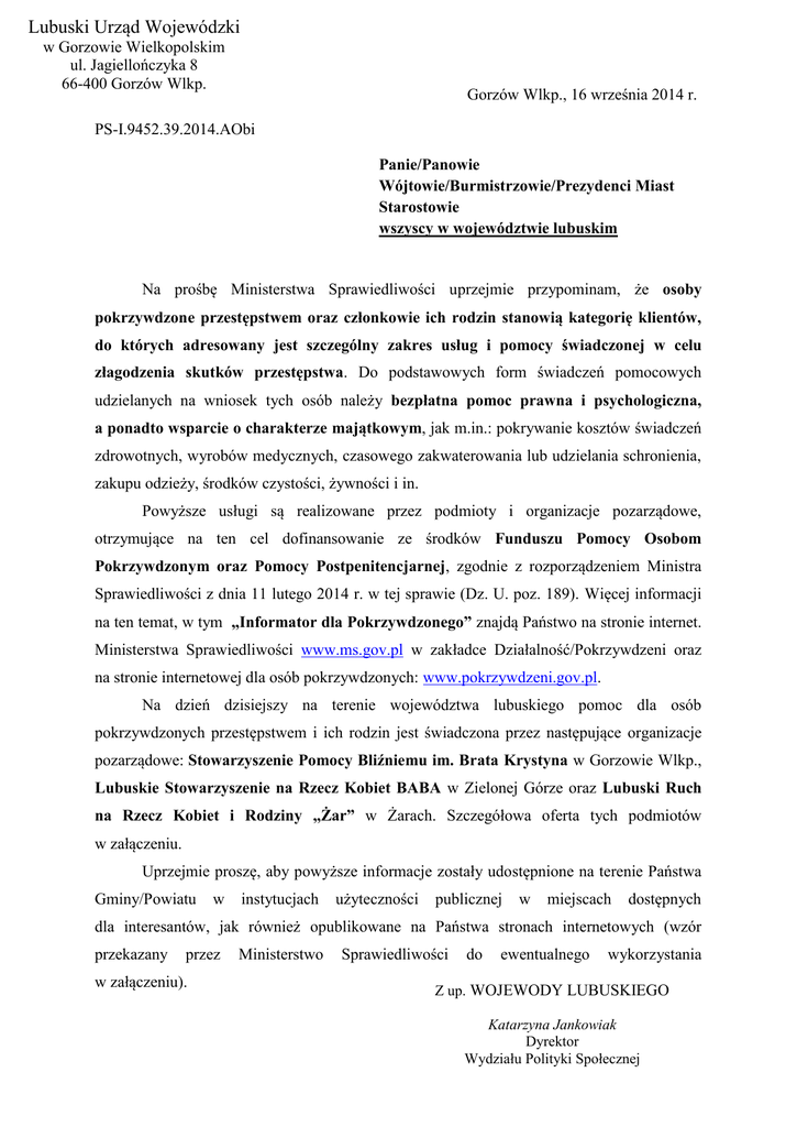 Lubuski Urząd Wojewódzki w Gorzowie Wielkopolskim ul. Jagiellończyka 8 66-400 Gorzów Wlkp. Gorzów Wlkp., 16 września 2014 r. PS-I.9452.39.2014.AObi Panie/Panowie Wójtowie/Burmistrzowie/Prezydenci Miast Starostowie wszyscy w województwie lubuskim Na prośbę Ministerstwa Sprawiedliwości uprzejmie przypominam, że osoby pokrzywdzone przestępstwem oraz członkowie ich rodzin stanowią kategorię klientów, do których adresowany jest szczególny zakres usług i pomocy świadczonej w celu złagodzenia skutków przestępstwa. Do podstawowych form świadczeń pomocowych udzielanych na wniosek tych osób należy bezpłatna pomoc prawna i psychologiczna, a ponadto wsparcie o charakterze majątkowym, jak m.in.: pokrywanie kosztów świadczeń zdrowotnych, wyrobów medycznych, czasowego zakwaterowania lub udzielania schronienia, zakupu odzieży, środków czystości, żywności i in. Powyższe usługi są realizowane przez podmioty i organizacje pozarządowe, otrzymujące na ten cel dofinansowanie ze środków Funduszu Pomocy Osobom Pokrzywdzonym oraz Pomocy Postpenitencjarnej, zgodnie z rozporządzeniem Ministra Sprawiedliwości z dnia 11 lutego 2014 r. w tej sprawie (Dz. U. poz. 189). Więcej informacji na ten temat, w tym „Informator dla Pokrzywdzonego” znajdą Państwo na stronie internet. Ministerstwa Sprawiedliwości www.ms.gov.pl w zakładce Działalność/Pokrzywdzeni oraz na stronie internetowej dla osób pokrzywdzonych: www.pokrzywdzeni.gov.pl. Na dzień dzisiejszy na terenie województwa lubuskiego pomoc dla osób pokrzywdzonych przestępstwem i ich rodzin jest świadczona przez następujące organizacje pozarządowe: Stowarzyszenie Pomocy Bliźniemu im. Brata Krystyna w Gorzowie Wlkp., Lubuskie Stowarzyszenie na Rzecz Kobiet BABA w Zielonej Górze oraz Lubuski Ruch na Rzecz Kobiet i Rodziny „Żar” w Żarach. Szczegółowa oferta tych podmiotów w załączeniu. Uprzejmie proszę, aby powyższe informacje zostały udostępnione na terenie Państwa Gminy/Powiatu w instytucjach użyteczności publicznej w miejscach dostępnych dla interesantów, jak również opublikowane na Państwa stronach internetowych (wzór przekazany przez w załączeniu). Ministerstwo Sprawiedliwości do ewentualnego wykorzystania Z up. WOJEWODY LUBUSKIEGO Katarzyna Jankowiak Dyrektor Wydziału Polityki Społecznej