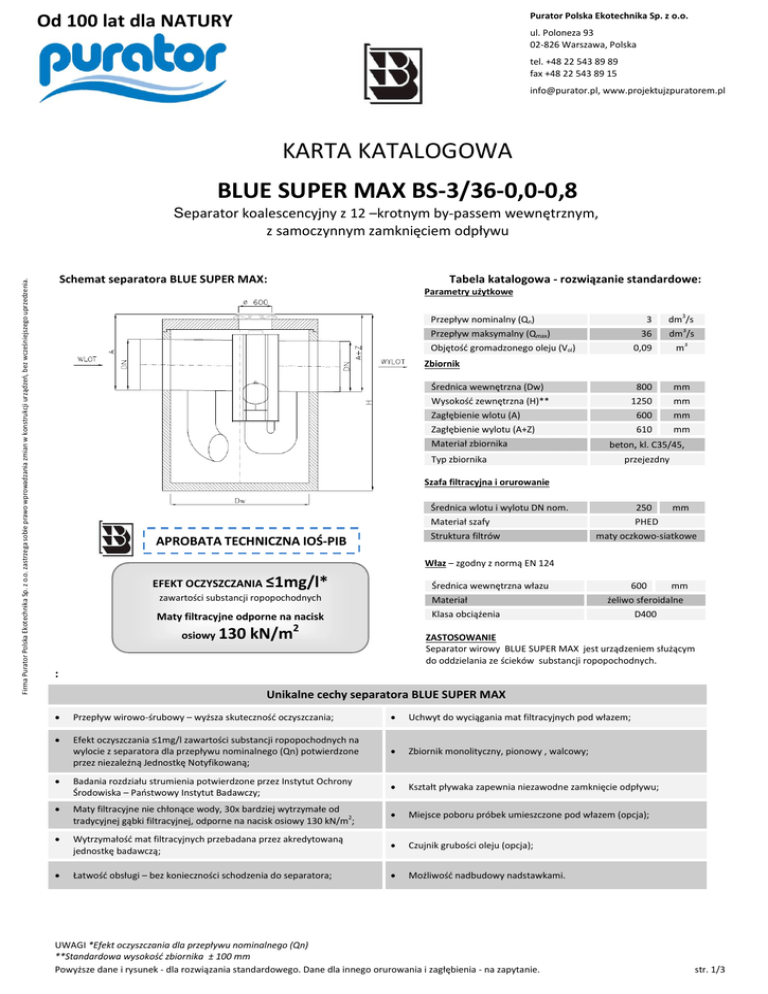 Purator Polska Ekotechnika Sp. z o.o. Od 100 lat dla NATURY ul. Poloneza 93 02-826 Warszawa, Polska tel. +48 22 543 89 89 fax +48 22 543 89 15 [email protected], www.projektujzpuratorem.pl KARTA KATALOGOWA BLUE SUPER MAX BS-3/36-0,0-0,8 Firma Purator Polska Ekotechnika Sp. z o.o. zastrzega sobie prawo wprowadzania zmian w konstrukcji urządzeń, bez wcześniejszego uprzedzenia. Separator koalescencyjny z 12 –krotnym by-passem wewnętrznym, z samoczynnym zamknięciem odpływu Schemat separatora BLUE SUPER MAX: Tabela katalogowa - rozwiązanie standardowe: Parametry użytkowe Przepływ nominalny (Qn) Przepływ maksymalny (Qmax) Objętość gromadzonego oleju (Vol) 3 36 0,09 dm3/s dm3/s m3 800 1250 600 610 mm mm mm mm Zbiornik Średnica wewnętrzna (Dw) Wysokość zewnętrzna (H)** Zagłębienie wlotu (A) Zagłębienie wylotu (A+Z) Materiał zbiornika Typ zbiornika beton, kl. C35/45, przejezdny Szafa filtracyjna i orurowanie Średnica wlotu i wylotu DN nom. Materiał szafy Struktura filtrów APROBATA TECHNICZNA IOŚ-PIB 250 mm PHED maty oczkowo-siatkowe Właz – zgodny z normą EN 124 EFEKT OCZYSZCZANIA ≤1mg/l* Średnica wewnętrzna włazu Materiał Klasa obciążenia zawartości substancji ropopochodnych Maty filtracyjne odporne na nacisk 2 osiowy 130 kN/m 600 mm żeliwo sferoidalne D400 ZASTOSOWANIE Separator wirowy BLUE SUPER MAX jest urządzeniem służącym do oddzielania ze ścieków substancji ropopochodnych. : Unikalne cechy separatora BLUE SUPER MAX Przepływ wirowo-śrubowy – wyższa skuteczność oczyszczania; Uchwyt do wyciągania mat filtracyjnych pod włazem; Efekt oczyszczania ≤1mg/l zawartości substancji ropopochodnych na wylocie z separatora dla przepływu nominalnego (Qn) potwierdzone przez niezależną Jednostkę Notyfikowaną; Zbiornik monolityczny, pionowy , walcowy; Badania rozdziału strumienia potwierdzone przez Instytut Ochrony Środowiska – Państwowy Instytut Badawczy; Kształt pływaka zapewnia niezawodne zamknięcie odpływu; Maty filtracyjne nie chłonące wody, 30x bardziej wytrzymałe od tradycyjnej gąbki filtracyjnej, odporne na nacisk osiowy 130 kN/m2; Miejsce poboru próbek umieszczone pod włazem (opcja); Wytrzymałość mat filtracyjnych przebadana przez akredytowaną jednostkę badawczą; Czujnik grubości oleju (opcja); Łatwość obsługi – bez konieczności schodzenia do separatora; Możliwość nadbudowy nadstawkami. UWAGI *Efekt oczyszczania dla przepływu nominalnego (Qn) **Standardowa wysokość zbiornika ± 100 mm Powyższe dane i rysunek - dla rozwiązania standardowego. Dane dla innego orurowania i zagłębienia - na zapytanie. str. 1/3 Od 100 lat dla NATURY Purator Polska Ekotechnika Sp. z o.o. ul. Poloneza 93 02-826 Warszawa, Polska tel. +48 22 543 89 89 fax +48 22 543 89 15 [email protected], www.projektujzpuratorem.pl OPIS TECHNICZNY KOALESCENCYJNEGO SEPARATORA BLUE SUPER MAX BS-3/36-0,0-0,8 Przeznaczenie separatora Wysokosprawny, przeciążalny separator z by-passem wewnętrznym BLUE SUPER MAX, w którym zachodzi dwustopniowy proces oczyszczania (wirowo – śrubowy oraz koalescencyjny), cechuje efekt oczyszczania ≤1mg/l zawartości substancji ropopochodnych na wylocie z separatora.* Urządzenia zgodne z prawem budowlanym, są oznakowane znakiem B. Separatory posiadają aktualna aprobatę techniczną Instytutu Ochrony środowiska – Państwowego Instytutu Badawczego (IOŚ-PIB). Separatory BLUE SUPER MAX przeznaczone są do oddzielania substancji ropopochodnych zawartych w ściekach deszczowych oraz przemysłowych. Separatory typoszeregu BLUE SUPER MAX można stosować tam, gdzie wymagany jest najwyższy stopień separacji substancji ropopochodnych – np. z obiektów handlowych, logistycznych, parkingów, a także w przypadku kierowania odpływu do wód o zaostrzonych wymaganiach (np. rezerwaty przyrody, obszary Natura 2000 itp.). Materiały wykonania Separator zbudowany jest z monolitycznego zbiornika betonowego z możliwością nadbudowy. Betonowe prefabrykaty wykonane są zgodnie z wymaganiami normy PN-EN 13365 z betonu klasy C35/45, gwarantującego następujące parametry: wytrzymałość na ściskanie ≥35 MPa, nasiąkliwość ≤5%, wodoszczelność co najmniej W8, mrozoodporność F150, klasy Wizualizacja przepływu wewnątrz separatora. ekspozycji: XC4, XS3, XD3, XF1, XA1 (do XA3 na zapytanie). Zbiornik separatora zabezpieczony jest dodatkowo specjalną farbą zapewniającą pełną szczelność oraz odporność na substancje ropopochodne. Wszystkie elementy wyposażenia wewnętrznego i zewnętrznego separatora, wykonane są z materiałów odpornych na pracę w środowisku agresywnym i nie wymagają dodatkowego izolowania oraz uszczelniania. Zasada działania separatora Separatory BLUE SUPER MAX to separatory przeciążalne obejściowe (z by-passem), w których dopływ ścieków rozdzielany jest w urządzeniu na przepływ nominalny Qn oczyszczany z maksymalną sprawnością oraz przepływ ponadnominalny (od wartości przekraczającej Qn aż do Qmax) – który jest kierowany do obejścia hydraulicznego (by-passu wewnętrznego). Budowa separatora Koalescencyjny separator substancji ropopochodnych typu BLUE SUPER MAX składa się z następujących elementów: a) zbiornik betonowy, b) właz, c) obejście hydrauliczne (by-pass wewnętrzny), d) szafa filtracyjna (z matami filtracyjnymi przebadanymi przez niezależną Jednostkę Notyfikowaną), e) hydraulicznie zoptymalizowana rura wlotowa wymuszająca ruch wirowo-śrubowy Wizualizacja separatora BLUE SUPER MAX ścieków. Zanieczyszczone wody deszczowe wpływają przez wlot rury by-passowej do specjalnie wyprofilowanej rury, która zapewnia lepszy przebieg procesu separacji poprzez wytworzenie wirowo-śrubowego przepływu wewnątrz urządzenia – pozwala to w pełni wykorzystać pojemność separatora. Już na wylocie z wyprofilowanej rury rozpoczyna się proces sedymentacji osadu zawartego w ściekach - opada on na dno zbiornika, a krople oleju mineralnych rozpoczyn