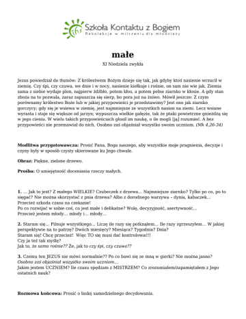 małe XI Niedziela zwykła Jezus powiedział do tłumów: Z królestwem Bożym dzieje się tak, jak gdyby ktoś nasienie wrzucił w ziemię. Czy śpi, czy czuwa, we dnie i w nocy, nasienie kiełkuje i rośnie, on sam nie wie jak. Ziemia sama z siebie wydaje plon, najpierw źdźbło, potem kłos, a potem pełne ziarnko w kłosie. A gdy stan zboża na to pozwala, zaraz zapuszcza się sierp, bo pora już na żniwo. Mówił jeszcze: Z czym porównamy królestwo Boże lub w jakiej przypowieści je przedstawimy? Jest ono jak ziarnko gorczycy; gdy się je wsiewa w ziemię, jest najmniejsze ze wszystkich nasion na ziemi. Lecz wsiane wyrasta i staje się większe od jarzyn; wypuszcza wielkie gałęzie, tak że ptaki powietrzne gnieżdżą się w jego cieniu. W wielu takich przypowieściach głosił im naukę, o ile mogli [ją] rozumieć. A bez przypowieści nie przemawiał do nich. Osobno zaś objaśniał wszystko swoim uczniom. (Mk 4,26-34) Modlitwa przygotowawcza: Prosić Pana, Boga naszego, aby wszystkie moje pragnienia, decyzje i czyny były w sposób czysty skierowane ku Jego chwale. Obraz: Piękne, zielone drzewo. Prośba: O umiejętność doceniania rzeczy małych. 1. … Jak to jest? Z małego WIELKIE? Czubeczek z drzewa… Najmniejsze ziarnko? Tylko po co, po to sięgać? Nie można skorzystać z pnia drzewa? Albo z dorodnego warzywa – dynia, kabaczek… Przecież szkoda czasu na czekanie! Po co rozwijać w sobie coś, co jest małe i delikatne? Wolę, decyzyjność, asertywność… Przecież jestem młody… młody i… młody… 2. Staram się… Pilnuje wszystkiego… Liczę ile razy się potknąłem… Ile razy zgrzeszyłem… W jakiej perspektywie na to patrzę? Dwóch miesięcy? Miesiąca? Tygodnia? Dnia? Staram się! Chcę przecież! Więc TO się musi dać kontrolować!! Czy ja też tak myślę? Jak to, że samo rośnie?? Że, jak to czy śpi, czy czuwa?? 3. Czemu ten JEZUS nie mówi normalnie?? Po co bawi się ze mną w gierki? Nie można jasno? Osobno zaś objaśniał wszystko swoim uczniom… Jakim jestem UCZNIEM? Ile czasu spędzam z MISTRZEM? Co zrozumiałem/zapamiętałem z Jego ostatnich nauk? Rozmowa końcowa: Prosić o łaskę samodzielnego decydowania. Na zakończenie odmów: Ojcze nasz…