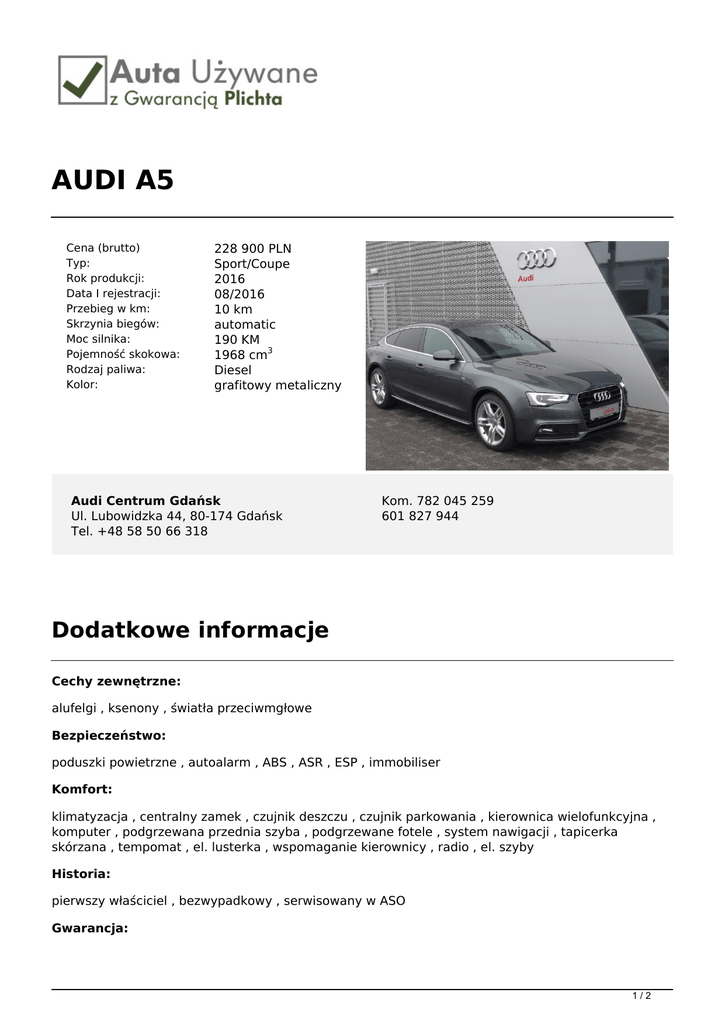 AUDI A5 Cena (brutto) Typ: Rok produkcji: Data I rejestracji: Przebieg w km: Skrzynia biegów: Moc silnika: Pojemność skokowa: Rodzaj paliwa: Kolor: 228 900 PLN Sport/Coupe 2016 08/2016 10 km automatic 190 KM 1968 cm3 Diesel grafitowy metaliczny Audi Centrum Gdańsk Ul. Lubowidzka 44, 80-174 Gdańsk Tel. +48 58 50 66 318 Kom. 782 045 259 601 827 944 Dodatkowe informacje Cechy zewnętrzne: alufelgi , ksenony , światła przeciwmgłowe Bezpieczeństwo: poduszki powietrzne , autoalarm , ABS , ASR , ESP , immobiliser Komfort: klimatyzacja , centralny zamek , czujnik deszczu , czujnik parkowania , kierownica wielofunkcyjna , komputer , podgrzewana przednia szyba , podgrzewane fotele , system nawigacji , tapicerka skórzana , tempomat , el. lusterka , wspomaganie kierownicy , radio , el. szyby Historia: pierwszy właściciel , bezwypadkowy , serwisowany w ASO Gwarancja: 1/2 Gwarancja Fabryczna Gwarancja Szanowni Państwo, Pragniemy Państwa poinformować, iż firma Plichta – Autoryzowany Dealer Škoda Auto prowadzi skup oraz sprzedaż samochodów używanych wszystkich marek, oferując także samochody używane z gwarancją objęte programem „Auta używane z Gwarancją Plichta”. W ramach programu „Auta Używane z Gwarancją Plichta ” każdy Klient otrzymuje atrakcyjny pakiet zniżek pozwalający zoptymalizować koszty eksploatacji samochodu: -50% na serwis klimatyzacji -50% na ustawienie zbieżności -50% na kosmetykę auta -50% na ścieżkę diagnostyczną -25% na wymiany oleju -25% na zakup opon + 5zł na sezon za hotelowanie opon -15% na części i akcesoria Oferujemy również kompleksową obsługę w zakresie finansowania i ubezpieczenia: - kredyty już od 4,99% - leasingi i kredyty bez zaświadczeń - uproszczone procedury – decyzja już od 30 min. - atrakcyjne pakiety AC/OC/NW/ASS wiodących firm ubezpieczeniowych Możliwość pozostawienia dotychczas użytkowanego auta w rozliczeniu – BEZPŁATNA WYCENA!!! Zapraszamy wszystkich Klientów na jazdę próbną wybranym autem. Numer oferty: G115 Informacja nie stanowi oferty w rozumieniu art. 66 KC. Podane dane mają charakter wyłącznie informacyjny. 2/2 Powered by TCPDF (www.tcpdf.org)