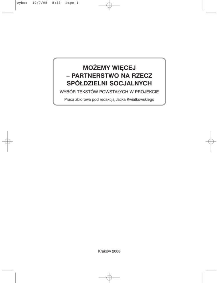 wybor 10/7/08 8:33 Page 1 MO˚EMY WI¢CEJ – PARTNERSTWO NA RZECZ SPÓ¸DZIELNI SOCJALNYCH WYBÓR TEKSTÓW POWSTA¸YCH W PROJEKCIE Praca zbiorowa pod redakcjà Jacka Kwiatkowskiego Kraków 2008 wybor 10/7/08 8:33 Page 2 „Mo˝emy wi´cej – partnerstwo na rzecz spó∏dzielni socjalnych. Wybór tekstów powsta∏ych w projekcie” Praca zbiorowa pod redakcjà Jacka Kwiatkowskiego Zespó∏ redakcyjny w sk∏adzie: Aldona Okraszewska, Janusz Olesiƒski Personel wspomagajàcy: Marcin Papuga Projekt ok∏adki: Studio DTP – Andrzej Sierak Wydawca: FRDL Ma∏opolski Instytut Samorzàdu Terytorialnego i Administracji w Krakowie ul. Szlak 73 a 31-153 Kraków tel./fax: (012) 633 51 54 (012) 633 82 85 www.mistia.pl www.mozemywiecej.pl Publikacja zrealizowana w ramach projektu „Mo˝emy wi´cej – Partnerstwo na rzecz spó∏dzielni socjalnych”. Projekt ten zosta∏ zrealizowany przy udziale Êrodków Europejskiego Funduszu Spo∏ecznego w ramach Inicjatywy Wspólnotowej EQUAL Wydanie I, Kraków 2008 Sk∏ad, przygotowanie do druku, druk: MWM Agencja Wydawnicza ISBN 978-83-924167-9-1 © Copyright by FRDL MISTiA, Kraków 2008 wybor 10/7/08 8:33 Page 3 Spis treÊci Wst´p . . . . . . . . . . . . . . . . . . . . . . . . . . . . . . . . . . . . . . . . . . . . . . . . . . . . . . . . . 4 dr Adam Piechowski Spó∏dzielcze formy gospodarowania w Europie . . . . . . . . . . . . . . . . . . . . . . . . . 6 El˝bieta Bazela, Anna Bulka, Danuta W´grzyn Analiza SWOT spó∏dzielni socjalnych w Polsce – opracowana m. in. w oparciu o doÊwiadczenia Spó∏dzielni „Dla Pracy” w Krakowie . . . . . . . . . . . . . . . . . . . . 17 Katarzyna Kaêmierska Analiza prawna dotyczàca za∏o˝enia i prowadzenia spó∏dzielni socjalnej przez okreÊlone grupy beneficjentów . . . . . . . . . . . . . . . . . . . . . . . . . . . . . . . . 34 Prof. dr hab. Miros∏aw Stec Opinia prawna dotyczàca statusu prawnego spó∏dzielni socjalnych oraz potrzeby dokonania w tym zakresie zmian (na kanwie doÊwiadczeƒ wynikajàcych z realizacji projektu „Mo˝emy wi´cej – partnerstwo na rzecz spó∏dzielni socjalnych”) . . . . . . . . . . . 78 wybor 10/7/08 8:33 Page 4 WYBÓR TEKSTÓW POWSTA¸YCH W PROJEKCIE Wst´p Oddajmy do Paƒstwa ràk publikacj´, która jest jednym z efektów projektu „Mo˝emy wi´cej – partnerstwo na rzecz spó∏dzielni socjalnych. Projekt finansowany by∏ ze Êrodków Europejskiego Funduszu Spo∏ecznego w ramach Programu Inicjatywy Wspólnotowej EQUAL. Projekt ten realizowany by∏ w latach 2004-2008 przez Partnerstwo na rzecz Rozwoju w sk∏adzie: • FRDL Ma∏opolski Instytut Samorzàdu Terytorialnego i Administracji w Krakowie – Administrator Partnerstwa i projektu • Zwiàzek Lustracyjny Spó∏dzielni Pracy – OÊrodek Szkoleniowy w Krakowie • Starostwo Powiatowe w Miechowie • Gazeta Samorzàdu i Administracji nale˝àcà do Grupy Wydawniczej INFOR PL S. A. • Stowarzyszenie TRATWA z Olsztyna • UNDP (Program Narodów Zjednoczonych ds. Rozwoju) – Partner do 15.01.2008 r. Celem projektu by∏o stworzenie polskiego praktycznego modelu spó∏dzielni socjalnej dla osób wykluczonych lub marginalizowanych spo∏ecznie w oparciu o doÊwiadczenia krajów realizujàcych takie przedsi´wzi´cia. Cel ten realizowany by∏ poprzez: • Wypracowanie modelu spó∏dzielni socjalnej dla grupy osób wykluczonych spo∏ecznie. • Przygotowanie edukacyjne beneficjentów ostatecznych do uruchomienia i prowadzenia spó∏dzielni socjalnej. • Wdro˝enie opracowanego modelu spó∏dzielni socjalnej dla grupy osób wykluczonych spo∏ecznie. • Wypracowanie systemu wsparcia instytucjonalno – prawno – ekonomicznego spó∏dzielni socjalnych w Polsce. Odbiorcami (beneficjentami) projektu by∏y dwie grupy osób: • M∏odzie˝ opuszczajàca zak∏ady poprawcze w Polsce. • Osoby doros∏e powy˝ej 35lat, d∏ugotrwale bezrobotne, powracajàce na rynek pracy. W wyniku realizacji projektu uda∏o si´ przygotowaç grup´ 18 osób doros∏ych do uruchomienia i prowadzenia spó∏dzielni socjalnej oraz grup´ 20 wychowanków Zak∏adu Poprawczego w Pszczynie do trwa∏ego usamodzielnienia i ˝ycia w spo∏eczeƒstwie. Namacalnym i tzw. najtwardszym rezultatem projektu by∏o stworzenie Spó∏dzielni Socjalnej, która prowadzi w Krakowie restauracj´ RATEL. Siedziba restauracji mieÊci si´ przy ul. Malborskiej 65. Proces powstawania spó∏dzielni socjalnej i restauracji RATEL przedstawia film dokumentalny „Gra o sukces z ratelem w herbie” wg scenariusza i w re˝yserii Krzysztofa Miklaszewskiego i Mariana Curzyd∏y, z muzykà Tadeusza Woêniaka, zrealizowany na zlecenie FRDL MISTiA przez firm´ DRAGON FILM. 4 wybor 10/7/08 8:33 Page 5 WST¢P Niniejsza publikacja jest zbiorem wybranych tekstów, jakie powsta∏y w trakcie trwania projektu. GdybyÊmy chcieli opublikowaç wszystkie teksty, materia∏ ten by∏by kilkukrotnie obszerniejszy. Dokonaç wi´c musieliÊmy bardzo trudnego wyboru tych tekstów, które w najÊciÊlejszy sposób odnoszà si´ do g∏ównych celów projektu. Dlatego te˝ znajdziecie Paƒstwo teksty g∏ównie dotyczàce spó∏dzielczoÊci socjalnej, gdy˝ temu zagadnieniu w swej istotnej cz´Êci poÊwi´cony by∏ projekt. Uk∏ad tekstów odnosi si´ do logiki myÊlenia o tym nowym zjawisku gospodarczym i spo∏ecznym w Polsce. Zaczynamy wi´c tekstami natury ogólniejszej, by nast´pnie móc przejÊç do zagadnieƒ coraz bardziej szczegó∏owych, jak np. interesujàca analiza SWOT spó∏dzielni socjalnych w Polsce. Publikacj´ zamykamy dog∏´bnymi analizami prawnymi. Jedna dotyczy grup spo∏ecznych, które mogà za∏o˝yç spó∏dzielni´ socjalnà w Polsce (wg stanu prawnego na poczàtek 2008 r.). Kolejna opinia prawna, zamykajàca publikacj´, dotyczy ustawy o spó∏dzielniach socjalnych w dwa lata po jej wprowadzeniu w ˝ycie w oparciu o doÊwiadczenia utworzonych na jej podstawie podmiotów, w tym szczególnie Spó∏dzielni Socjalnej RA