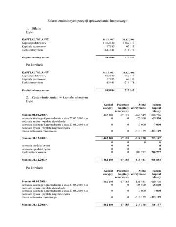 Zakres zmienionych pozycji sprawozdania finansowego: 1. Bilans Było KAPITAŁ WŁASNY Kapitał podstawowy Kapitały rezerwowe Zyski zatrzymane 31.12.2007 31.12.2006 1 462 140 67 185 -613 441 1 462 140 67 185 -814 178 Kapitał własny razem 915 884 715 147 KAPITAŁ WŁASNY Kapitał podstawowy Kapitały rezerwowe Zyski zatrzymane 31.12.2007 31.12.2006 862 140 67 185 -13 441 862 140 67 185 -214 178 Kapitał własny razem 915 884 715 147 Po korekcie 2. Zestawienie zmian w kapitale własnym Było Kapitał akcyjny Pozostałe Zyski kapitały zatrzymane rezerwowe Razem kapitał własny Stan na 01.01.2006r. uchwała Walnego Zgromadzenia z dnia 27.05.2006 r. o podziale zysku - wypłata dywidendy uchwała Walnego Zgromadzenia z dnia 27.05.2006 r. o podziale zysku - wypłata nagród z zysku Strata netto roku obrotowego 1 462 140 0 67 185 0 -468 549 -25 500 1 060 776 -25 500 0 0 -7 000 -7 000 0 0 -313 129 -313 129 Stan na 31.12.2006r. 1 462 140 67 185 -814 178 715 147 0 0 0 0 0 0 0 0 0 200 737 0 0 0 200 737 1 462 140 67 185 -613 441 915 884 Pozostałe Zyski kapitały zatrzymane rezerwowe Razem kapitał własny uchwała -podział zysku uchwała - podział zysku Zysk netto w okresie Stan na 31.12.2007r Po korekcie Kapitał akcyjny Stan na 01.01.2006r. uchwała Walnego Zgromadzenia z dnia 27.05.2006 r. o podziale zysku - wypłata dywidendy uchwała Walnego Zgromadzenia z dnia 27.05.2006 r. o podziale zysku - wypłata nagród z zysku Strata netto roku obrotowego 862 140 0 67 185 0 131 451 -25 500 1 060 776 -25 500 0 0 -7 000 -7 000 0 0 -313 129 -313 129 Stan na 31.12.2006r. 862 140 67 185 -214 178 715 147 0 0 0 0 0 0 0 0 200 737 0 0 0 200 737 862 140 67 185 -13 441 915 884 uchwała -podział zysku uchwała - podział zysku Zysk netto w okresie Stan na 31.12.2007r 3. Nota 17. Kapitał zakładowy Było 31.12.2007 31.12.2006 Wartość na początek okresu, a w tym: - kapitał w wartości nominalnej (zarejestrowany) 750 000 750 000 - przeszacowanie kapitału w związku z hiperinflacją (nota 5.3) 712 140 712 140 1 462 140 1 462 140 1 462 140 1 462 140 Zmiany kapitału w okresie Wartość a koniec okresu Po korekcie Wartość na początek okresu, a w tym: - kapitał w wartości nominalnej (zarejestrowany) - przeszacowanie kapitału w związku z hiperinflacją (nota 5.3) 31.12.2007 31.12.2006 750 000 112 140 750 000 112 140 862 140 862 140 862 140 862 140 Zmiany kapitału w okresie Wartość a koniec okresu 4. Nota 18 a). Pozostałe kapitały. Zyski zatrzymane Było 31.12.2007 31.12.2006 Zyski zatrzymane, w tym: Kapitał zapasowy Przeszacowanie hiperinflacyjne kapitału zapasowego -613 441 229 840 291 035 -814 178 229 840 291 035 Łączna kwota korekt Wynik lat ubiegłych Wynik finansowy netto bieżącego okresu -954 628 -380 425 200 737 -954 628 -67 296 -313 129 Po korekcie 31.12.2007 31.12.2006 Zyski zatrzymane, w tym: Kapitał zapasowy Przeszacowanie hiperinflacyjne kapitału zapasowego -13 441 229 840 45 829 -214 178 229 840 45 829 Łączna kwota korekt Wynik lat ubiegłych Wynik finansowy netto bieżącego okresu -109 422 -380 425 200 737 -109 422 -67 296 -313 129 0 5. Nota 18. c) Pozostałe kapitały ograniczenia związane z kapitałem Było (…)Efekt przeliczenia tego wkładu w wysokości 291 035 tys. zł ujęto w ogólnej grupie korekt związanych z przejściem na MSR/MSSF (przeszacowanie hiperinflacyjne nie ma wpływu na łączną wartość kapitałów własnych Spółki). Po korekcie (…)Efekt przeliczenia tego wkładu w wysokości 45 829 tys. zł ujęto w ogólnej grupie korekt związanych z przejściem na MSR/MSSF (przeszacowanie hiperinflacyjne nie ma wpływu na łączną wartość kapitałów własnych Spółki).