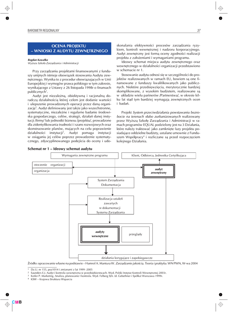 BAROMETR REGIONALNY OCENA PROJEKTU – WNIOSKI Z AUDYTU ZEWNÊTRZNEGO Bogdan Kawa³ko Wy¿sza Szko³a Zarz¹dzania i Administracji Przy zarz¹dzaniu projektami finansowanymi z funduszy unijnych istnieje obowi¹zek stosowania Audytu zewnêtrznego. Wynika to z procedur obowi¹zuj¹cych w Unii Europejskiej i wymogów prawa polskiego w tym zakresie, wynikaj¹cego z Ustawy z 26 listopada 1998r o finansach publicznych1. Audyt jest niezale¿n¹, obiektywn¹ i racjonaln¹ doradcz¹ dzia³alnoœci¹ której celem jest dodanie wartoœci i ulepszenie prowadzonych operacji przez dan¹ organizacjê2. Audyt definiowany jest tak¿e jako wszechstronne, systematyczne, niezale¿ne i regularne badanie œrodowiska gospodarczego, celów, strategii, dzia³añ danej instytucji /firmy/ lub jednostki biznesu /projektu/, prowadzone dla zidentyfikowania trudnoœci i szans rozwojowych oraz skonstruowanie planów, maj¹cych na celu poprawienie dzia³alnoœci instytucji3. Audyt pomaga instytucji w osi¹ganiu jej celów poprzez prowadzenie systematycznego, zdyscyplinowanego podejœcia do oceny i udo- 37 skonalania efektywnoœci procesów zarz¹dzania ryzykiem, kontroli wewnêtrznej i nadzoru korporacyjnego. Audyt zewnêtrzny jest form¹ oceny zgodnoœci realizacji projektu z za³o¿eniami i wymaganiami programu. Ideowy schemat miejsca audytu zewnêtrznego oraz wewnêtrznego w dzia³alnoœci organizacji przedstawiono w schemacie nr 1. Stosowanie audytu odnosi siê w szczególnoœci do projektów realizowanych w ramach EU, bowiem s¹ one finansowane z funduszy kwalifikowanych jako publicznych. Niektóre przedsiêwziêcia, merytorycznie bardziej skomplikowane, z wysokim bud¿etem, realizowane s¹ w uk³adzie wielu partnerów /Partnerstwa/, w okresie kilku lat st¹d tym bardziej wymagaj¹ zewnêtrznych ocen i badañ. Projekt System przeciwdzia³ania powstawaniu bezrobocie na terenach s³abo zurbanizowanych realizowany przez Wy¿sz¹ Szko³ê Zarz¹dzania i Administracji w ramach programów EQUAL podzielony jest na 3 Dzia³ania, które nale¿y traktowaæ jako zamkniête fazy projektu posiadaj¹ce oddzielne bud¿ety, ustalane umownie z Funduszem Wspó³pracy4 i rozliczane s¹ przed rozpoczêciem kolejnego Dzia³ania. Schemat nr 1 – Ideowy schemat audytu ród³o: opracowanie w³asne na podstawie – Hamrol A. Mantura W. Zarz¹dzanie jakoœci¹. Teoria i praktyka. WN PWN, W-wa 2004 1 2 3 4 Dz.U. nr 155, poz1014 i zmianami z lat 1999 -2005 Saunders E.J. Audyt i kontrola wewnêtrzna w przedsiêbiorstwach. Wyd. Polski Instytut Kontroli Wewnêtrznej 2003r. Kotler P. Marketing. Analiza, planowanie I kontrola. Wyd. Felberg SJA. (d. Gebethner i Spó³ka) Warszawa 1999r. KSW – Krajowa Struktura Wsparcia 38 Pierwszy audyt z realizacji Dzia³ania I Projektu przeprowadzony zosta³ w sierpniu 2005 roku przez audytora zewnêtrznego na zlecenie Funduszu Wspó³pracy 5. W artykule zawarto i omówiono przebieg i zakres audytu, którego wyniki Partnerzy Projektu winni wykorzystaæ w realizacji Dzia³ania II Projektu. Dzia³anie I Projektu realizowane by³o w okresie 21.12.2004 r. do 30.06.2005 r. Bud¿et Dzia³ania I zaprojektowano w wysokoœci 193,4 tys. PLN i taka wielkoœæ zosta³a przyjêta przez Fundusz Wspó³pracy w umowie z Liderem Projektu tj. WSZiA w Zamoœciu. Wykorzystanie bud¿etu na zrealizowanie przyjêtych zadañ merytorycznych Dzia³ania I ostatecznie wynios³o 134,8 tys. PLN. Do przeprowadzenia prac audytowych audytor zastosowa³ specjalistyczn¹ procedurê i metodê wykorzystywan¹ przy tego typu projektach, której g³ówne za³o¿enia polega³y na: – wyró¿nieniu zagadnieñ projektu / Dzia³ania I /, nastêpnie podzieleniu zagadnieñ na problemy, dla których podano wskaŸniki okreœlaj¹ce stopieñ lub jakoœæ realizacji danego problemu. – okreœleniu odpowiedzi do ka¿dego pytania lub grupy pytañ ewaluacyjnych, oraz ustaleniu wartoœci dla poszczególnych wskaŸników a nastêpnie na podstawie analizy wielkoœci przypisanych wskaŸników, ustalenie stopnia lub jakoœci realizacji danego problemu i jego wp³ywu na realizacjê danego zagadnienia oraz ca³oœci Dzia³ania I. Przebieg procedury typowego audytu w procesie realizacji projektu przedstawia schemat nr. 2. Nr 5 - 2006 Schemat nr 2 – Audyt w procesie realizacji projektu 1.1. Za³o¿enia projektu - synteza Program EQUAL dla Regionu Projekt „System przeciwdzia³ania powstawaniu bezrobocia na terenach s³abo zurbanizowanych" swoim zasiêgiem obejmuje województwa lubelskie i podkarpackie. Jest realizowany w ramach tematu F Inicjatywy Wspólnotowej EQUAL - wspieranie zdolnoœci przystosowawczych przedsiêbiorstw i pracowników do zmian strukturalnych w gospodarce oraz wykorzystania technologii informatycznych i innych nowych technologii. Ca³kowity czas realizacji programu przewidziano na lata 2005 2008. Natomiast wartoœæ finansowa projektu wynosi 2,5 min EURO. Grupê Zarz¹dzaj¹c¹, zbudowan¹ wg. tzw. metody „parasolowej" tworz¹ Wy¿sza Szko³a Zarz¹dzania i Administracji w Zamoœciu (WSZiA) - jako lider projektu oraz Wy¿sza Szko³a Informatyki i Zarz¹dzania w Rzeszowie 5 6 7 ród³o: opracowano na podstawie – Hamrol A. Mantura W. Zarz¹dzanie jakoœci¹. Teoria i praktyka. WN PWN, W-wa 2004 (WSIZ) i CASE - Doradcy sp. z o.o. w Warszawie jako partnerzy g³ówni projektu. 6 Partnerstwo na rzecz Rozwoju Partnerstwo w rozumieniu Inicjatywy Wspólnotowej EQUAL7 traktowane jest jako podejmowanie dzia³añ W artykule wykorzystano Raport z badania: Ewaluacja Dzia³ania I – Program I W EQUAL dla Polski 2004 – 2006, przeprowadzony przez audytora Krzysztofa Jaszczo³ta z Kompanii Dobrych Us³ug na zlecenie KSW - Fundusz Wspó³pracy w Warszawie, Zamoœæ, sierpieñ 2005 r. Wniosek WSZiA w Zamoœciu z³o¿ony do Funduszy Wspó³pracy o dofinansowanie Dzia³ania 1 w ramach programu operacyjnego – Program Inicjatywy Wspólnotowej EQUAL, Zamoœæ 2004 r. Inicjatywa Wspólnotowa EQUAL, Informator dla Wnioskodawców, Ministerstwo Gospodarki i Pracy,