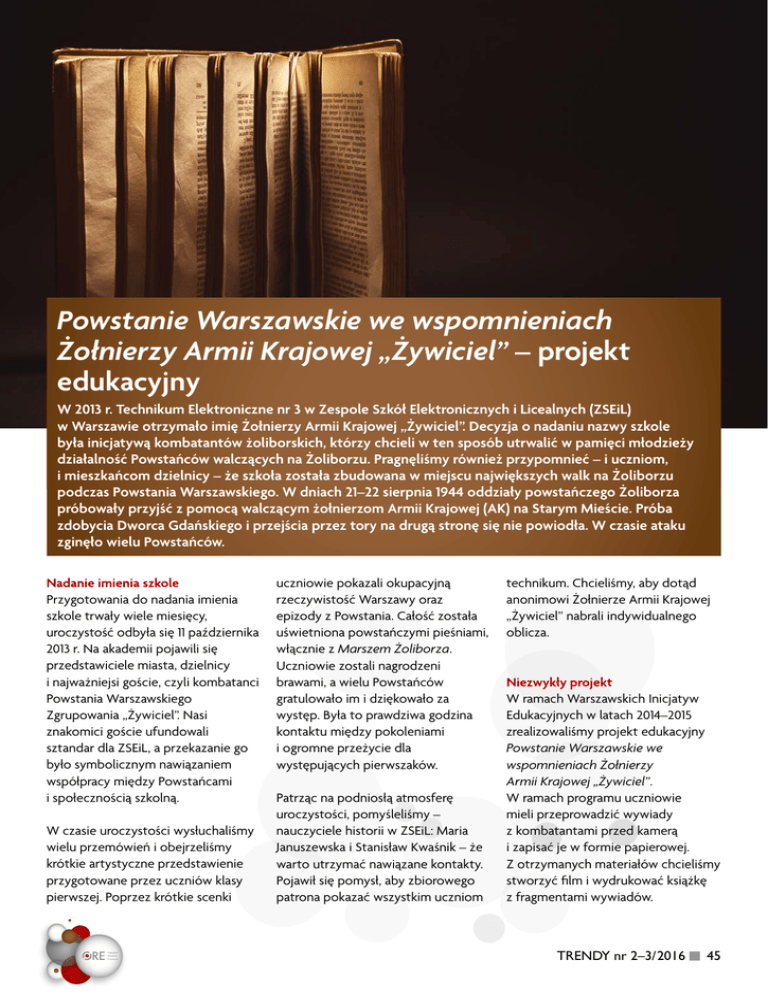 XxxxxxxxxxxxxxxxxxxxxxxxxxxxxxxxxxxxxX Powstanie Warszawskie we wspomnieniach Żołnierzy Armii Krajowej „Żywiciel” – projekt edukacyjny W 2013 r. Technikum Elektroniczne nr 3 w Zespole Szkół Elektronicznych i Licealnych (ZSEiL) w Warszawie otrzymało imię Żołnierzy Armii Krajowej „Żywiciel”. Decyzja o nadaniu nazwy szkole była inicjatywą kombatantów żoliborskich, którzy chcieli w ten sposób utrwalić w pamięci młodzieży działalność Powstańców walczących na Żoliborzu. Pragnęliśmy również przypomnieć – i uczniom, i mieszkańcom dzielnicy – że szkoła została zbudowana w miejscu największych walk na Żoliborzu podczas Powstania Warszawskiego. W dniach 21–22 sierpnia 1944 oddziały powstańczego Żoliborza próbowały przyjść z pomocą walczącym żołnierzom Armii Krajowej (AK) na Starym Mieście. Próba zdobycia Dworca Gdańskiego i przejścia przez tory na drugą stronę się nie powiodła. W czasie ataku zginęło wielu Powstańców. Nadanie imienia szkole Przygotowania do nadania imienia szkole trwały wiele miesięcy, uroczystość odbyła się 11 października 2013 r. Na akademii pojawili się przedstawiciele miasta, dzielnicy i najważniejsi goście, czyli kombatanci Powstania Warszawskiego Zgrupowania „Żywiciel”. Nasi znakomici goście ufundowali sztandar dla ZSEiL, a przekazanie go było symbolicznym nawiązaniem współpracy między Powstańcami i społecznością szkolną. W czasie uroczystości wysłuchaliśmy wielu przemówień i obejrzeliśmy krótkie artystyczne przedstawienie przygotowane przez uczniów klasy pierwszej. Poprzez krótkie scenki uczniowie pokazali okupacyjną rzeczywistość Warszawy oraz epizody z Powstania. Całość została uświetniona powstańczymi pieśniami, włącznie z Marszem Żoliborza. Uczniowie zostali nagrodzeni brawami, a wielu Powstańców gratulowało im i dziękowało za występ. Była to prawdziwa godzina kontaktu między pokoleniami i ogromne przeżycie dla występujących pierwszaków. Patrząc na podniosłą atmosferę uroczystości, pomyśleliśmy – nauczyciele historii w ZSEiL: Maria Januszewska i Stanisław Kwaśnik – że warto utrzymać nawiązane kontakty. Pojawił się pomysł, aby zbiorowego patrona pokazać wszystkim uczniom technikum. Chcieliśmy, aby dotąd anonimowi Żołnierze Armii Krajowej „Żywiciel” nabrali indywidualnego oblicza. Niezwykły projekt W ramach Warszawskich Inicjatyw Edukacyjnych w latach 2014–2015 zrealizowaliśmy projekt edukacyjny Powstanie Warszawskie we wspomnieniach Żołnierzy Armii Krajowej „Żywiciel”. W ramach programu uczniowie mieli przeprowadzić wywiady z kombatantami przed kamerą i zapisać je w formie papierowej. Z otrzymanych materiałów chcieliśmy stworzyć film i wydrukować książkę z fragmentami wywiadów. TRENDY nr 2–3/2016 45 Powstanie Warszawskie we wspomnieniach Żołnierzy Armii Krajowej „Żywiciel” – projekt edukacyjny doniosłego podczas Powstania nie zrobili, że może ktoś inny miał większe zasługi wojenne. Po wielu namowach na wywiad zgodziło się 18 Powstańców. I wtedy zaczęła się nasza przygoda. Uczniowie przeprowadzali wywiady według tych samych pytań. Najpierw zapytali o wiek w czasie wybuchu Powstania. To zaskoczyło ich najbardziej – okazało się, że ci starsi panowie i panie w 1944 r. mieli tyle lat co oni teraz, czyli 15, 16, 17. Po chwili płynęły barwne opowieści o czasach okupacji i potajemnym kontynuowaniu nauki, o działalności w Szarych Szeregach i kursach telegraficznych czy sanitarnych oraz bardzo często o braku zgody rodziców na potajemną działalność dzieci. Spotkania uczniów ZSEiL z Powstańcami – Żołnierzami Armii Krajowej „Żywiciel” Pomysł wydawał się dobry, jednak nie przewidzieliśmy wszystkiego. Wielu Powstańców wielokrotnie gościło w szkołach i przed uczniami wspominało swoje przeżycia, ale propozycja przeprowadzenia wywiadu przed kamerą wzbudziła w nich olbrzymi opór. Obawiali się tremy, wielu mówiło, że nic 46 TRENDY nr 2–3/2016 Znaczącą część wywiadu poświęcona była udziałowi w Powstaniu. Były relacje pełne radości, euforii, zachwytu, poczucia wolności, spełnienia po wielu latach oczekiwania na powstańczy zryw. W miarę upływu czasu zaczęły przeważać wspomnienia dotyczące goryczy porażki, braku broni, śmierci kolegów. Dla wszystkich naszych gości najsmutniejszym wydarzeniem czasów Powstania była chwila, w której usłyszeli o rozkazie poddania Żoliborza. Na moich uczniach największe wrażenie zrobiły wspomnienia osób, które przenosiły wiadomości kanałami warszawskimi, i informacja, że na miejscu naszej szkoły w czasie szturmu Dworca Gdańskiego zginął ojciec jednego z naszych mówców. Uczniowie szczególnie interesowali się działalnością poszczególnych kombatantów w Szarych Szeregach. Jeden z uczniów prowadzących wywiad jest harcerzem, więc wspólnych tematów było wiele. Wywiady były urozmaicone osobistymi pamiątkami, które nasi goście przynosili ze sobą: zdjęciami z Powstania, autentycznymi opaskami powstańczymi, dokumentami wydawanymi przez Niemców i władze powstańcze. Byliśmy pod wrażeniem wspaniałej kondycji fizycznej i niesamowitej pamięci naszych rozmówców, która przechowywała nieznane epizody z Powstania. Spotkania były długie – każda rozmowa trwała około 2 godzin. Później nastąpiły tygodnie ciężkiej pracy. Każdy wywiad został zapisany w wersji papierowej. Z treści wywiadów zostały wybrane fragmenty, które posłużyły za podstawę naszego wydawnictwa. Na kartach publikacji znajdowało się zdjęcie kombatanta i zdjęcie z czasów młodości, wybrany tekst i jego wersja w języku angielskim. Urozmaiceniem były wiersze o Powstaniu jednego z naszych bohaterów. Z kilkunastu godzin wywiadów w ciągu kilku tygodni zostały zmontowane dwa filmy. Według naszych zamierzeń film miał trwać 45 minut. Naszym celem było, aby fil