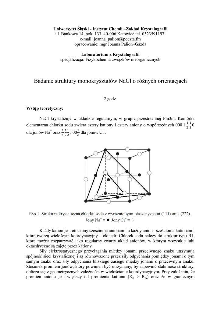 Uniwersytet Śląski - Instytut Chemii –Zakład Krystalografii ul. Bankowa 14, pok. 133, 40-006 Katowice tel. 0323591197, e-mail: [email protected] opracowanie: mgr Joanna Palion–Gazda Laboratorium z Krystalografii specjalizacja: Fizykochemia związków nieorganicznych Badanie struktury monokryształów NaCl o różnych orientacjach 2 godz. Wstęp teoretyczny: NaCl krystalizuje w układzie regularnym, w grupie przestrzennej Fm3m. Komórka elementarna chlorku sodu zwiera cztery kationy i cztery aniony o współrzędnych 000 i dla jonów Na+ oraz i 00 dla jonów Cl–. Każdy kation jest otoczony sześcioma anionami, a każdy anion– sześcioma kationami, które tworzą wielościan koordynacyjny – oktaedr. Chlorek sodu należy do struktur typu B1, którą można rozpatrywać jako regularny zwarty układ anionów, w którym wszystkie luki oktaedryczne są zajęte przez kationy. Siły elektrostatycznego przyciągania między jonami przeciwnego znaku utrzymują spójność sieci krystalicznej i są równoważone przez siły odpychania pomiędzy jonami o tym samym znaku oraz siły odpychania bliskiego zasięgu między jonami o przeciwnym znaku. Stosunek promieni jonów, który powinien być utrzymany, by zapewnić stabilność struktury, oblicza się z geometrycznych zależności w wielościanie koordynacyjnym. Przy założeniu, że promień anionu jest większy od promienia kationu (RB > RA) oraz że w granicznym przypadku aniony B stykają się ze sobą, a lukę miedzy nimi wypełnia kation A, można zapisać że: RA + RB = RB √2 RA/RB = √2 − 1 =0,41 Dlatego też, rozpatrzone ułożenie jonów w wielościanie jest stabilne, gdy : RA/RB ≥ 0,41. W strukturach w których liczba koordynacji wynosi 6, stosunek promieni jonów powinien leżeć w granicach 0,41 – 0,73. W tabeli poniżej przedstawiono niektóre związki o strukturze B1. Wśród nich są również takie, dla których RA/RB przekracza podany zakres, co może wskazywać na składową wiązań atomowych lub metalicznych. Część eksperymentalna: Sprzęt i odczynniki: ● dyfraktometr PHYWE z lampą miedziową, ● uniwersalny uchwyt do kryształów ● zestaw monokryształów chlorku sodu Wykonanie ćwiczenia Część I. Przygotowanie dyfraktometru do pracy. 1.1 Zamontować przesłonę o grubości 2mm na wyjściu promieniowania rentgenowskiego. 1.2 Ustawić goniometr w pozycji 4. 1.3 Zamocować kryształ NaCl o odpowiedniej orientacji w komorze eksperymentalnej. 1.4 Wprowadzić następujące dane do programu: napięcie anodowe – 35kV prąd anodowy – 1mA czas zliczania – 2s krok kątowy – 0,1° kąt początkowy – 3° kąt końcowy – 55° Część II. Rejestracja widma 2.1. Nacisnąć klawisz „continue” i rozpocząć pomiar. 2.2. Zarejestrować widmo (zmierzyć zależności i intensywności promieniowania X od kąta Bragga w zadanym przedziale kąta θ). 2.3. Po zarejestrowaniu widma zapisać widmo w pamięci komputera i w pamięciach przenośnych np. pendrive. Część III. Zadania dodatkowe 1. Korzystając z bazy Crystallography Open Database ściągnij plik .cif dla NaCl. Następnie za pomocą programu Mercury: a) wygeneruj komórkę elementarną chlorku sodu, b) określ liczbę koordynacji i wielościan koordynacyjny anionów Cl– i kationów Na+, c) wyznacz odległość pomiędzy jonami Na+ i Cl– , zaznacz ją na rysunku za pomocą komendy Picking Mode/Measure Distance, d) uzyskany obraz zapisz i dołącz do sprawozdania, e) oblicz długość wiązania między jonami Na+ i Cl– w krysztale NaCl wykorzystując następujące dane: 1 mol cząsteczek NaCl ma masę μ = 58,5 g/mol, a gęstość wynosi d = 2,16 g/cm3. Porównaj z wartością odczytaną w programie Mercury. f) wykorzystując wyliczoną w punkcie e) długość wiązania między jonami Na+ i Cl– oblicz promienie jonowe Cl– i Na+ wiedząc, że stosunek tych promieni RA/RB = 0,54. 2. Korzystając ze wzoru na czynnik struktury dla struktur centrosymetrycznych obliczyć wartości czynników struktury dla kilkunastu refleksów podanych w Tabeli 1. Tabela 1.